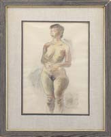 ROBERT GASTON HERBERT (American, 1873-1954) MONHEGAN CLIFFS. Watercolor coastline scene shows tall rocky cliffs near calm ocean with sailboats and seagulls. Signed lower right and dated “1920”. Housed in its original gilt gesso decorated frame with gilt liner and glass. SIZE: Sight: 15-1/2″ x 19-1/2″. CONDITION: Very good. 9-24395 (400-600)