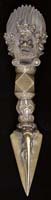 TIBETAN BUDDHIST MONK’S HORN. 19th century. The telescoping copper horn with repousse brass mounts. SIZE: (Overall) 68″l. PROVENANCE: From a fine New Jersey home. CONDITION: The mouthpiece with dents and losses, with burnished surfaces, some solder repairs, with dents overall. Otherwise good. 9-24586 (300-500)