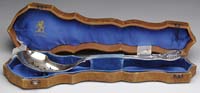 OVAL GILT METAL ENGRAVED CASE. Chinese, 19th century. Engraved overall with phoenixes and chih lung, joined to a silk cord decorated with a Peking glass double gourd form bead. SIZE: Box: 4-3/4″ l x 1-5/8″ w. CONDITION: Box structurally very good. Missing small cabochon. 9-24201-1 (200-300)