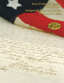 This remarkable sale also made history with its once-in-a-lifetime offerings of antique archival materials, ephemera, and items associated with important people, places, and things. Four massive hand drawn and painted planning maps used by Morton L. Deyo, a World War II hero who commanded naval gunfire support at Utah Beach in the Normandy invasion – amongst other notable accomplishments – was estimated at $800-1,200 and sold for $7,620. A “Barbary Pirate” flintlock pistol from the Stephen Decatur estate shot to $18,150 on its $1,000-2,000 estimate. Decatur led successful naval battles in both Barbary Wars, North Africa, the French Quasi War, and the War of 1812; family legend holds this pistol was a souvenir from the Barbary Coast wars. A solid gold Tiffany presentation snuff box presented by the citizens of Buffalo to Lt. John Worden made $48,400. Worden was the hero of the Victory of the Monitor Over the Merrimac. This handsomely decorated box is engraved with the battle scene between the U.S. Navy Ironclad “Monitor” and the Confederate Navy Ironclad “C.S.S. Virginia” (Merrimac), as well as other naval themes. Our catalogers noted that this is one of the most important American Civil War U.S. Navy artifacts to be presented for public auction. And a wonderful time capsule text, “Manuscript Rules And Regulations of USS Congress And USS Constitution, 1817-1821” cruised to $62,920 on its $15,000-25,000 estimate.