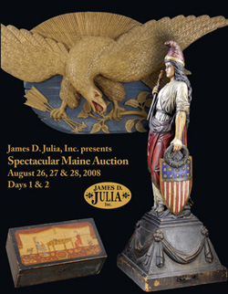 Fine antiques from a wide array of specialty categories tempted collectors throughout this two day event. A cast iron “The Yankee Schoolmaster” (also known as “The Alphabet Man”) made $25,410. This toy was designed as an early educational vehicle to teach children the alphabet or various words; only a handful of these elaborately constructed rarities survived over the past 100+ years. A pair of massive, engraved walrus tusks signed by artist Nathaniel Finney blew away their $6,000-8,000 estimate to sell for $91,960. These c.1870 tusks are illustrated with vignettes of popular actors who worked in San Francisco during the 1860s-1870s, and include the founding members of the California Troup of Actors associated with the California Theatre. An outstanding solid gold Russian hinged box decorated with a micro mosaic top closed the deal at $50,820 on its $4,000-6,000 estimate. Its 2″ x 3″ scene shows a man on a horse crossing a river with others following, while women are seen on foreground with soldiers. And an important carved and polychrome painted tobacconist figure of Native American man, attributed to Thomas Brooks, was on fire… eventually realizing $26,015. This truly outstanding example has provenance to Danbury, Connecticut by descent to its current owner and was featured on a 1/2 page in color in National Geographic Magazine, September 1931, vol. LX, number three, illustration VII.