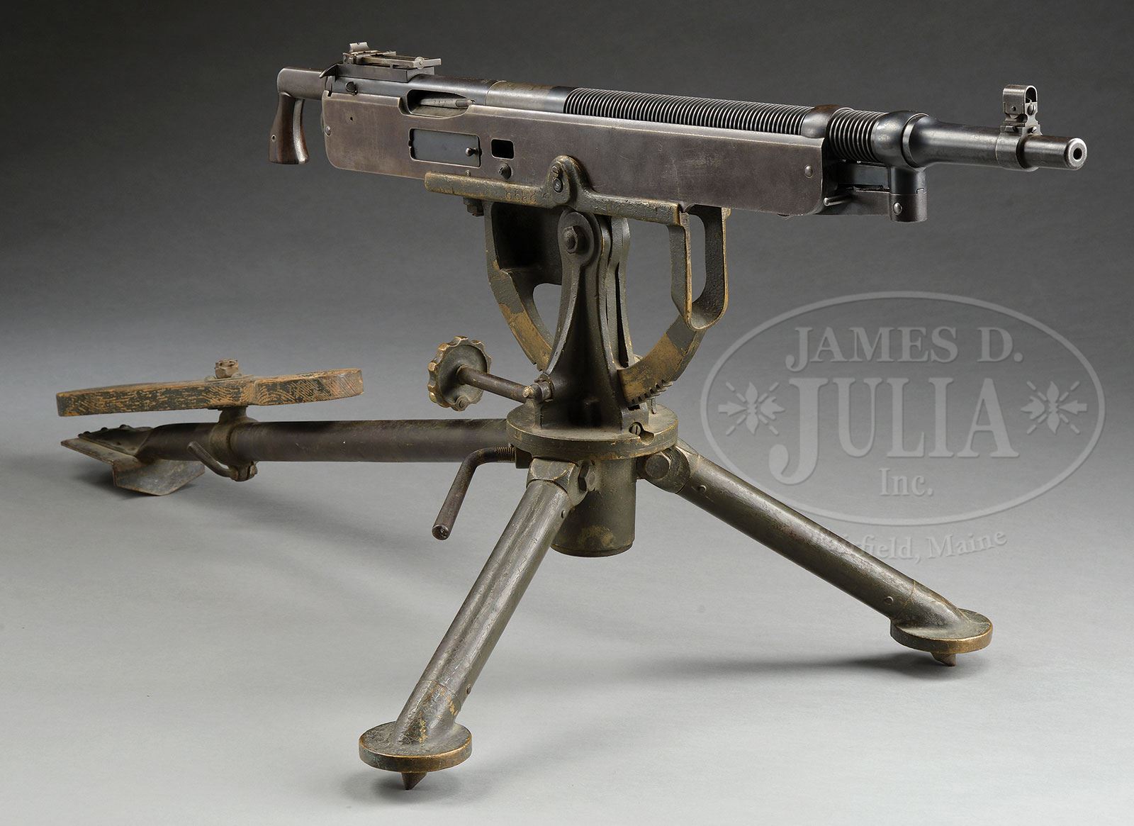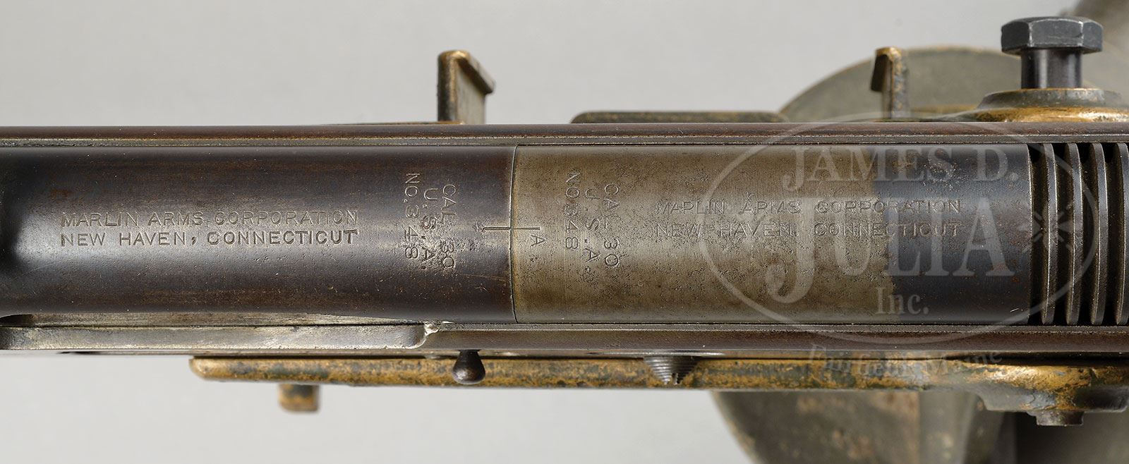 **MARLIN 1897 POTATO DIGGER (C&R).SN 348. 30-06 Cal. 28″ bbl. This Marlin 1897 potato digger comes on a brass tripod with WWII era mounting nut. Marked on top of receiver as well as on matching bbl “MARLIN ARMS CORPORATION NEW HAVEN, CONNECTICUT CAL-30 U.S.A.”. Parts appear to be matching throughout. Mechanism functions smoothly when operated by hand. Rotary belt feed and feed lever articulate properly. This weapon appears fully functional. PROVENANCE: The class III weapons formerly on loan to Evergreen Aviation & Space Museum. CONDITION: Overall finish and appearance is very good with about 50% coverage mostly on front of bbl and top of receiver. Blueing is thin to bare metal on both sides of receiver with a pleasing light brown patina. Wooden hand grip has some dings and wear but is complete and serviceable. Tripod retains 90% of its dark green paint on steel metal surfaces. Rest of carriage retains about 60% coverage with handsome bare brass where gun fits on. Wooden hardware is complete and serviceable with no cracks and retains about 5% of its green paint. Action is very smooth on this digger and gas port is clean. Bore is shiny and bright with strong rifling. Bolt face is extremely fine. This would be a great addition to the collection of a WWI enthusiast who wants to shoot their guns as well as display them. 4-51792 JWK8 (15,000-20,000) – Lot 1000