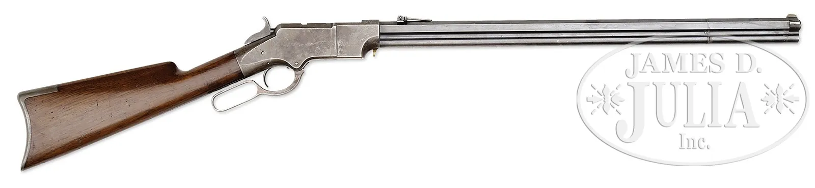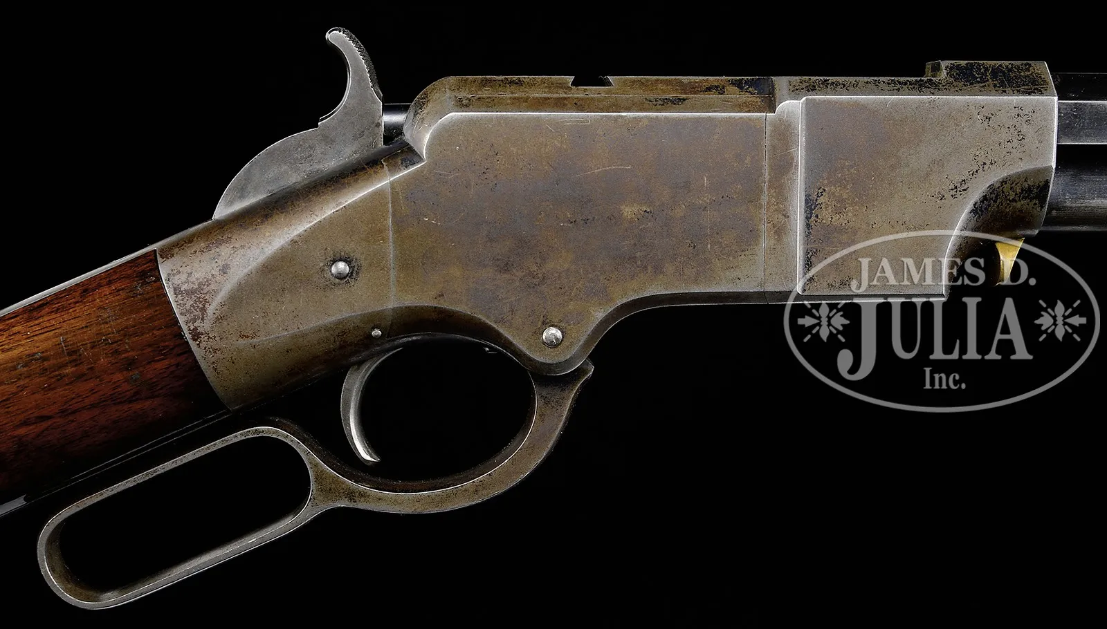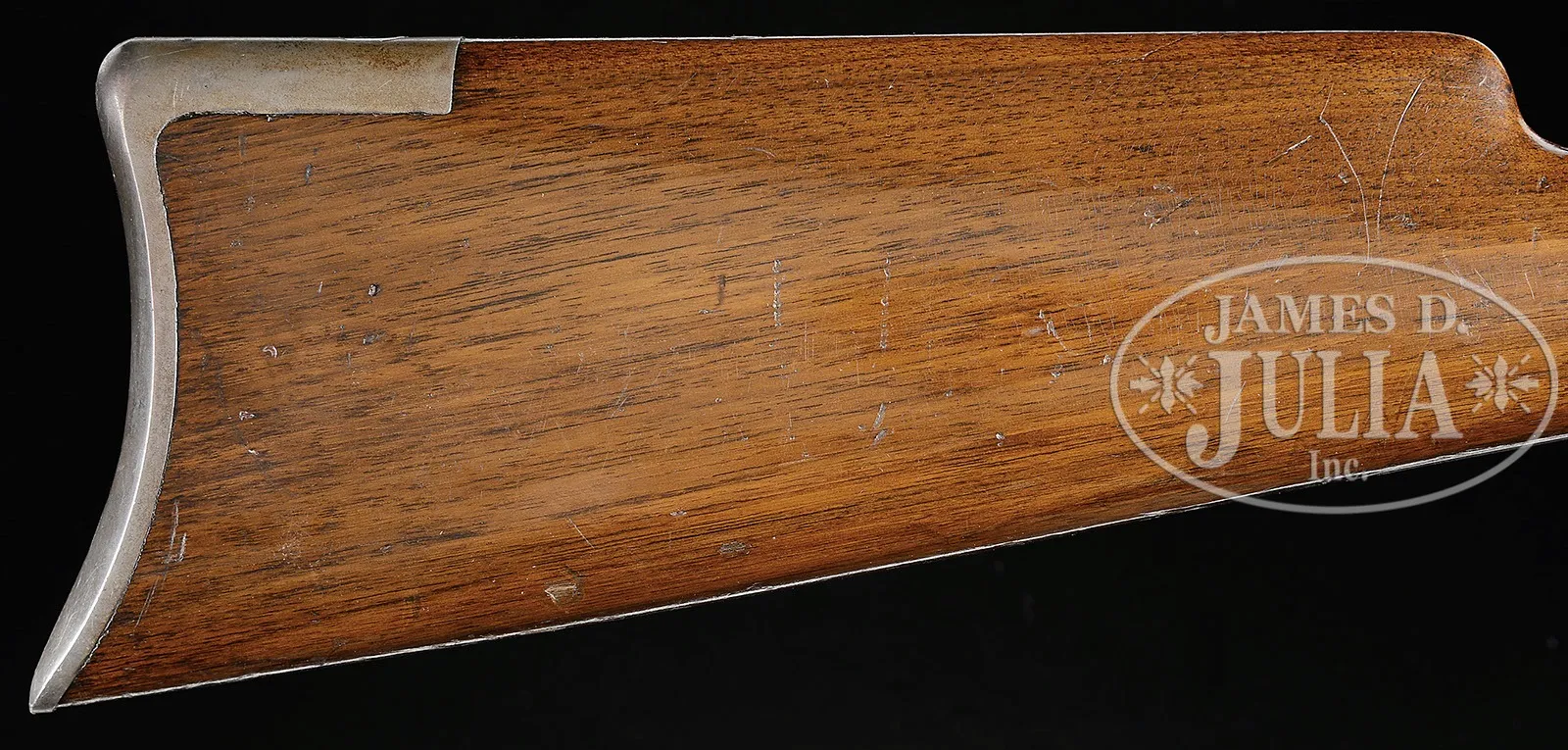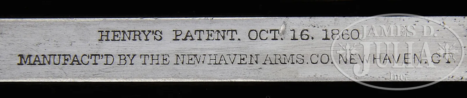 EXTREMELY RARE IRON FRAME MODEL 1860 HENRY LEVER ACTION RIFLE.SN 90. Cal. 44 RF Henry. Fine iron frame Henry with 24-1/4″ oct bbl that has integral magazine, early round top German silver front sight and an orig 1000 yard Henry ladder rear sight without stop screw. Top flat of receiver has an additional sight seat. Mounted with uncheckered straight grain American walnut buttstock that has straight grip and first type iron buttplate with round heel and large trap containing a 4-pc iron & hickory cleaning rod. This rifle has all the attributes of early Henrys with the first type round top German silver front sight, small bbl address, sharp radius on top rear edge of receiver, deep radius on bottom front edge of receiver, small loop finger lever without latch, small trigger pin, a slight perch belly stock and the round heel on the buttplate. According to the book The Henry Rifle, Quick, there were fewer than 400 iron frame Henrys produced with the highest number known being “355”. At the writing of this book, March 2008, Mr. Quick reported that there were only 89 known iron frame rifles, 16 of which had duplicate serial numbers with brass frames. SN was observed in the usual places, on top bbl flat between rear sight & receiver, left side of lower tang under the wood, inside top tang channel of buttstock and inside buttplate tang. Round part of bbl under loading sleeve has assembly number “183” with matching number on rear face of loading sleeve. This exact rifle, identified by SN, is pictured on pg 30 of The Henry Rifle, Quick with credit to the Tommy Rholes Collection. PROVENANCE: Tommy Rholes Estate Collection. CONDITION: Very fine, all matching including all stock & buttplate screws. Bbl & magazine tube retain 75-80% glossy orig blue with sharp edge wear on oct part with some scattered chemical spotting and wear on magazine tube at the carry point; receiver retains about 10% flaked orig blue with the balance having flaked to a medium gray/brown patina; hammer retains moderately faded case colors and the lever mostly a gray patina. Wood is sound with a few light nicks & scratches and overall retains about 90% strong orig varnish. Mechanics are crisp, bright shiny bore. Cleaning rod has had the jag tip altered, otherwise is fine. 4-50616 JR7 (100,000-200,000) – Lot 1002 – test