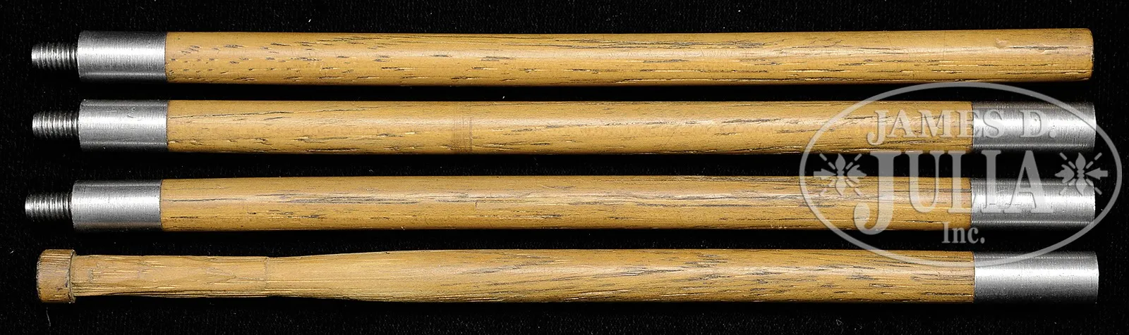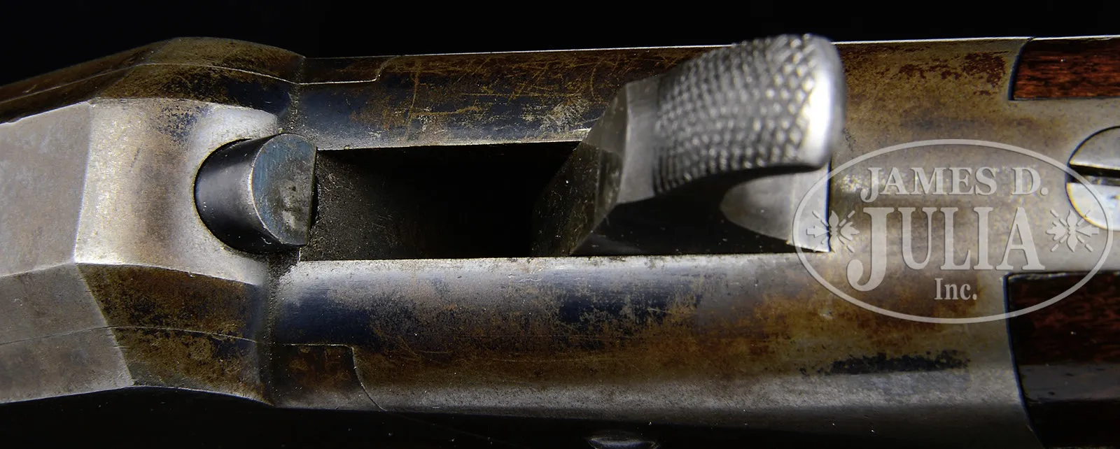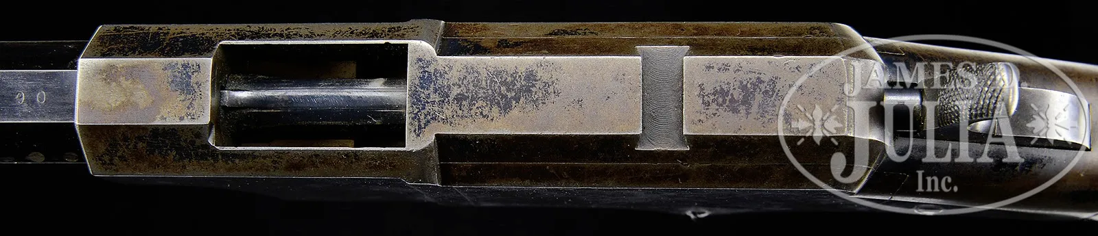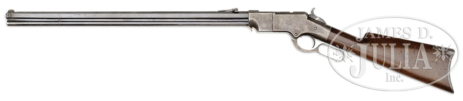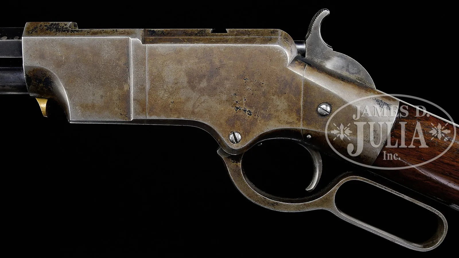 EXTREMELY RARE IRON FRAME MODEL 1860 HENRY LEVER ACTION RIFLE.SN 90. Cal. 44 RF Henry. Fine iron frame Henry with 24-1/4″ oct bbl that has integral magazine, early round top German silver front sight and an orig 1000 yard Henry ladder rear sight without stop screw. Top flat of receiver has an additional sight seat. Mounted with uncheckered straight grain American walnut buttstock that has straight grip and first type iron buttplate with round heel and large trap containing a 4-pc iron & hickory cleaning rod. This rifle has all the attributes of early Henrys with the first type round top German silver front sight, small bbl address, sharp radius on top rear edge of receiver, deep radius on bottom front edge of receiver, small loop finger lever without latch, small trigger pin, a slight perch belly stock and the round heel on the buttplate. According to the book The Henry Rifle, Quick, there were fewer than 400 iron frame Henrys produced with the highest number known being “355”. At the writing of this book, March 2008, Mr. Quick reported that there were only 89 known iron frame rifles, 16 of which had duplicate serial numbers with brass frames. SN was observed in the usual places, on top bbl flat between rear sight & receiver, left side of lower tang under the wood, inside top tang channel of buttstock and inside buttplate tang. Round part of bbl under loading sleeve has assembly number “183” with matching number on rear face of loading sleeve. This exact rifle, identified by SN, is pictured on pg 30 of The Henry Rifle, Quick with credit to the Tommy Rholes Collection. PROVENANCE: Tommy Rholes Estate Collection. CONDITION: Very fine, all matching including all stock & buttplate screws. Bbl & magazine tube retain 75-80% glossy orig blue with sharp edge wear on oct part with some scattered chemical spotting and wear on magazine tube at the carry point; receiver retains about 10% flaked orig blue with the balance having flaked to a medium gray/brown patina; hammer retains moderately faded case colors and the lever mostly a gray patina. Wood is sound with a few light nicks & scratches and overall retains about 90% strong orig varnish. Mechanics are crisp, bright shiny bore. Cleaning rod has had the jag tip altered, otherwise is fine. 4-50616 JR7 (100,000-200,000) – Lot 1002 – test