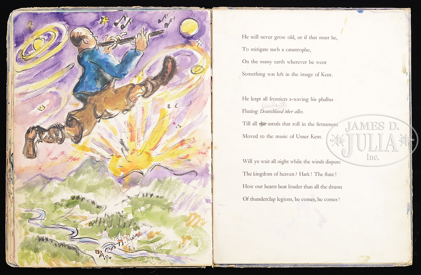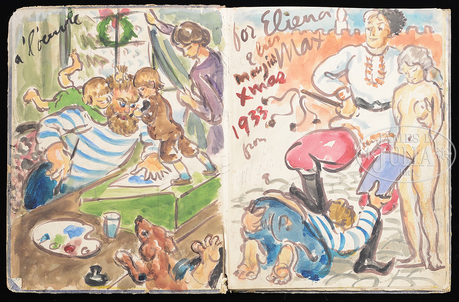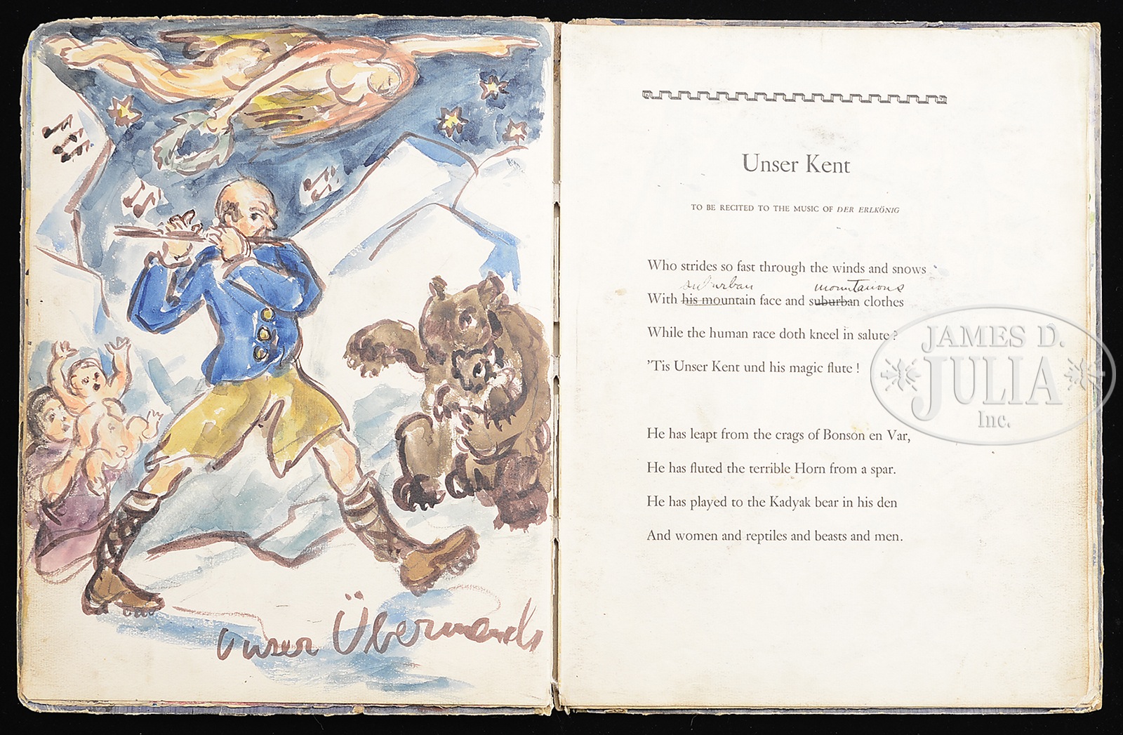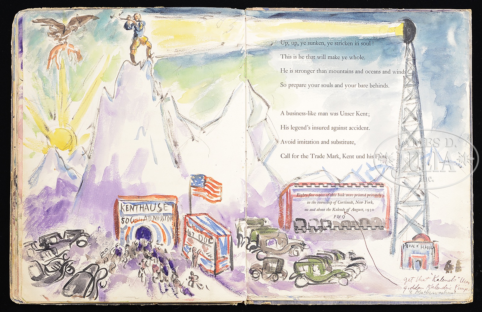 WALDO PEIRCE (American, 1884 – 1970) ORIGINAL ILLUSTRATED COPY OF THE BOOK “UNSER KENT” (FAMILY COPY).Watercolor pages and printed pages Signed on the first page and inscribed “For Eliena & her Max Merry Xmas 1933 from WP” Please Note: This book has 30 full page watercolors annotated with Waldo Peirce’s writings and poetry. The book, rare in itself, contains the pencil signed Rockwell Kent print of Waldo Peirce. The book was privately printed in 1930 SIZE: 13″ x 10″ PROVENANCE: Directly from artist, descending through the family CONDITION: Cover has extensive wear, front watercolor that affixed to cover is missing 9-93456 (4,000-6,000) – Lot 1003