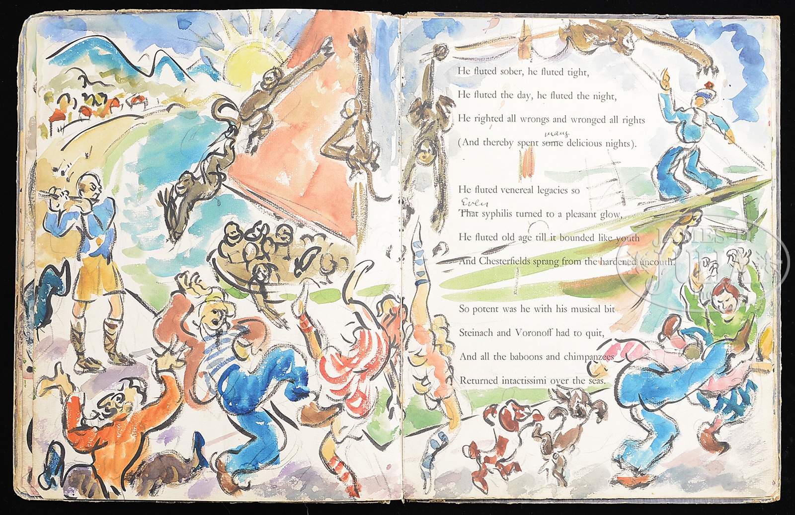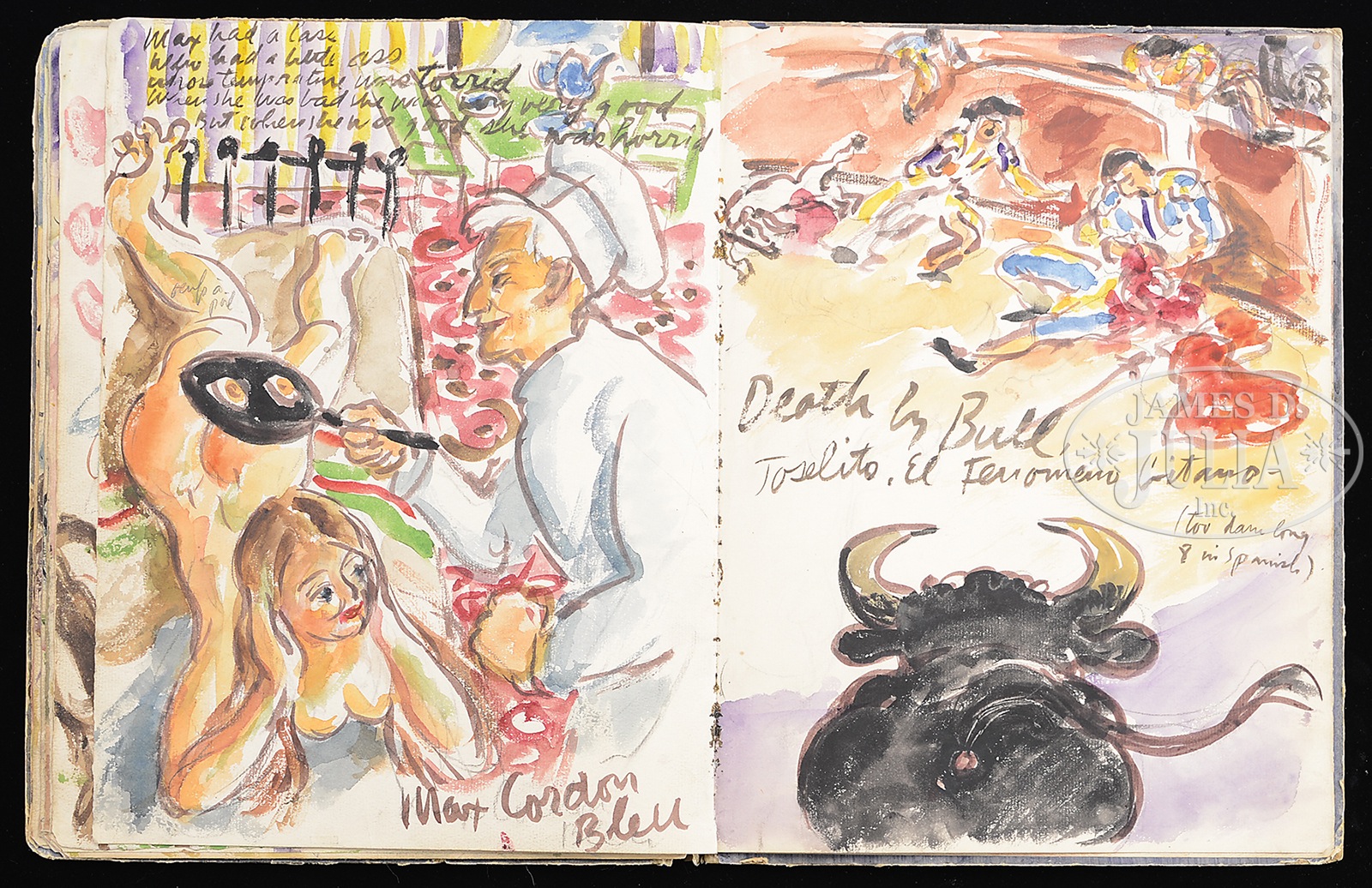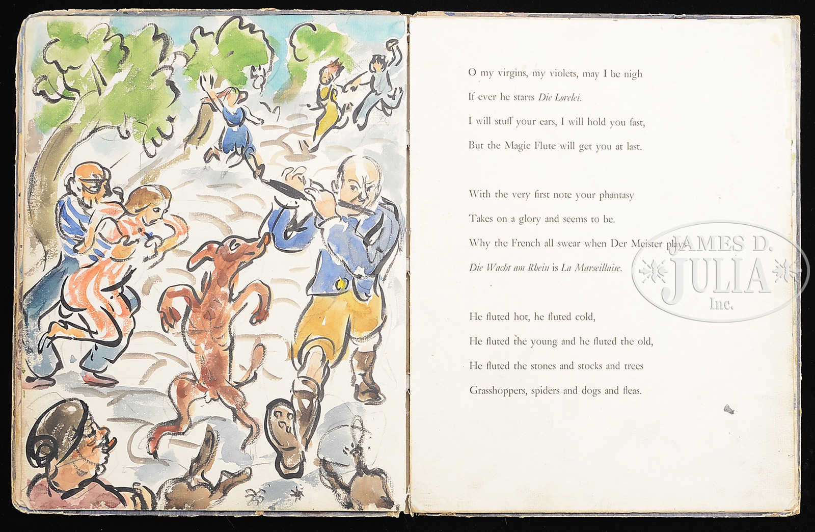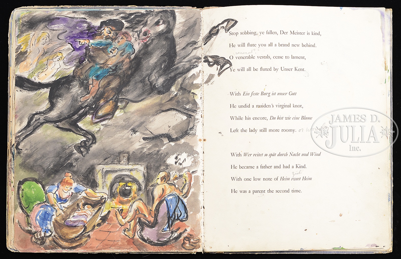 WALDO PEIRCE (American, 1884 – 1970) ORIGINAL ILLUSTRATED COPY OF THE BOOK “UNSER KENT” (FAMILY COPY).Watercolor pages and printed pages Signed on the first page and inscribed “For Eliena & her Max Merry Xmas 1933 from WP” Please Note: This book has 30 full page watercolors annotated with Waldo Peirce’s writings and poetry. The book, rare in itself, contains the pencil signed Rockwell Kent print of Waldo Peirce. The book was privately printed in 1930 SIZE: 13″ x 10″ PROVENANCE: Directly from artist, descending through the family CONDITION: Cover has extensive wear, front watercolor that affixed to cover is missing 9-93456 (4,000-6,000) – Lot 1003
