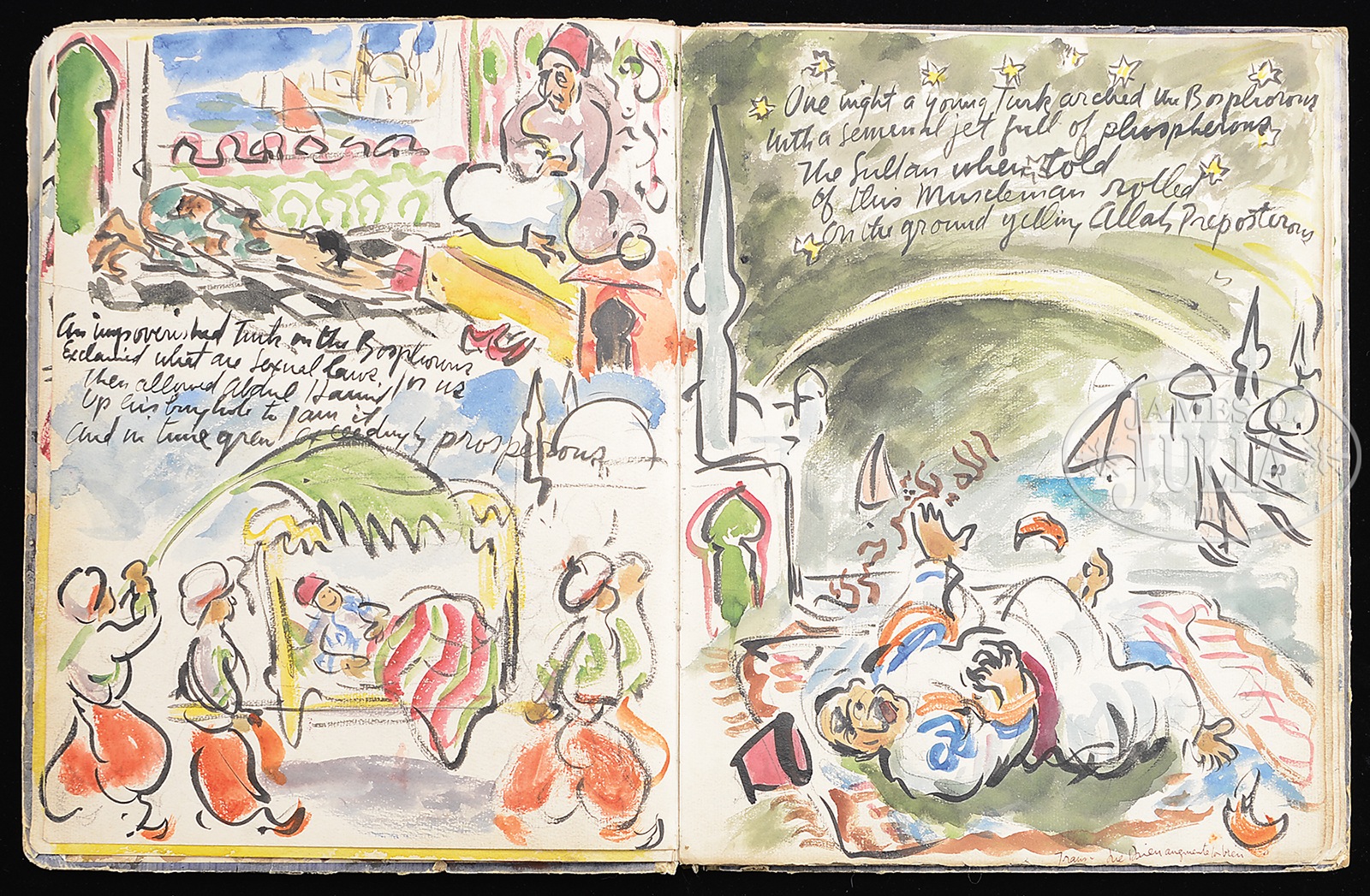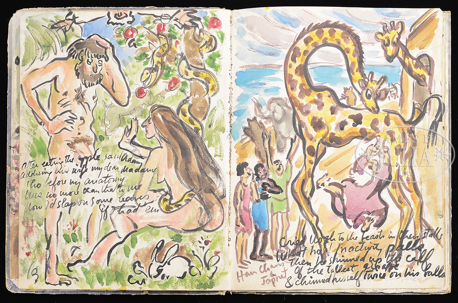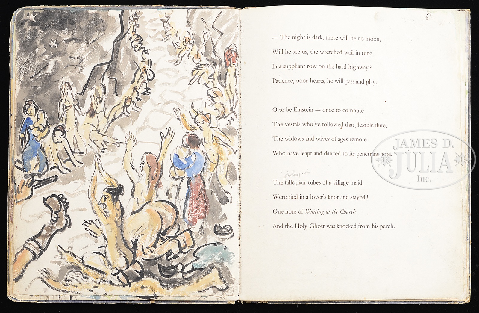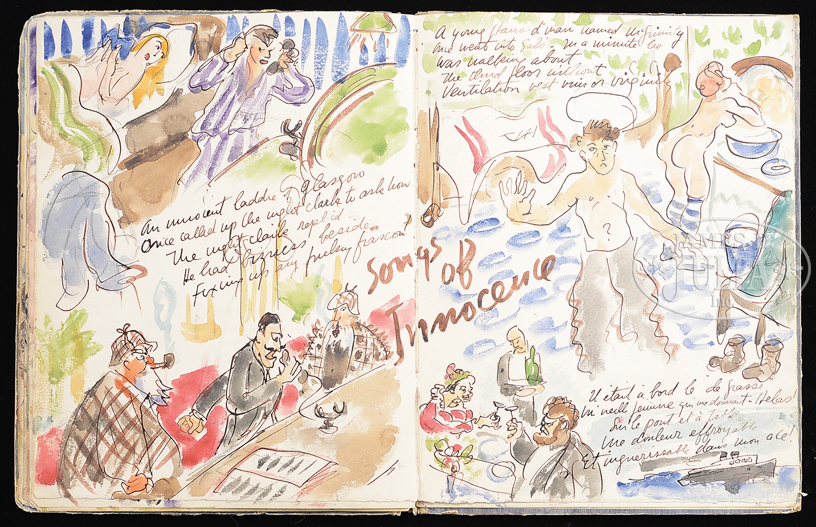 WALDO PEIRCE (American, 1884 – 1970) ORIGINAL ILLUSTRATED COPY OF THE BOOK “UNSER KENT” (FAMILY COPY).Watercolor pages and printed pages Signed on the first page and inscribed “For Eliena & her Max Merry Xmas 1933 from WP” Please Note: This book has 30 full page watercolors annotated with Waldo Peirce’s writings and poetry. The book, rare in itself, contains the pencil signed Rockwell Kent print of Waldo Peirce. The book was privately printed in 1930 SIZE: 13″ x 10″ PROVENANCE: Directly from artist, descending through the family CONDITION: Cover has extensive wear, front watercolor that affixed to cover is missing 9-93456 (4,000-6,000) – Lot 1003
