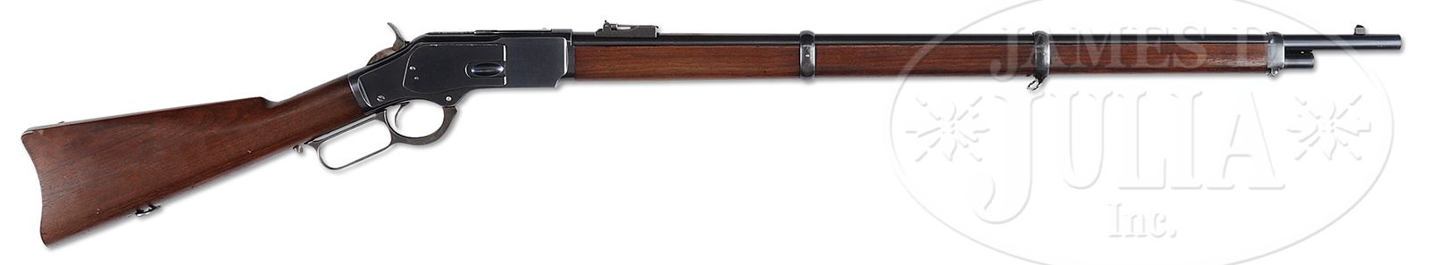 *WINCHESTER MODEL 1873 MUSKET.SN 570489 B. Cal. 44 WCF 30″ bbl, blue finish, plain oiled walnut stocks. PROVENANCE: Consignor states that musket was found in a box in a mine office out West in the early 1930’s by her father. CONDITION: Very fine overall. Bbl retains 95% bright blue finish with slight pluming and a few miniscule scratches. Bbl bands retain 90% blue with some pluming. Bore is bright with strong rifling. Receiver shows 95% blue with some pluming on the tang and slight handling marks. Little carry wear. Elevator has a small dent. Lever and hammer retain 90% case color with some staining on the bottom of the lever. Stocks are oil finished and show only minor handling marks. Some abrasion in front of middle bbl band on forestock. Buttplate retains 75% case color finish with wear at the heel. 49510-1 TEP C&R (5,000-8,000) – Lot 1004
