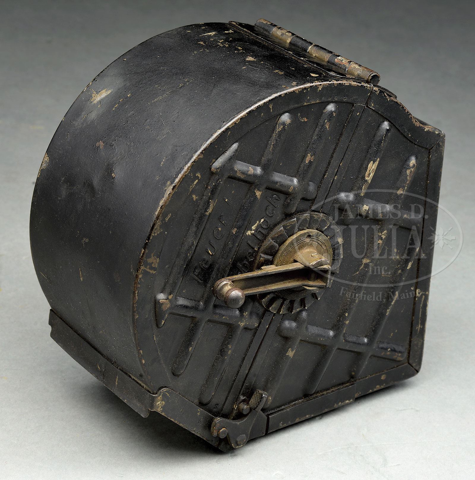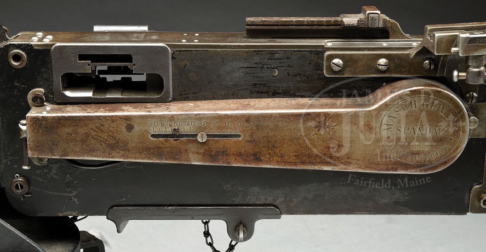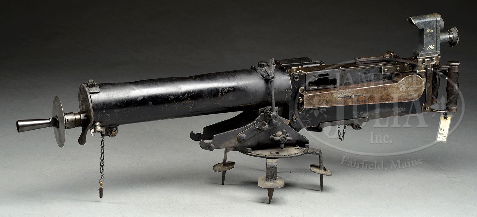 **FIRST YEAR PRODUCTION MAXIM MG 08 SPANDAU HEAVY MACHINE GUN WITH EXCEEDINGLY LOW SERIAL NUMBER 130 (C&R).SN 130. 8 mm. 28-1/2″ bbl. Maxim MG 08 manufactured in Spandau in 1908. This may be the earliest numbered MG 08 Maxim extent. Left side plate, top cover, trunnion, water jacket, optical sight bracket, cross bolt and backplate are all SN 130. Fusee cover unnumbered but marked “MASCH.GEW.08” / “SPANDAU” / “1908” / “GEWEHRFABRIK” which appears correct vintage and almost certainly came with gun from factory. Top cover bears unusual markings “M.G.08.” / “M.G.XX.” / “19.”. Feed block is marked “DWM”, is unusual and unnumbered with evidence of welding; it has been fitted with a block to retain a belt rain cover and is refinished. Belt rain/dust cover and retaining pin is included as an accessory as is one drum, a low trench mount, Eleitz Wetzlar rear optic sight and front jacket armor piece. Attached to bottom of right sideplate is mounting bracket for drum which also doubles as holder for cartridge extraction tongs which are present SN 35. Bolt is numbered 32061 with imperial German proof mark. Bbl is numbered 265 with Nazi eagle proof mark. Water fill cap and fill chain present without wooden pieces. Piston moves freely inside booster. Muzzle shield marked with crown/U proof marks and “BWB” within oval. Drain plug chain and cork present and serviceable. Oiler brushes inside handles are intact although not matching SN (94 & 34 by DWM). This gun is featured in Goldsmith’s book The Devil’s Paint Brush on pg 174. Mechanism functions smoothly when operated by hand. This weapon appears fully functional. PROVENANCE: Ex-Dolf Goldsmith collection; The class III weapons formerly on loan to Evergreen Aviation & Space Museum. CONDITION: Overall finish and appearance is very good. Left sideplate and jacket retain about 80% of a heavy black enamel paint over a blued finish on sideplate. Booster retains about 80% of a smooth blue/gray finish thinning in places. Water jacket has a patch repair 7″ from nose in 6 o’clock position, a 2 X 2-1/2″ vintage patch soldered into place. Shrapnel hole 5″ from nose at 1 o’clock position which has not been repaired. Several dents and dings in water jacket and one noticeable outward dent about size of a dime 8-1/2″ from nose at 3 o’clock position. Top cover retains about 30% of its blued finish turning to a light brown patina and quite thin in places. Fusee cover only has about 15% of its blued finish, quite thin and turned to light brown patina. Right side plate retains about 40% of its blued finish fading to gray. Optic is stenciled in white paint “289”, rubber eye cup has some damage and is petrified but present. Adjustment operates properly and optics are very clear. Belt rain/dust cover has a coat of black enamel paint, orig pin and retaining chain present and serviceable. Drum is marked “E&G” / “Feuer!” / “Kurbelhock” and is covered in a coat of black enamel paint and appears serviceable. Trench mount also has a coating of black enamel paint, retains its trunnion clamp and appears to be serviceable. Bore is shiny and bright with strong rifling. Bolt face is excellent. The evidence of battle damage and use on what is almost certainly the lowest SN operational MG 08 Maxim which is documented in Dolf Goldsmith’s book The Devil’s Paintbrush make this a historically significant machine gun and certain to be the centerpiece of the most advanced WWI collection. 4-51701 JWK23 (30,000-50,000) – Lot 1005