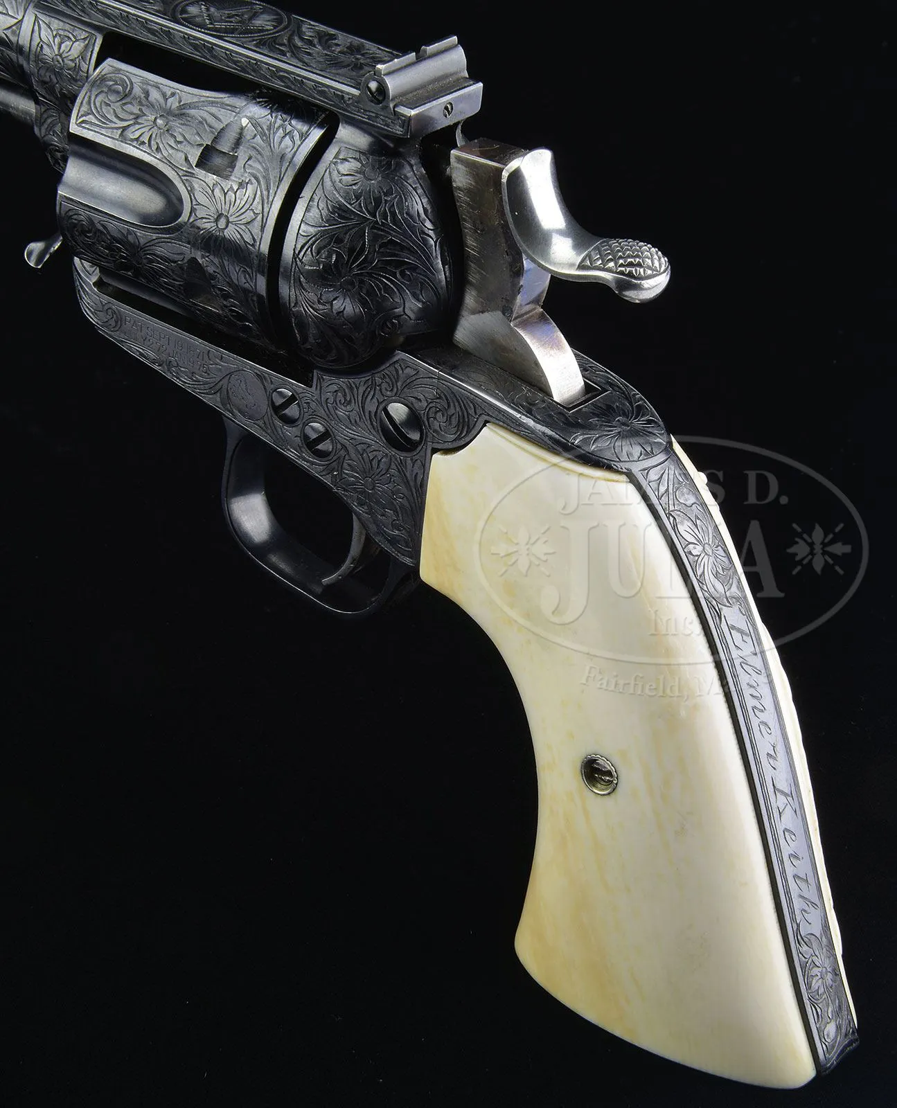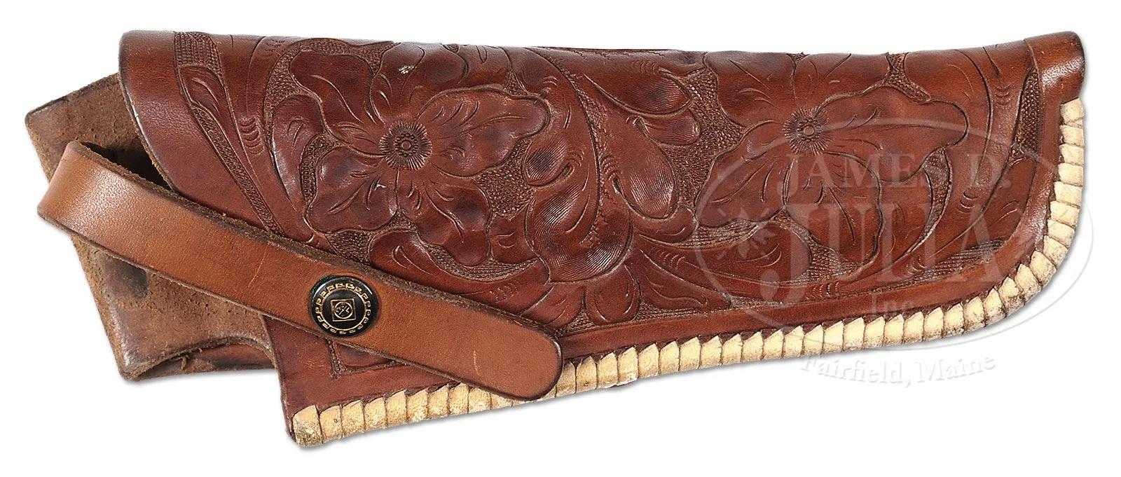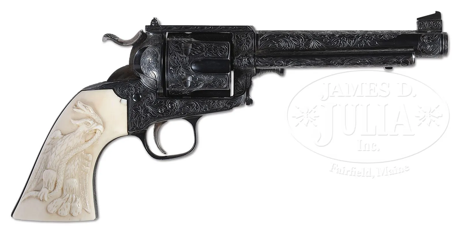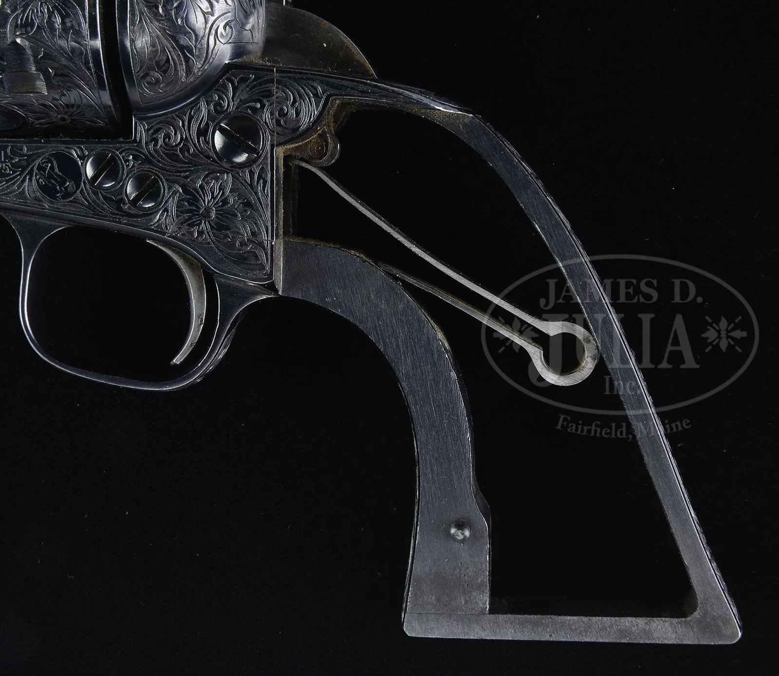 *THE MOST FAMOUS OF ALL ELMER KEITH’S HANDGUNS, COLT SINGLE ACTION ARMY REVOLVER, “THE LAST WORD – OLD NO. 5”, CUSTOM DESIGNED BY MR. KEITH & HAROLD CROFT.SN M5. Cal. .44 Special. All blue finish with 5-1/2″ bbl that has 1-line address & dual caliber markings on left side. Bore is 6 lands & grooves with left hand twist. Muzzle is fitted with a sleeve that is mounted with a Colt double action style adjustable front sight. Top strap has been reworked & redesigned into a flat top style which extends over the hammer slot and has a Colt style, windage adjustable rear sight. The base pin is of custom design that has a ribbed hourglass shaped head and is secured with a swinging latch replacing the screw or spring-loaded crossbolt and is retained by a spring-loaded detent. Hammer is Bisley style that has a widened & extended spur. The trigger is also wider & a little longer than a standard single action trigger. Backstrap is an altered Bisley part attached to a single action frontstrap/trigger guard. The hammer spring is a custom design between the originator of this design and Mr. Keith. Mounted with 2-pc pre-ban African ivory grips, custom built to fit this frame with a raised, carved Mexican eagle on right side. The orig customized single actions that led to the final development of this revolver “Old Number 5” was begun by S. Harold Croft who, having heard of Mr. Keith’s legendary long range handgun shooting skills, traveled to Durkee, Oregon with “a box full of guns” for a demonstration of Mr. Keith’s long range shooting. He was so impressed with Mr. Keith that he began working with him to re-design the single action army revolver. The No. 5 Colt was as its name suggests the fifth iteration of Harold Croft’s highly modified Colt revolvers. The first four were Croft’s designs and called “Featherweights.” After experimenting with these Elmer made final design changes to create what was in his mind the perfect revolver. The final design became No. 5, being sold here. In an April, 1929 American Rifleman article, titled “The Last Word”, Mr. Keith details the specifics surrounding the concept, and manufacture of the revolver including those who assisted on the project. In a side note, he states that the orig walrus ivory grips had shrunk, and so he had a new pair made from elephant ivory carved with a Mexican eagle which are mounted on the gun today. The engraving on this revolver was commissioned by Mr. Croft for Mr. Keith and consists of flowing foliate & floral patterns with about full coverage on the frame, bbl, cyl, frontstrap & trigger guard. Top strap is engraved with the Masonic symbol of a square & compass. Backstrap is engraved “Elmer Keith” and buttstrap is engraved “Durkee, Oregon”. This revolver is pictured on p. 103 of Mr. Keith’s book Six Guns and on p. 169 in the accompanying Keith designed Lawrence holster. Holster is beautifully tooled with a light buckstitch edge and has a thumb strap with snap. It also has Mr. Keith’s designed integral leg strap. This storied revolver has been the subject of numerous articles over the last 80 years. More recently on the cover of the May, 2003 edition of Guns & Ammo magazine. Special Note: This item contains or is made of ivory. Do not bid on this lot unless you have read and agreed to our “Ivory Position Statement” and the “Waiver of Legal and Financial Risk to James D. Julia in regards to your Purchase of an Ivory Object”. This information is located in our catalog on pages 30 and 31. PROVENANCE: The Elmer Keith Estate Collection. CONDITION: Very fine. Overall retains 96-97% strong custom blue showing holster wear & sharp edge wear. Grips are sound showing light wear on eagle and retain light ivory patina. Mechanics are crisp, bright shiny bore. Holster is crisp showing only very light wear & retains about all of its orig brown finish. This is truly a once in a lifetime opportunity to own handgun history, the iconic “Last Word” from Elmer Keith. 4-47801 JR244 (30,000-50,000) – Lot 1005 | Click here to view provenance