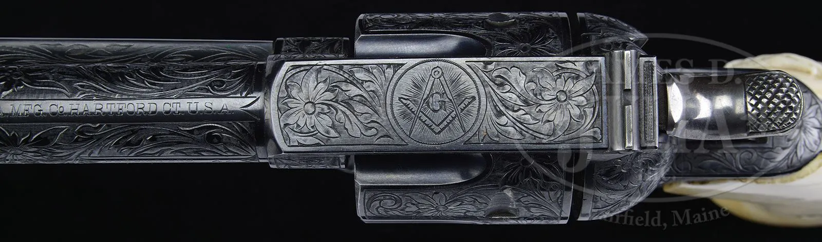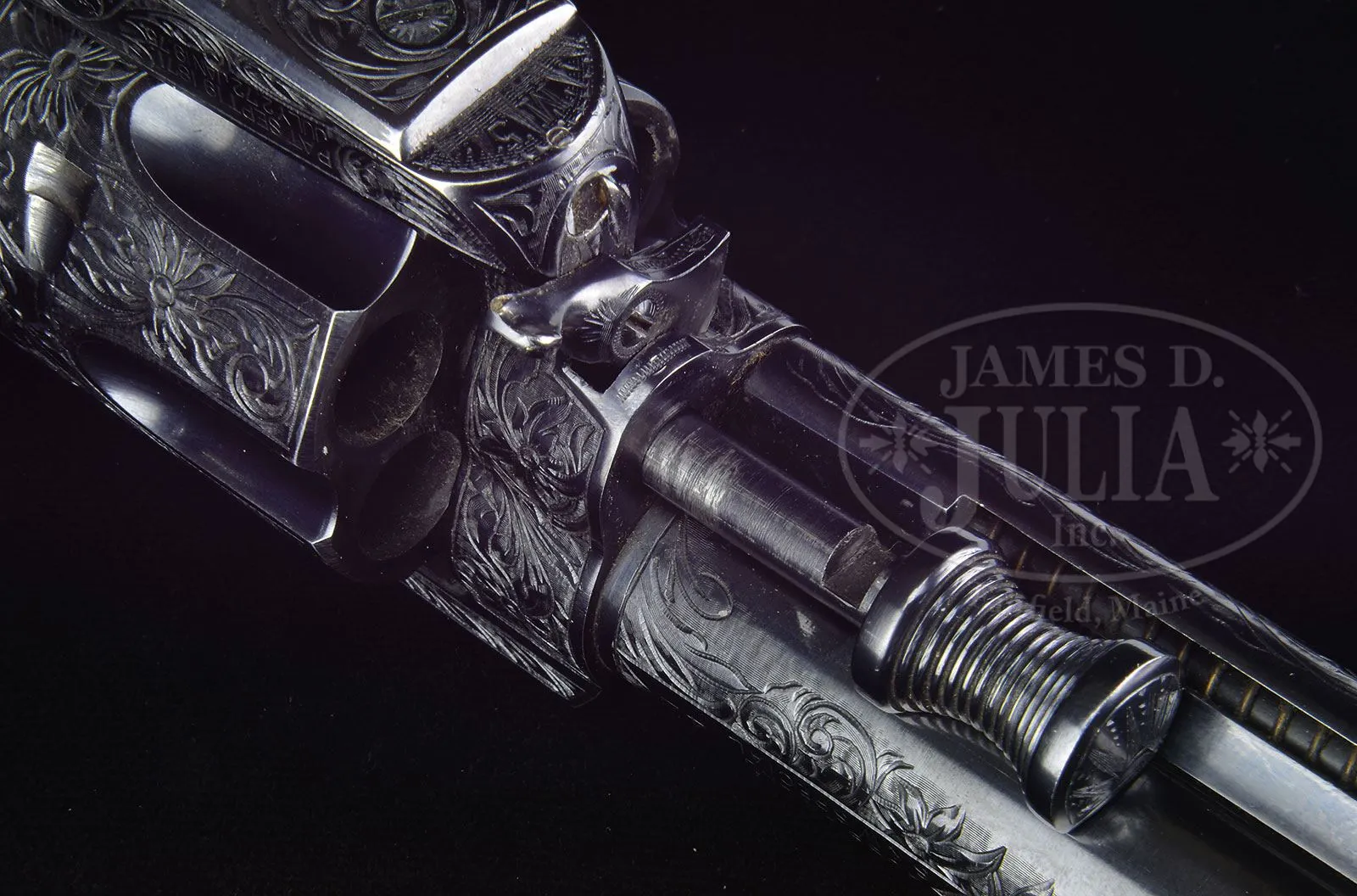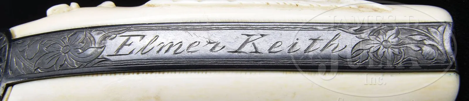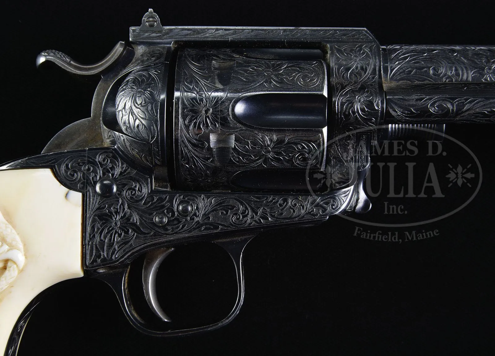 *THE MOST FAMOUS OF ALL ELMER KEITH’S HANDGUNS, COLT SINGLE ACTION ARMY REVOLVER, “THE LAST WORD – OLD NO. 5”, CUSTOM DESIGNED BY MR. KEITH & HAROLD CROFT.SN M5. Cal. .44 Special. All blue finish with 5-1/2″ bbl that has 1-line address & dual caliber markings on left side. Bore is 6 lands & grooves with left hand twist. Muzzle is fitted with a sleeve that is mounted with a Colt double action style adjustable front sight. Top strap has been reworked & redesigned into a flat top style which extends over the hammer slot and has a Colt style, windage adjustable rear sight. The base pin is of custom design that has a ribbed hourglass shaped head and is secured with a swinging latch replacing the screw or spring-loaded crossbolt and is retained by a spring-loaded detent. Hammer is Bisley style that has a widened & extended spur. The trigger is also wider & a little longer than a standard single action trigger. Backstrap is an altered Bisley part attached to a single action frontstrap/trigger guard. The hammer spring is a custom design between the originator of this design and Mr. Keith. Mounted with 2-pc pre-ban African ivory grips, custom built to fit this frame with a raised, carved Mexican eagle on right side. The orig customized single actions that led to the final development of this revolver “Old Number 5” was begun by S. Harold Croft who, having heard of Mr. Keith’s legendary long range handgun shooting skills, traveled to Durkee, Oregon with “a box full of guns” for a demonstration of Mr. Keith’s long range shooting. He was so impressed with Mr. Keith that he began working with him to re-design the single action army revolver. The No. 5 Colt was as its name suggests the fifth iteration of Harold Croft’s highly modified Colt revolvers. The first four were Croft’s designs and called “Featherweights.” After experimenting with these Elmer made final design changes to create what was in his mind the perfect revolver. The final design became No. 5, being sold here. In an April, 1929 American Rifleman article, titled “The Last Word”, Mr. Keith details the specifics surrounding the concept, and manufacture of the revolver including those who assisted on the project. In a side note, he states that the orig walrus ivory grips had shrunk, and so he had a new pair made from elephant ivory carved with a Mexican eagle which are mounted on the gun today. The engraving on this revolver was commissioned by Mr. Croft for Mr. Keith and consists of flowing foliate & floral patterns with about full coverage on the frame, bbl, cyl, frontstrap & trigger guard. Top strap is engraved with the Masonic symbol of a square & compass. Backstrap is engraved “Elmer Keith” and buttstrap is engraved “Durkee, Oregon”. This revolver is pictured on p. 103 of Mr. Keith’s book Six Guns and on p. 169 in the accompanying Keith designed Lawrence holster. Holster is beautifully tooled with a light buckstitch edge and has a thumb strap with snap. It also has Mr. Keith’s designed integral leg strap. This storied revolver has been the subject of numerous articles over the last 80 years. More recently on the cover of the May, 2003 edition of Guns & Ammo magazine. Special Note: This item contains or is made of ivory. Do not bid on this lot unless you have read and agreed to our “Ivory Position Statement” and the “Waiver of Legal and Financial Risk to James D. Julia in regards to your Purchase of an Ivory Object”. This information is located in our catalog on pages 30 and 31. PROVENANCE: The Elmer Keith Estate Collection. CONDITION: Very fine. Overall retains 96-97% strong custom blue showing holster wear & sharp edge wear. Grips are sound showing light wear on eagle and retain light ivory patina. Mechanics are crisp, bright shiny bore. Holster is crisp showing only very light wear & retains about all of its orig brown finish. This is truly a once in a lifetime opportunity to own handgun history, the iconic “Last Word” from Elmer Keith. 4-47801 JR244 (30,000-50,000) – Lot 1005 | Click here to view provenance