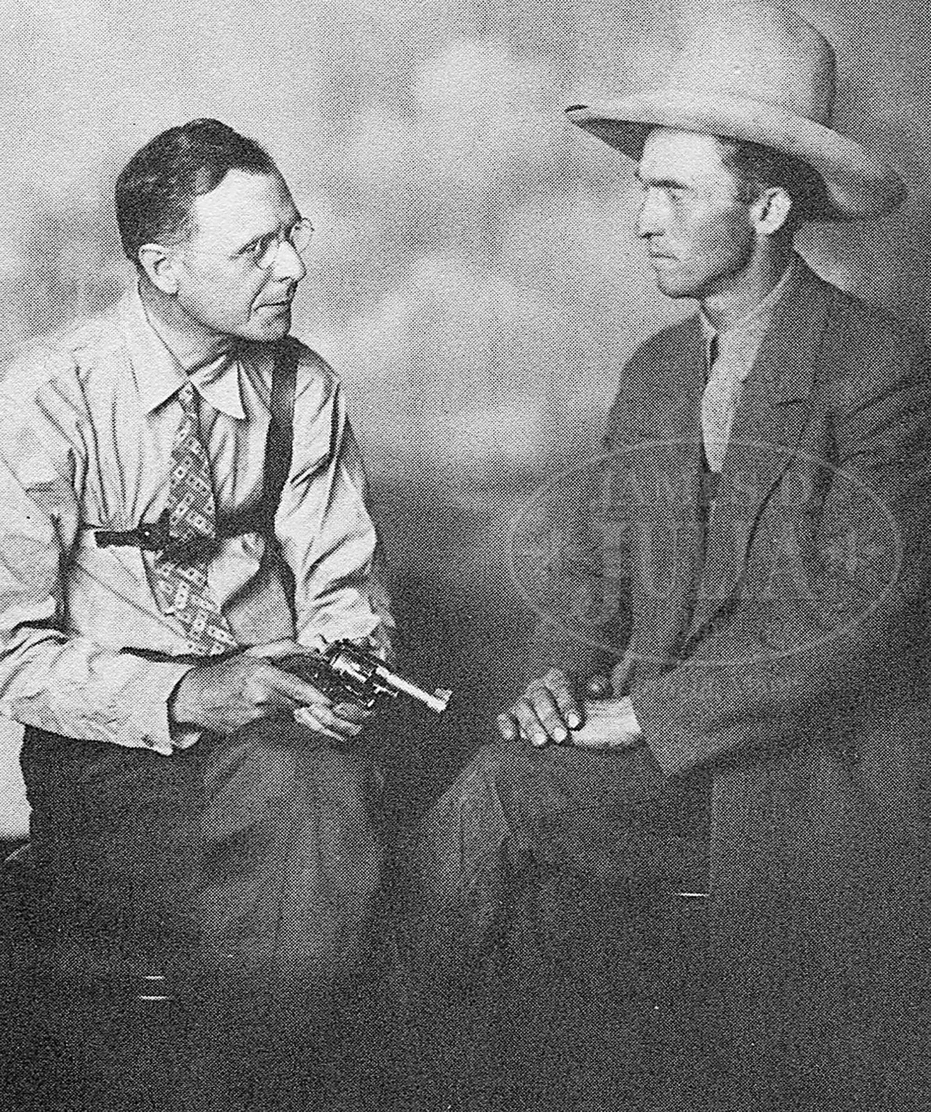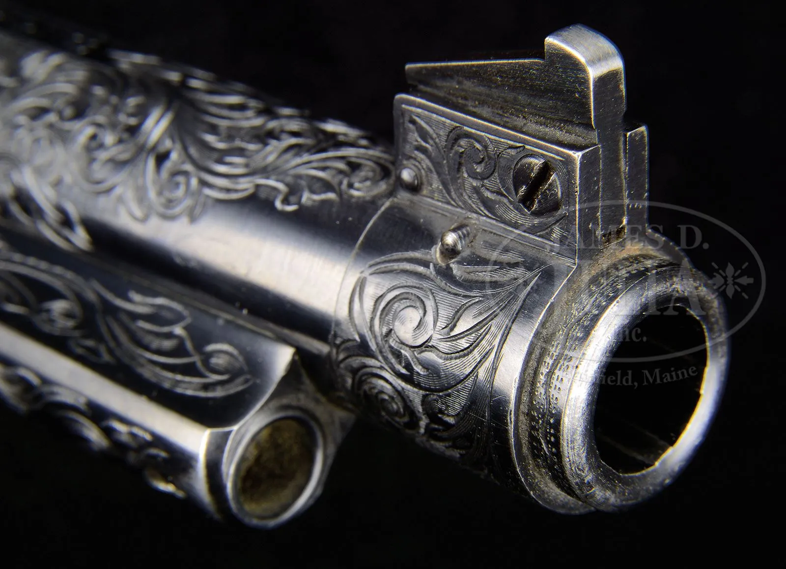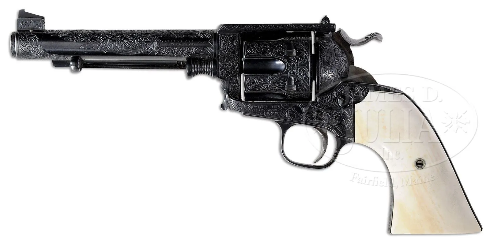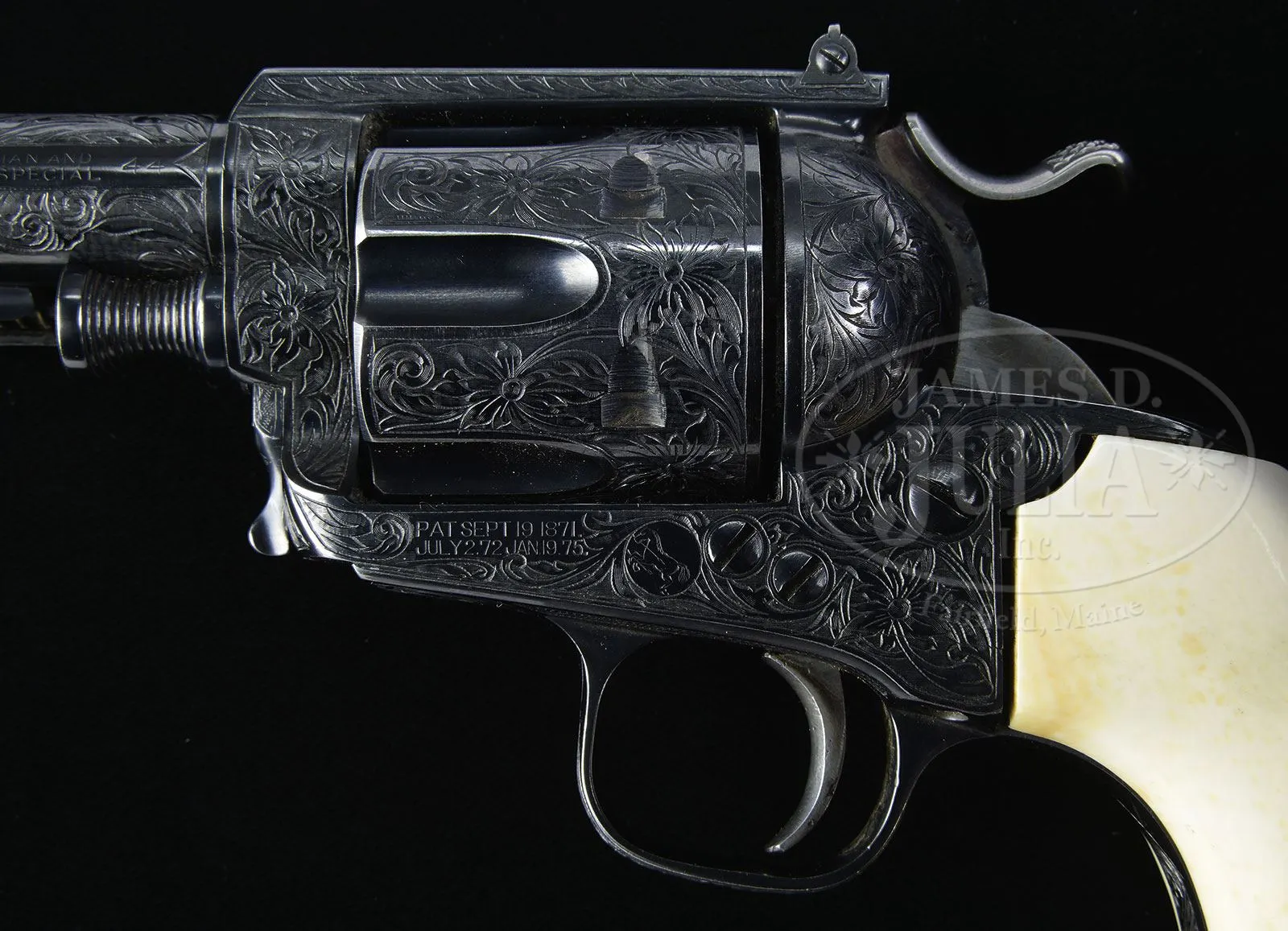 *THE MOST FAMOUS OF ALL ELMER KEITH’S HANDGUNS, COLT SINGLE ACTION ARMY REVOLVER, “THE LAST WORD – OLD NO. 5”, CUSTOM DESIGNED BY MR. KEITH & HAROLD CROFT.SN M5. Cal. .44 Special. All blue finish with 5-1/2″ bbl that has 1-line address & dual caliber markings on left side. Bore is 6 lands & grooves with left hand twist. Muzzle is fitted with a sleeve that is mounted with a Colt double action style adjustable front sight. Top strap has been reworked & redesigned into a flat top style which extends over the hammer slot and has a Colt style, windage adjustable rear sight. The base pin is of custom design that has a ribbed hourglass shaped head and is secured with a swinging latch replacing the screw or spring-loaded crossbolt and is retained by a spring-loaded detent. Hammer is Bisley style that has a widened & extended spur. The trigger is also wider & a little longer than a standard single action trigger. Backstrap is an altered Bisley part attached to a single action frontstrap/trigger guard. The hammer spring is a custom design between the originator of this design and Mr. Keith. Mounted with 2-pc pre-ban African ivory grips, custom built to fit this frame with a raised, carved Mexican eagle on right side. The orig customized single actions that led to the final development of this revolver “Old Number 5” was begun by S. Harold Croft who, having heard of Mr. Keith’s legendary long range handgun shooting skills, traveled to Durkee, Oregon with “a box full of guns” for a demonstration of Mr. Keith’s long range shooting. He was so impressed with Mr. Keith that he began working with him to re-design the single action army revolver. The No. 5 Colt was as its name suggests the fifth iteration of Harold Croft’s highly modified Colt revolvers. The first four were Croft’s designs and called “Featherweights.” After experimenting with these Elmer made final design changes to create what was in his mind the perfect revolver. The final design became No. 5, being sold here. In an April, 1929 American Rifleman article, titled “The Last Word”, Mr. Keith details the specifics surrounding the concept, and manufacture of the revolver including those who assisted on the project. In a side note, he states that the orig walrus ivory grips had shrunk, and so he had a new pair made from elephant ivory carved with a Mexican eagle which are mounted on the gun today. The engraving on this revolver was commissioned by Mr. Croft for Mr. Keith and consists of flowing foliate & floral patterns with about full coverage on the frame, bbl, cyl, frontstrap & trigger guard. Top strap is engraved with the Masonic symbol of a square & compass. Backstrap is engraved “Elmer Keith” and buttstrap is engraved “Durkee, Oregon”. This revolver is pictured on p. 103 of Mr. Keith’s book Six Guns and on p. 169 in the accompanying Keith designed Lawrence holster. Holster is beautifully tooled with a light buckstitch edge and has a thumb strap with snap. It also has Mr. Keith’s designed integral leg strap. This storied revolver has been the subject of numerous articles over the last 80 years. More recently on the cover of the May, 2003 edition of Guns & Ammo magazine. Special Note: This item contains or is made of ivory. Do not bid on this lot unless you have read and agreed to our “Ivory Position Statement” and the “Waiver of Legal and Financial Risk to James D. Julia in regards to your Purchase of an Ivory Object”. This information is located in our catalog on pages 30 and 31. PROVENANCE: The Elmer Keith Estate Collection. CONDITION: Very fine. Overall retains 96-97% strong custom blue showing holster wear & sharp edge wear. Grips are sound showing light wear on eagle and retain light ivory patina. Mechanics are crisp, bright shiny bore. Holster is crisp showing only very light wear & retains about all of its orig brown finish. This is truly a once in a lifetime opportunity to own handgun history, the iconic “Last Word” from Elmer Keith. 4-47801 JR244 (30,000-50,000) – Lot 1005 | Click here to view provenance