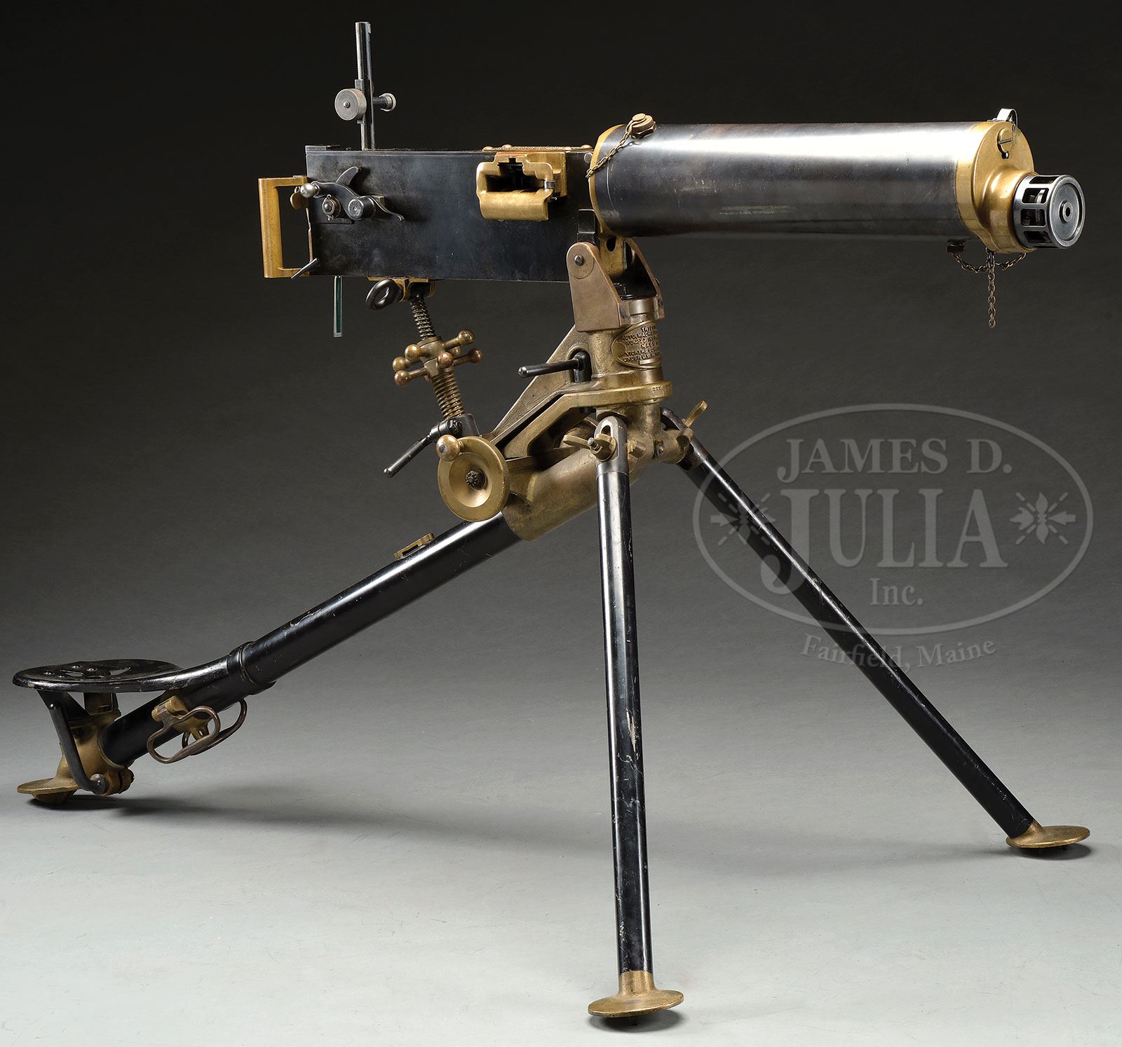 **EXTREMELY RARE AND DESIRABLE VICKERS MAXIM MODEL 1904 FORMERLY USED BY FOX MOVIE STUDIO (C&R).SN 48. 30-06 Cal. 28-1/2″ bbl. This Maxim model 1904 was made by Vickers Sons & Maxim Ltd and later came into the possession of Fox Movie Studios. Comes on orig VSM tripod. Feed shuttle has been drilled at two points for pins to adapt this weapon to fire blanks. Orig brass chains are present at muzzle. Cork assembly not present. Rear water filler cap and orig brass chain present. Marked “FOX STUDIO” on top of rear trunnion. Brass feed shuttle is SN 57A. Bolt is SN 78B. Rails are electro-penciled 25, trunnion is numbered 28. Top covered is numbered 57. Rear sight has a peep sight aperture adjustable for both elevation and windage. Front sight post has protected sheet metal cover. Fusee cover is brass and devoid of markings except for adjustment index marks. Tripod SN is 277 and brass head is embossed “TRIPOD AUTO. MACH. GUN CAL.30./NO.277 INSP./MADE BY/VICKERS SONS&MAXIM/UNDER U.S. PATENTS NOS.”. Mechanism functions smoothly when operated by hand. This gun appears fully functional. PROVENANCE: Ex-Dolf Goldsmith collection; The class III weapons formerly on loan to Evergreen Aviation & Space Museum. CONDITION: Overall finish and appearance is extremely fine to excellent. 88% blued finish on steel surfaces with some thinning on water jacket and where gun is mounted to tripod. Brass surfaces retain a pleasing, even patina. There are some scratches in areas of water jacket which are turning to brown patina as well as a couple of dings. Interior of action is clean and well oiled. Bore is shiny and bright. Bolt face is excellent. There is no doubt that some fortunate collector will take home this excellent example of an early Maxim. This gun is found in Dolf Goldsmith’s book on the Maxim The Devil’s Paint Brush on pages 275-276. This is one of only 90 guns produced by Vickers. With some research it should be possible to determine some of the films this gun may have appeared in. 4-51723 JWK29 (75,000-125,000) – Lot 1006