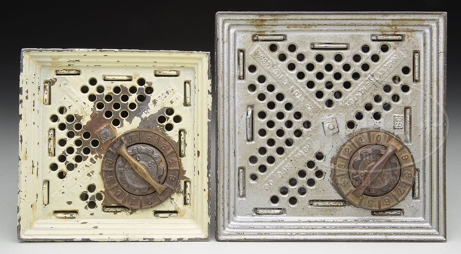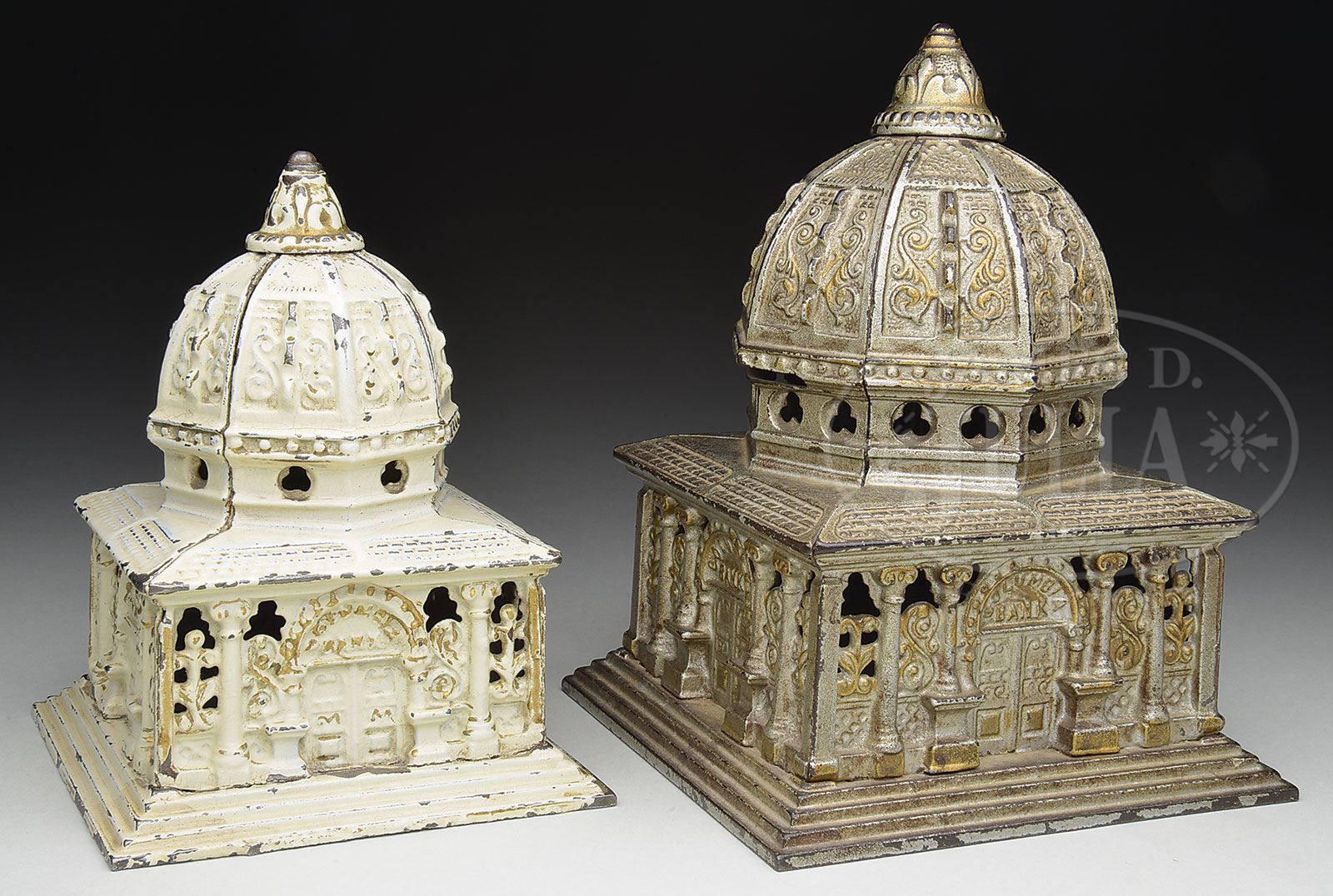 A pair of elaborately cast Columbia Banks manufactured by Kenton, with both banks retaining their original combination traps on the underside. The large version is silver with a multitude of gold highlighting to the elaborate castings (a couple of minor casting flaws on front facade filigree). The smaller version is enameled in white with gold highlighting to the fanciful castings. SIZE: Approx 5-1/2″ d x 5-1/2″ w x 7″ t and 4-1/2″ d x 4-1/2″ w x 5-1/2″ t respectively. PROVENANCE: The Estate of Carol and Jerry Soling. CONDITION: Overall fine to very fine. Large version would probably benefit by a light cleaning to remove decades of shelf dust. 1-14655 (600-900) – Lot 1006