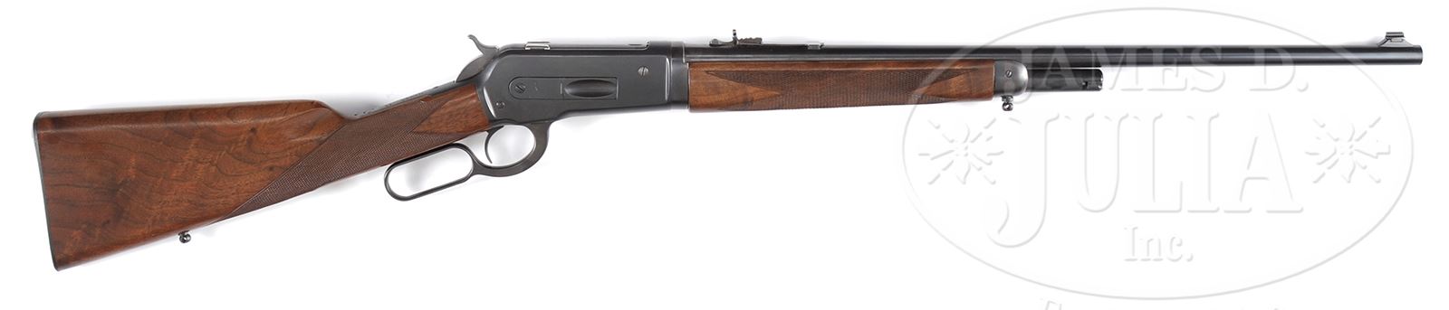 *WINCHESTER MODEL 1886 DELUXE TAKEDOWN RIFLE.SN 156936. Cal. .45-70. 23″ bbl, blue finish. Checkered walnut stocks, with sling swivel studs. PROVENANCE: William Henkel Collection. CONDITION: Fine as refinished, rifle shows 98% blue over all with few mars. Bore is very good with strong rifling. Takedown feature operates. Buttstock and forend are replacements using high grade crotch walnut. Stocks are checkered in a fine diamond pattern. Nice 86 takedown. 49394-7 TEP C&R (3,000-5,000) – Lot 1006
