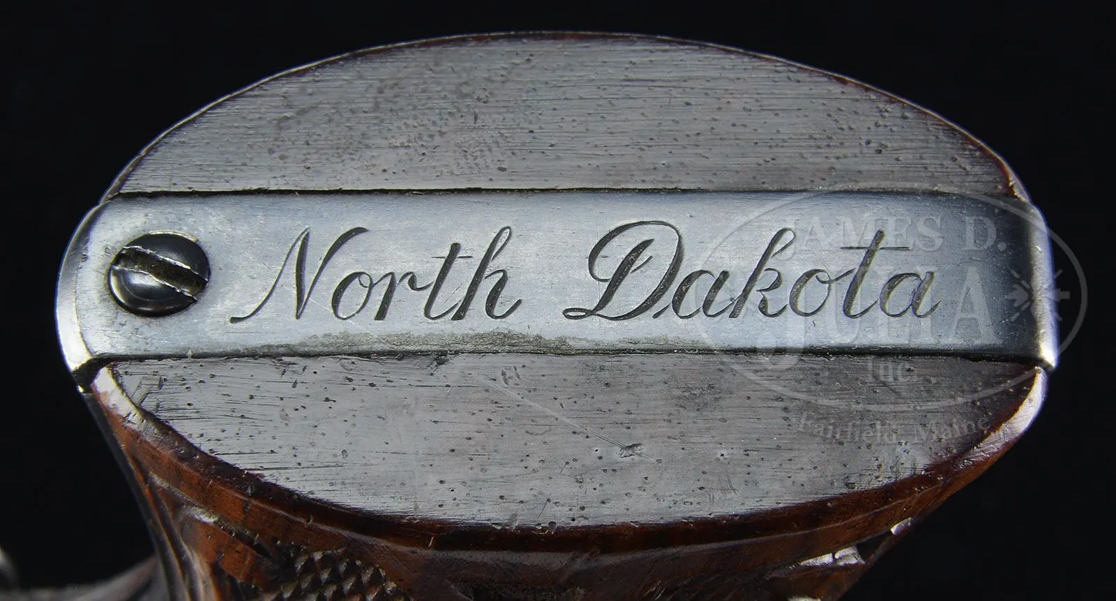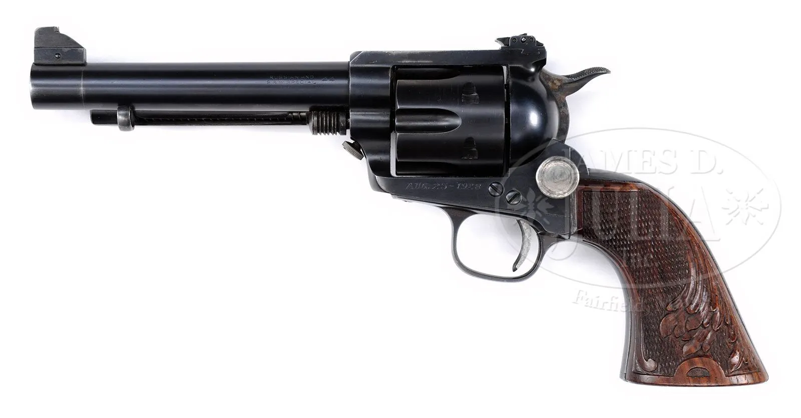 RARE KEITH LONG RANGE CUSTOM COLT SINGLE ACTION ARMY REVOLVER.SN 134626. Cal. .44 Special. All blue finish with 5-3/8″ bbl that has 1-line address & dual caliber “Russian and S&W Special” markings on left side. Top strap has been altered by Neal Houchins to flat top style which extends out over the hammer slot and has a dovetailed, Keith Long Range 3-leaf sight that has one standing & two folding leaves. Front sight is mounted to a sleeve with serrated back edge and is Partridge style 1/8″ wide. Top flat of frame is engraved “KEITH LONG RANGE COLT”. Left side of frame is engraved “AUG. 23-1928” and right side of frame “OCT. 24-1929”. Left front web of trigger guard is marked “45 CAL”. Backstrap is engraved “Theodore Roosevelt” and buttstrap “NORTH DAKOTA”. Mounted with a rare, raised carved & checkered 1-pc rosewood grip. Hammer is customized with the addition of a checkered Bisley spur and it has a custom, serrated wide trigger. It also has a custom base pin with very large serrated head and the retaining screw in the frame has a large head with coin slot and reeded edge. Hammer screw is replaced with a long stud that has a mushroom head for use in the Thompson quick draw rig being sold elsewhere in this auction. This feature very closely resembles the orig 19th century Bridgeport rig. This revolver is a composite of an 1890 frame with a more modern bbl & cyl. Trigger guard & backstrap had their SNs obliterated during the refinish process. Accompanied by a hand-printed manila tag which states that this revolver is “Theodore Roosevelt’s gun / his name engraved on / back stap (sic) / Philadelphia Pawn Shop / $5.00”. This revolver is pictured in Mr. Keith’s book Six Guns on p. 103. Caption for this picture states that the 1-pc rosewood grip was by Pachmayr. No indication as to what the two engraved dates on the frame represent. PROVENANCE: The Elmer Keith Estate Collection. CONDITION: Very fine. Overall retains 96-98% strong custom blue with only light muzzle & sharp edge wear. Cyl retains about 99% fine blue. Hammer retains strong case colors & trigger jeweling on the edges. Grip is sound showing very light diamond point wear & retains about all of its fine custom oil finish. Mechanics are crisp, bright shiny bore. 4-47995 JR247 (3,000-5,000) – Lot 1007 Click here to view provenance
