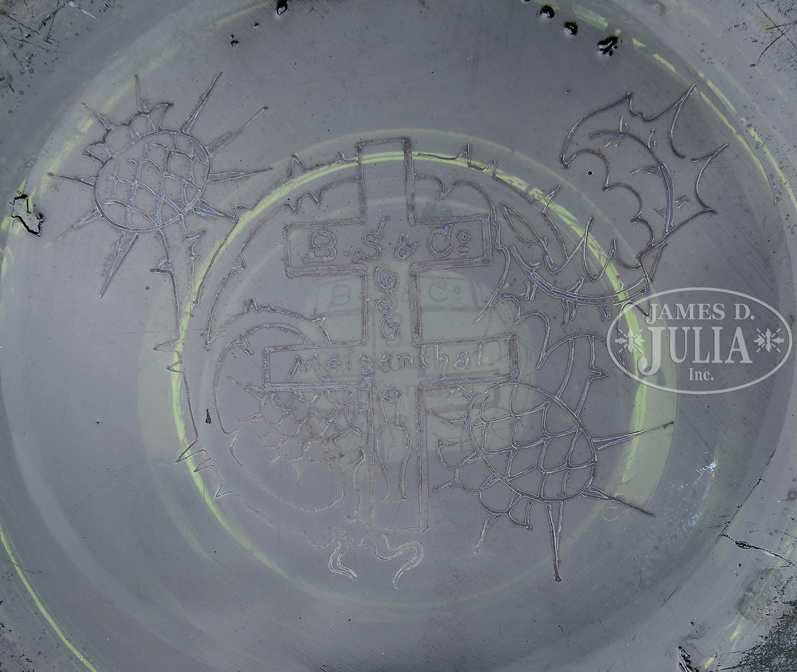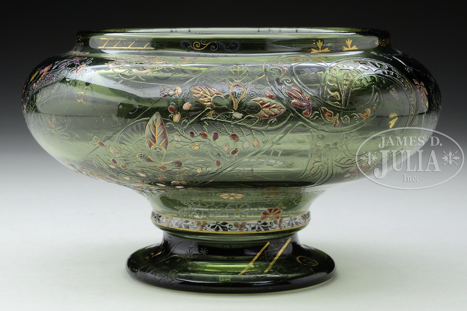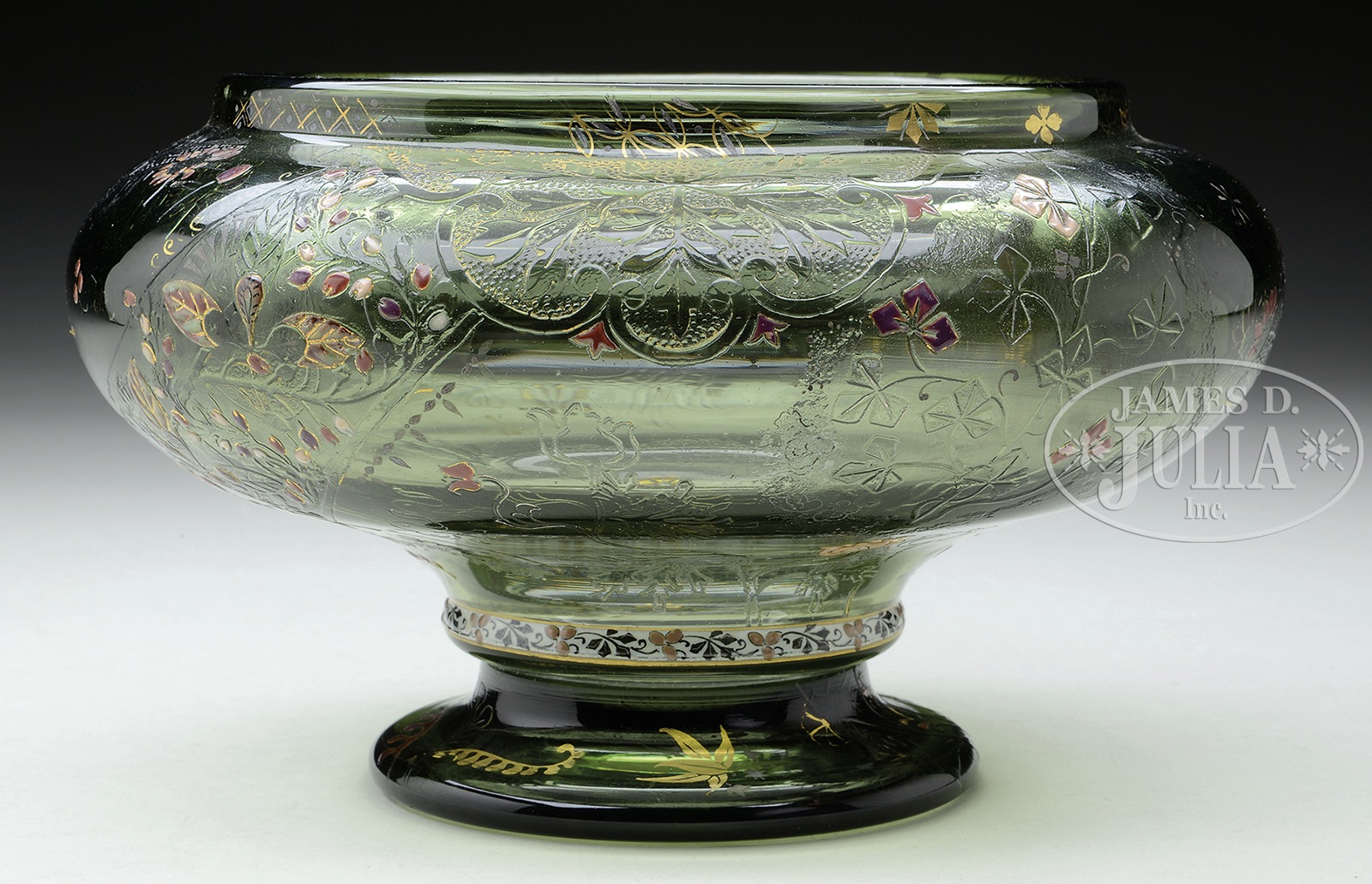 BURGUN & SCHVERER CARVED AND ENAMELED BOWL.Burgun & Schverer bowl is done in olive green glass with acid carved floral bands surrounding the bowl, random flowers and leaves are heavily enameled. Bowl is finished with an enameled floral band surrounding the top of the pedestal foot as well as gilt and enamel decoration on the foot. Bowl is signed on the underside with gilded thistle and Cross of Lorraine mark “B.S. & Co Meisenthal”. SIZE: 5″ t x 8″ dia. PROVENANCE: Dr. Robert LeVere Collection. CONDITION: Very good to excellent. 49726-4 (1,500-2,500) – Lot 1007