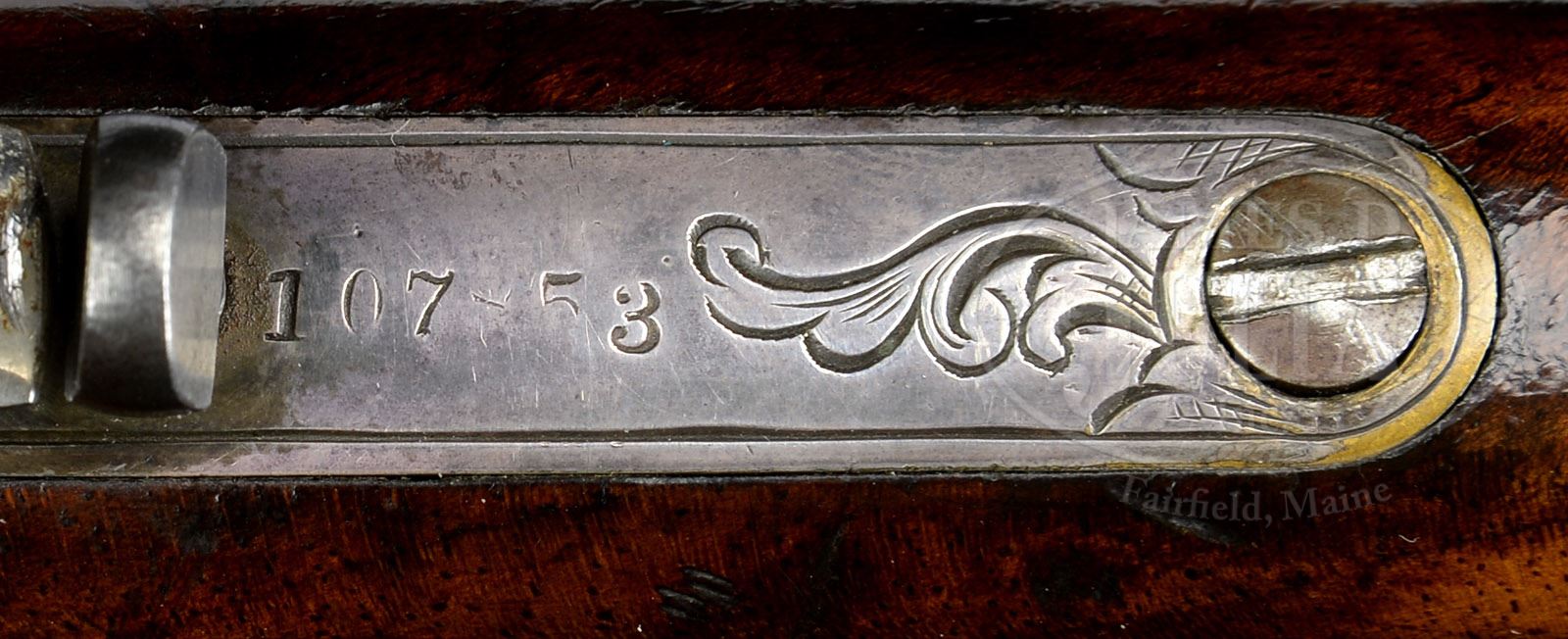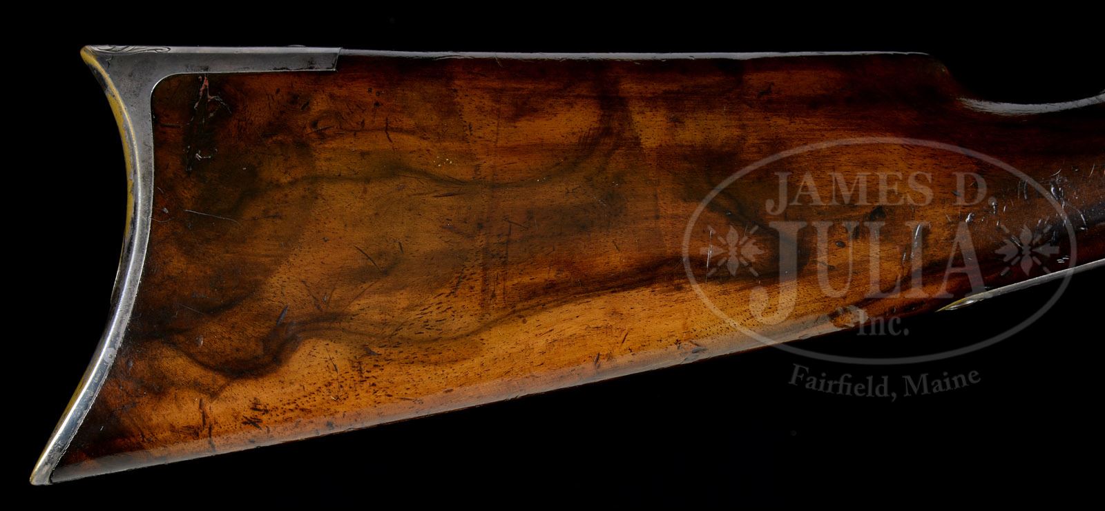 Please Note: IMPORTANT EXCITING DISCOVERY: We have just learned that this 1866 Carbine is purportedly one of ten such guns ordered for Mexican Presidente Porifiro Diaz in 1872. Each of the ten were supposedly delivered as unfinished barreled actions to L.D. Nimschke’s shop where they were engraved, silver-plated, and stocked in French walnut. Further research may uncover a connection between the buttplate inscription “J.R. Heaven” and Diaz. Six of these special order 1866 Carbines are known to exist in addition to this recent discovery. Correction: The inscription on the top of the buttplate should read “J.R. Heaven” not “J.D. Heaven”. The condition report should state… Bbl retains traces of oxidized silver finish. Condition report references receiver, lever and buttplate as having a nickel finish. This is not correct – There is NO NICKEL FINISH. The finish is positively silver. RARE NIMSCHKE ENGRAVED WINCHESTER MODEL 1866 SADDLE RING CARBINE.SN 107853. Cal. 44 RF Henry. Fine, signed, Nimschke engraved ’66 carbine with 20″ bbl, full magazine, integral front band/front sight & 2-position flip rear sight graduated to 500 yards. Mounted with very highly figured, uncheckered European walnut with straight stock & rifle crescent buttplate that has trap. Left side of buttstock has a very large kidney-shaped patch. Unusually, right side of lower tang under the wood is marked with an “X” and a “V”. Top tang channel of buttstock & inside toe of buttplate are marked with matching SN to the carbine. Receiver & sideplates, along with lever & buttplate are silver-plated. Receiver is beautifully engraved by Master Engraver L. D. Nimschke in his typical intertwined foliate arabesque patterns with fine pearled background. Several scrolls on left side terminate in flower blossoms and the left side plate is engraved in a very nicely detailed Mexican eagle. Right side has matching engraving with a single flower blossom & an open counter-point panel on sideplate. Engraving extends over top of receiver, top tang, bottom tang & buttplate tang. Bottom of carrier is engraved in Mr. Nimschke’s trademark flower blossom with fine pearled background and with his figure 8 ribbon around the timing screws on which is engraved his “LDN” initials top of buttplate tang is engraved “J.D. HEAVEN”, probably at the time the carbine was engraved. Signed examples of Mr. Nimschke’s work are rather rare and not often encountered. Equally rare, is the deluxe wood on an 1866 Winchester. This carbine appears to have been produced in about 1872 at a time when any repeating firearm was in great demand on the Western frontier and a firearm was a daily use tool. Firearms of that era are rarely found today with orig configuration and finish. PROVENANCE: The Estate of G. W. “Bill” Stewart of Sonora, Texas. CONDITION: Fine to very fine, all matching. Bbl & magazine tube retain about 60-70% blue, strong in sheltered areas, fading and thin elsewhere with scattered spots of light surface etching and light pitting around the muzzle ends and on front band. Receiver retains about 95% strong, restored nickel. Hammer retains about 75% case colors, dark on top edge, showing wear on the right side. Lever retains about 85% orig nickel. Buttplate retains about 60% restored nickel finish. Stock with the aforementioned patch and a small, filled area by the top tang is otherwise sound with nicks, dings & bruises and shows an old restored finish. Forearm is sound with light nicks & dings, also with a restored finish. Mechanics are fine. Very bright shiny bore with some scattered pitting about mid-point. 49973-493 JR95 (6,500-12,500) – Lot 1007