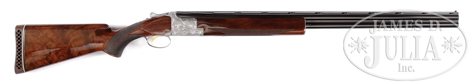 *BROWNING DIANA GRADE SUPERPOSED TRAP GUN.SN 25945S70. Cal. 12 ga. 30″ bbls with Broadway ventilated rib, 2-3/4″ chambers, chokes marked IM/FULL. Bradley type front & mid-beads. Full sized trap forend. Auto ejectors. Lovely Diana grade engraved receiver with pheasants on left, ducks on right, quail on floorplate & rabbits on trigger bow. Engraving signed by R. Kowalski. Gold washed single selective trigger. Beautifully grained & figured select walnut. Stock configuration FKST. Browning marked vented pad. LOP 14-5/8″. Non-auto safety. PROVENANCE: Remarkable William Larkin Moore Private Estate Collection of Fine Sporting Arms. CONDITION: Very good plus. Rich bbl blue with scattered areas of oxidation at muzzle end of bbls & along front edges of rib. Normal handling marks ahead of forend. Receiver engraving sharp. Slight discoloration around safety. Cataloger observes no evidence of salt oxidation on external surfaces. Excellent gloss wood finish with hardly a mark, sharp checkering. Top lever right. Mirror bores. Tight gun, excellent mechanics, ejectors kick with authority. 50595-30 TJW (3,250-5,000) – Lot 1007