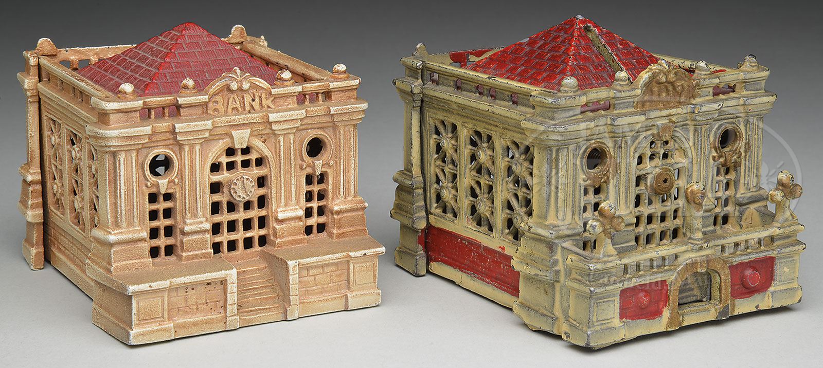 PAIR OF PAINTED U.S. TREASURY BANKS.Originally manufactured by Columbia Grey Iron Casting Co., the first bank depicting a more elaborately cast and intricate version enameled in a cream color with gilt trim and red highlighting. Oftentimes this bank is nickel plated or electroplated, it is somewhat unusual to find a painted version, especially one in pristine condition. Original date of manufacture was the mid-1920s and later on in the mid 20th century, the same company produced the same bank but in a less elaborate casting to the front landing area. This bank was also enameled in a cream color, but only with a red roof. SIZE: Approx 3″ x 4″. PROVENANCE: The Estate of Carol and Jerry Soling. CONDITION: Both banks are in original very fine plus to pristine finish. 1-14668 (750-950) – Lot 1008 Auction: Advertising, Toy & Doll Auction - Fall 2014 Please Note: All prices include the hammer price plus the buyer’s premium, which is paid by the buyer as part of the purchase price. The prices noted here after the auction are considered unofficial and do not become official until after the 46th day. |