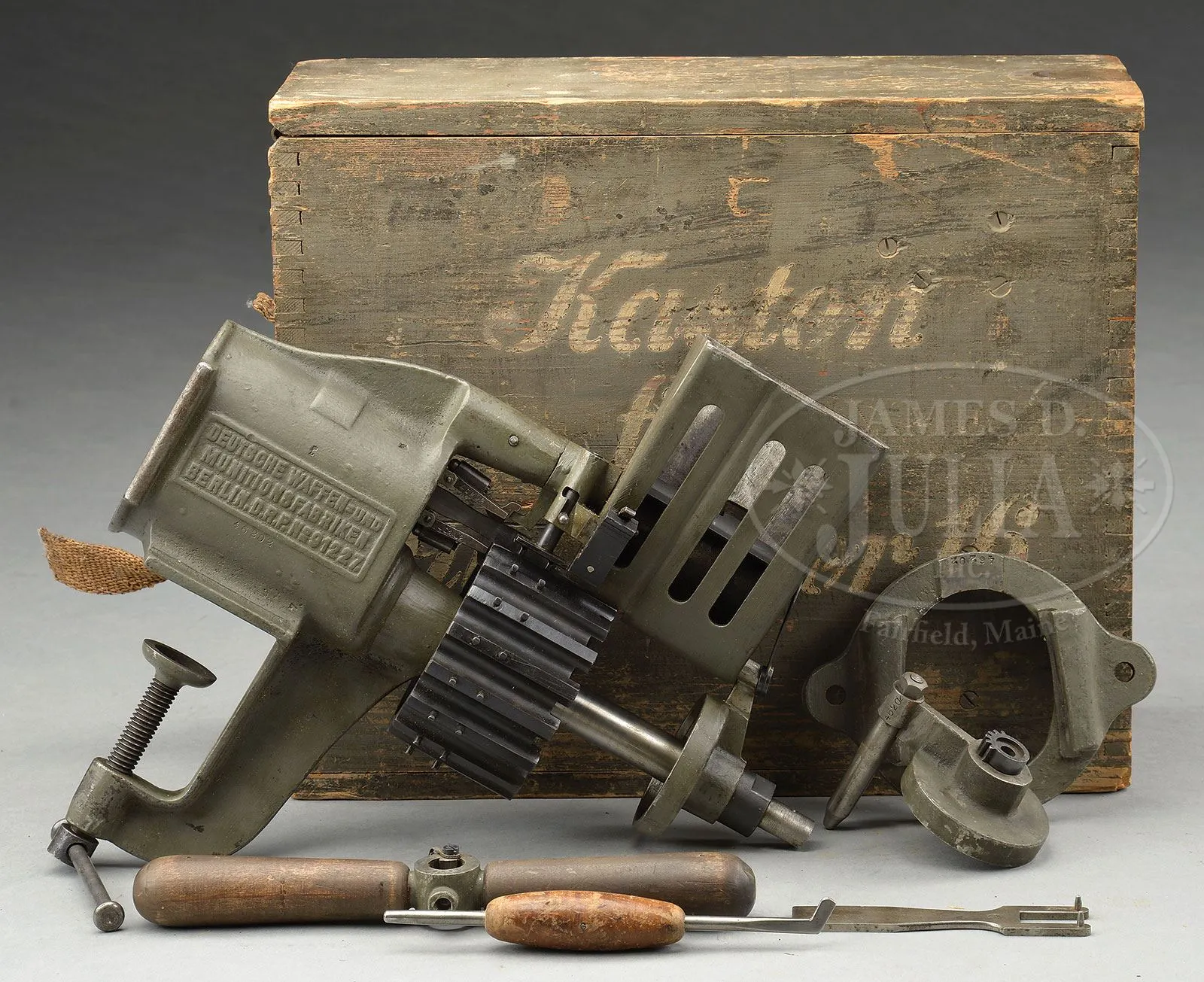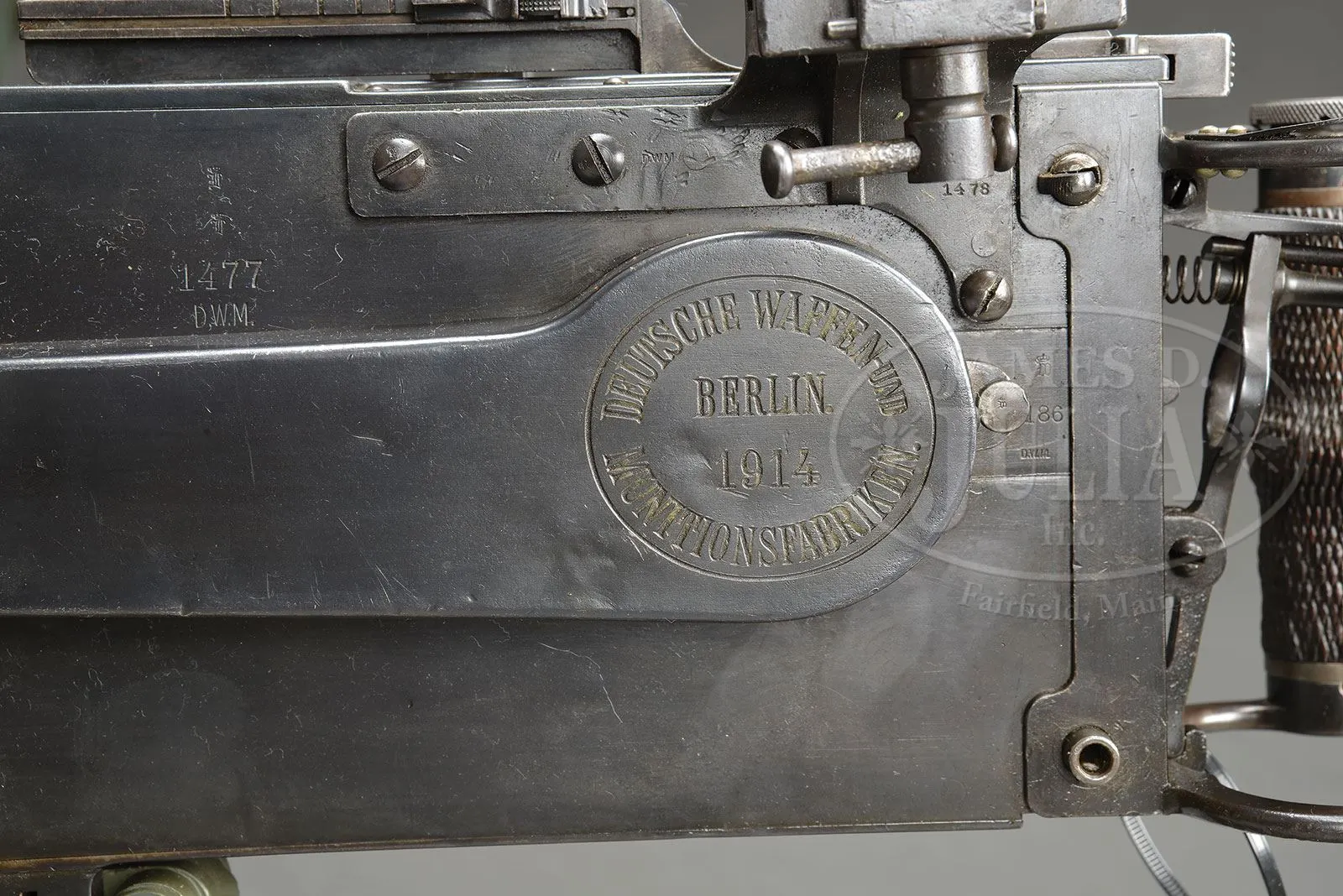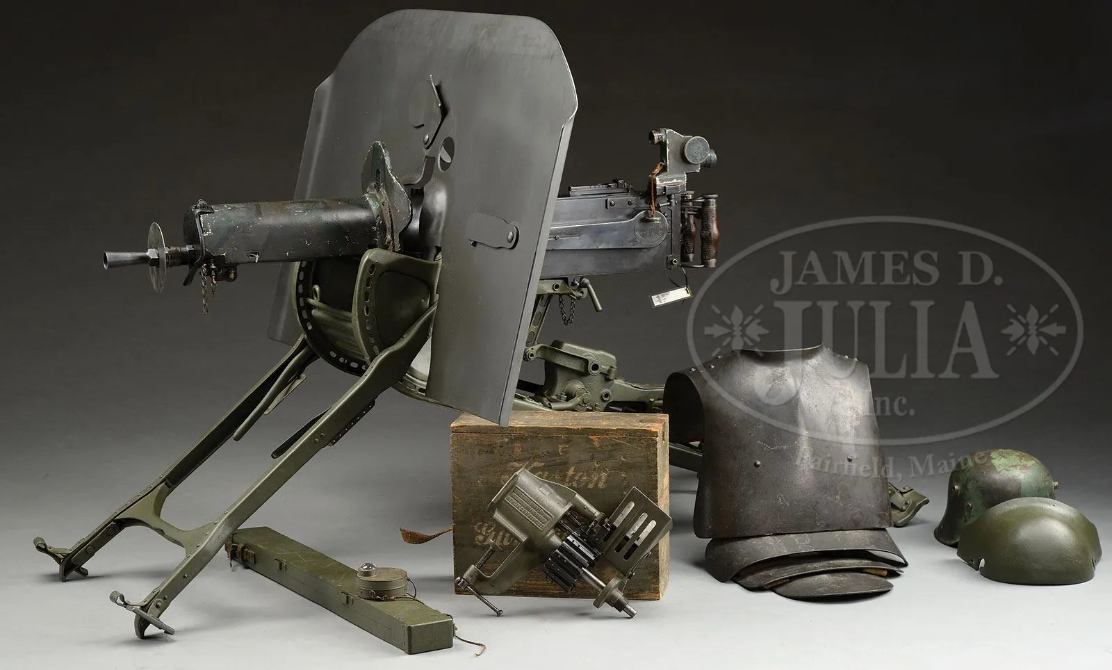 **DWM MAXIM MG 08 MACHINE GUN DATED 1914 WITH ACCESSORIES (C&R).SN 1477. 8 mm. 28″ bbl. This 1914 dated Maxim comes with numerous accessories including sled mount, armor shields for nose cap and bbl jacket as well as large reproduction personnel protection armored shield which mounts on sled mount. Also included is Busch optical sight, M16 camouflage painted helmet with reinforcement plate and machine gunners armor plates. Other gun accessories include a wooden spare bbl carrier, belt loading machine in its orig wooden box with wall mounting bracket, belt repair tools, spare gear assembly, spare cartridge belt opening assembly and an extremely rare and working hand held lanyard pull operated generator lamp. Sled mount comes with unnumbered spare bbl, cleaning patches, packing gland material, muzzle bearing without booster, broken case extractor, cartridge case extraction tongs and clamp and chain to attach tripod to stationary objects. Gun is marked on fusee cover “DEUTSCHE WAFFEN-UND MUNITIONSFABRIKEN BERLIN 1914”, top cover is marked “MG08” / “GrR7MG” / “Res.” / struck through “7.R.M.G.”. Gun is fitted on left side with traverse graduation bracket with stops for fixed mount positions. Gun optic bracket and top cover do not match gun by only one number (1478). Bolt is numbered 7105 as is cross bolt. Feed block bears imperial German proofs but no SN other than on lower feed arm which is numbered 93 & 28. Gun retains cork and chain assembly, water drain valve which is functional, water fill cap and chain with thumb piece intact. Armored nose plate retains a coat of black paint, water jacket shield displays a camouflage paint scheme as does M16 helmet. Helmet reinforcement shield apparently a repaint over some pitting but still completely serviceable. Portable generator light marked “Maonetlampe”. Large armored shield has sliding ports both for optical sight and personal view port and these function smoothly. Mechanism functions smoothly when operated by hand. This gun appears fully functional. PROVENANCE: Ex-Dolf Goldsmith collection; The class III weapons formerly on loan to Evergreen Aviation & Space Museum. CONDITION: Overall finish and appearance is near excellent. Over 90% blued finish with some loss of finish on fusee spring cover, front deflector at muzzle and some scratches and loss of finish to water jacket. Helmet retains 40% of its camouflage paint with otherwise brown patina; white padded liner present but eyelets for leather cord have torn through, these could be repaired with some effort. There is a barely discernible attempt to mark the inside of back of helmet with either initials or a proper name. Generator light pull chain intact and serviceable and this item is functional, lighting up when chain is pulled multiple times. Wax impregnated string remnants still adhering to this light. About 80% orig gray/green finish on outside case. ZF12 optic is clear and serviceable and has a metal protective cap which fits over lens. Rubber eye cup not present but remnants are clearly present next to lens. Optic marked “Emil Busch A.-G.” / “Rathenow”. Water jacket armor has a camouflage paint scheme and is in good, serviceable condition. Gunner’s helmet reinforcement plate also in good condition with some pitting covered by recent repaint. wooden bbl carrier retains over 90% of its green repainted finish, wooden interior in good, serviceable condition as are leather closing straps. Gunner’s armor comes in 4-pc set and the plates are marked with manufactures code of 3-circles. One plate is numbered 40, another 32. Straps that hold pieces together appear to be cotton with horsehair pads between plates. Muzzle booster on gun in good, clean condition. Muzzle deflector plate marked 08. Steam release cork in good, serviceable condition. Hand grips are an attractive brown walnut with good checkering. Oil brushes are present, serviceable and SN 78 as is rest of backplate. Bore is excellent, shiny and bright as is bolt face. Sled mount retains its trunnion top strap, is dated 1914 and has been repainted green; pads are not present. Bore of spare bbl has significant corrosion 3/4″ of the way down the bbl, otherwise strong rifling. Sled mount mechanism operates properly. This cataloger has seen many Maxims over the years but none have been quite so complete with accessories as this example. Add to the fact that this is a early production gun in fine condition makes this an exceedingly desirable Maxim gun. 4-51711 JWK31 (20,000-30,000) – Lot 1009