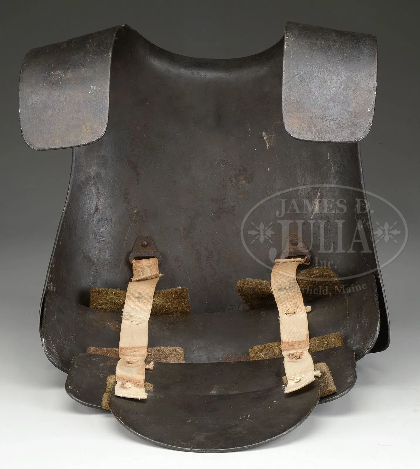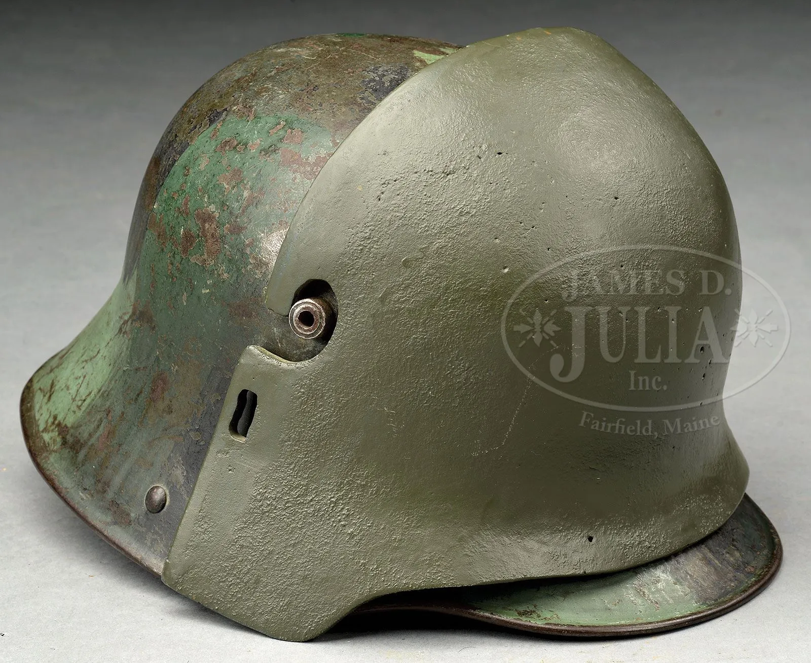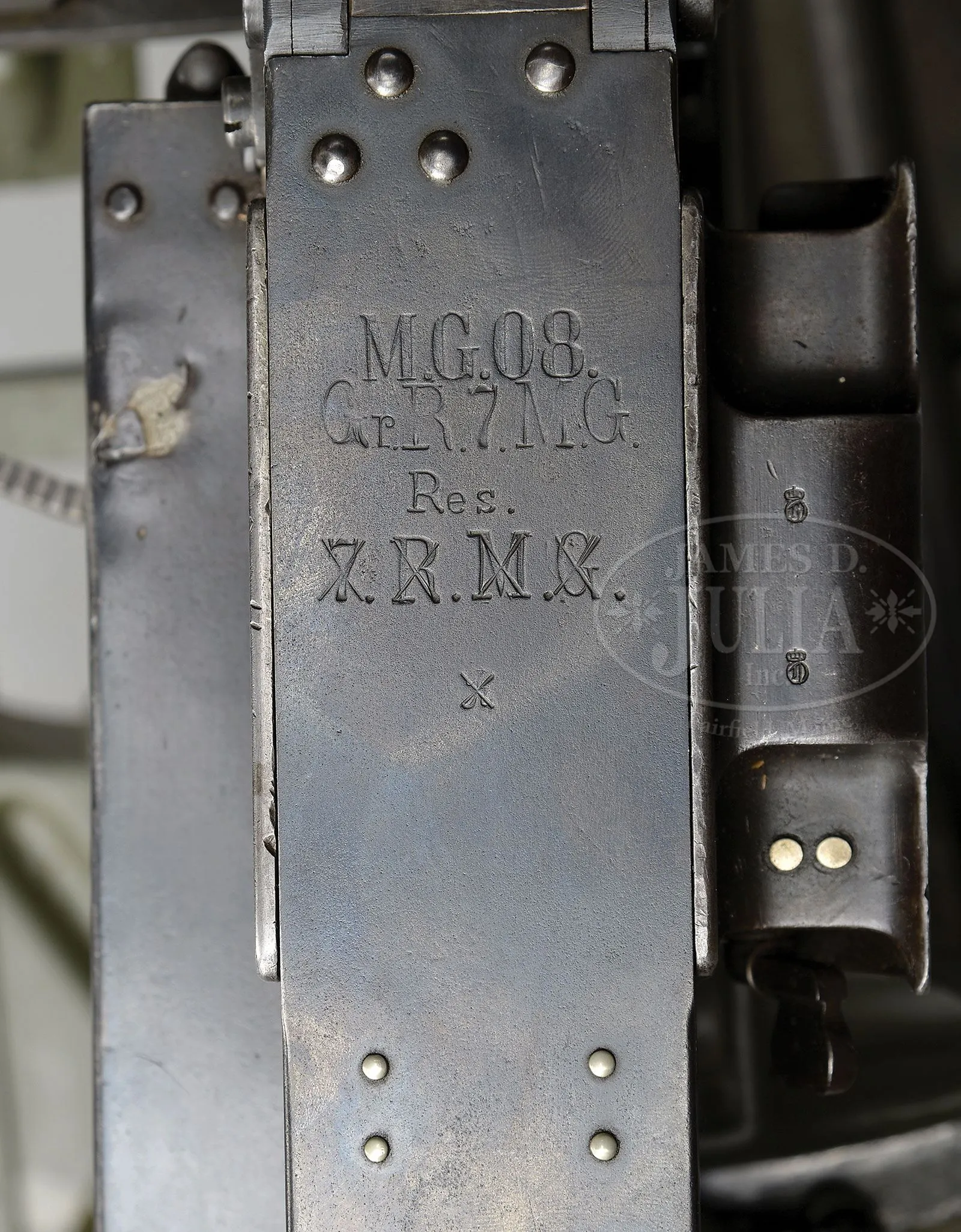 **DWM MAXIM MG 08 MACHINE GUN DATED 1914 WITH ACCESSORIES (C&R).SN 1477. 8 mm. 28″ bbl. This 1914 dated Maxim comes with numerous accessories including sled mount, armor shields for nose cap and bbl jacket as well as large reproduction personnel protection armored shield which mounts on sled mount. Also included is Busch optical sight, M16 camouflage painted helmet with reinforcement plate and machine gunners armor plates. Other gun accessories include a wooden spare bbl carrier, belt loading machine in its orig wooden box with wall mounting bracket, belt repair tools, spare gear assembly, spare cartridge belt opening assembly and an extremely rare and working hand held lanyard pull operated generator lamp. Sled mount comes with unnumbered spare bbl, cleaning patches, packing gland material, muzzle bearing without booster, broken case extractor, cartridge case extraction tongs and clamp and chain to attach tripod to stationary objects. Gun is marked on fusee cover “DEUTSCHE WAFFEN-UND MUNITIONSFABRIKEN BERLIN 1914”, top cover is marked “MG08” / “GrR7MG” / “Res.” / struck through “7.R.M.G.”. Gun is fitted on left side with traverse graduation bracket with stops for fixed mount positions. Gun optic bracket and top cover do not match gun by only one number (1478). Bolt is numbered 7105 as is cross bolt. Feed block bears imperial German proofs but no SN other than on lower feed arm which is numbered 93 & 28. Gun retains cork and chain assembly, water drain valve which is functional, water fill cap and chain with thumb piece intact. Armored nose plate retains a coat of black paint, water jacket shield displays a camouflage paint scheme as does M16 helmet. Helmet reinforcement shield apparently a repaint over some pitting but still completely serviceable. Portable generator light marked “Maonetlampe”. Large armored shield has sliding ports both for optical sight and personal view port and these function smoothly. Mechanism functions smoothly when operated by hand. This gun appears fully functional. PROVENANCE: Ex-Dolf Goldsmith collection; The class III weapons formerly on loan to Evergreen Aviation & Space Museum. CONDITION: Overall finish and appearance is near excellent. Over 90% blued finish with some loss of finish on fusee spring cover, front deflector at muzzle and some scratches and loss of finish to water jacket. Helmet retains 40% of its camouflage paint with otherwise brown patina; white padded liner present but eyelets for leather cord have torn through, these could be repaired with some effort. There is a barely discernible attempt to mark the inside of back of helmet with either initials or a proper name. Generator light pull chain intact and serviceable and this item is functional, lighting up when chain is pulled multiple times. Wax impregnated string remnants still adhering to this light. About 80% orig gray/green finish on outside case. ZF12 optic is clear and serviceable and has a metal protective cap which fits over lens. Rubber eye cup not present but remnants are clearly present next to lens. Optic marked “Emil Busch A.-G.” / “Rathenow”. Water jacket armor has a camouflage paint scheme and is in good, serviceable condition. Gunner’s helmet reinforcement plate also in good condition with some pitting covered by recent repaint. wooden bbl carrier retains over 90% of its green repainted finish, wooden interior in good, serviceable condition as are leather closing straps. Gunner’s armor comes in 4-pc set and the plates are marked with manufactures code of 3-circles. One plate is numbered 40, another 32. Straps that hold pieces together appear to be cotton with horsehair pads between plates. Muzzle booster on gun in good, clean condition. Muzzle deflector plate marked 08. Steam release cork in good, serviceable condition. Hand grips are an attractive brown walnut with good checkering. Oil brushes are present, serviceable and SN 78 as is rest of backplate. Bore is excellent, shiny and bright as is bolt face. Sled mount retains its trunnion top strap, is dated 1914 and has been repainted green; pads are not present. Bore of spare bbl has significant corrosion 3/4″ of the way down the bbl, otherwise strong rifling. Sled mount mechanism operates properly. This cataloger has seen many Maxims over the years but none have been quite so complete with accessories as this example. Add to the fact that this is a early production gun in fine condition makes this an exceedingly desirable Maxim gun. 4-51711 JWK31 (20,000-30,000) – Lot 1009