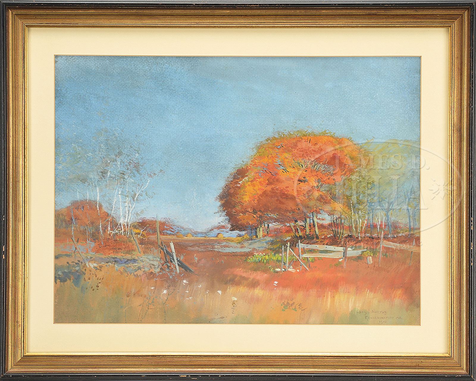 LOUIS DOYLE NORTON (American, 1867-1940) FALL IN KENNEBUNKPORT, MAINE. Watercolor/gouache Housed in a modern partial gilt frame with matte Signed lower right “Louis D Norton Kennebunkport, ME 1910″ SIZE: Sight: 14-1/4″ x 19-1/4”. Overall: 20″ x 25″ CONDITION: Very good 7-70517 (1,000-1,500)