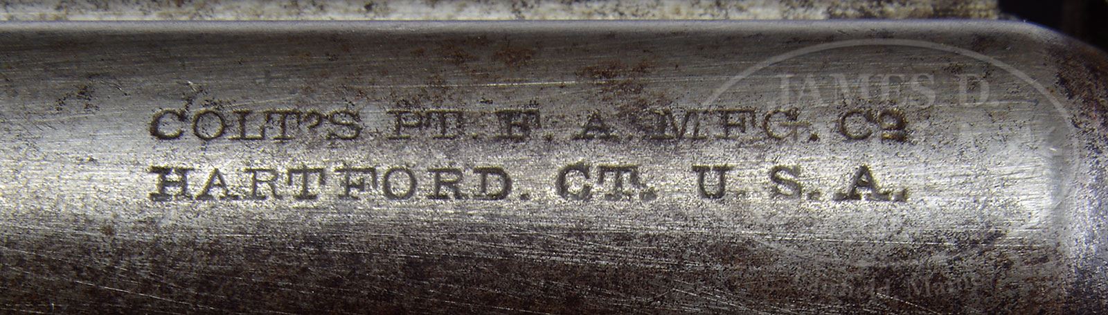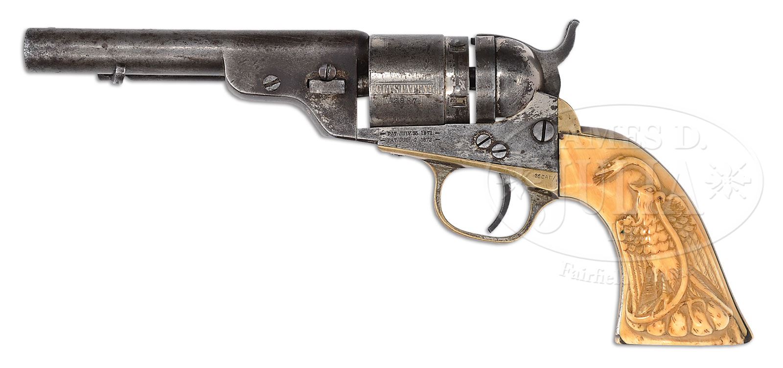 COLT POCKET NAVY CONVERSION REVOLVER WITH EJECTOR OF ELMER KEITH.SN 12837. Cal. 38 RF. Nickel finish with 4-1/2″ rnd bbl, brass front sight and 2-line Hartford address. Right side of bbl lug has an ejector housing with a replacement ejector rod head. Left side of frame has the 2-line “1871” and “1872” patent dates. Left shoulder of trigger guard is marked “36 CAL”. Cyl has five chambers and the stagecoach holdup scene roll marking. The silver plated brass trigger guard & back strap contain an orig Colt 1-pc certifiable antique ivory grip with deep relief carved Mexican eagle on left side. Inside right grip has matching SN. According to Flayderman’s Guide to Antique American Firearms there were about 6,000 of these revolvers produced in two calibers, 1873-1875. These small pocket pistols, upon introduction, were immediately very popular with the buying public. They usually saw hard service under adverse conditions and of those few surviving today, very few have any orig finish. Grips are certified to be original Colt factory carved ivory grips and certifiable as “ESA Antique”. Grips are original and unchanged since this gun was originally produced in percussion in 1862. Special Note: This item contains or is made of ivory. Do not bid on this lot unless you have read and agreed to our “Ivory Position Statement” and the “Waiver of Legal and Financial Risk to James D. Julia in regards to your Purchase of an Ivory Object”. This information is located in our catalog on pages 30 and 31. PROVENANCE: The Elmer Keith Estate Collection. CONDITION: Very good, all matching except wedge which is numbered “13964”. Bbl retains traces of orig nickel in the most sheltered areas being an overall mottled silver/brown patina; frame retains about 30% orig nickel with the balance a gray patina; cyl retains traces of orig nickel with the balance a gray patina and shows about 50% stagecoach holdup scene roll marking; trigger guard & back strap are a medium mustard patina. Grip has a chipped left heel & toe and a small crack in the left heel, otherwise is sound with a few age lines and shows a wonderful golden ivory patina. Mechanics are fine, strong bore with good shine and moderate to heavy pitting. 4-48019 JR320 (3,000-5,000) – Lot 1011