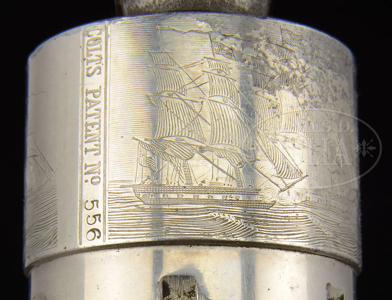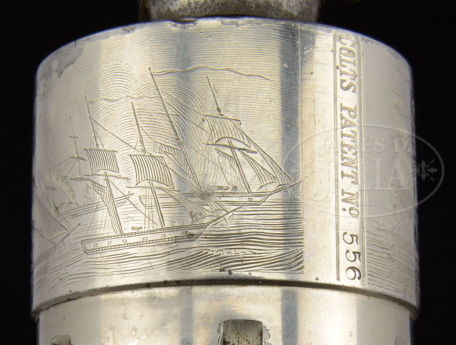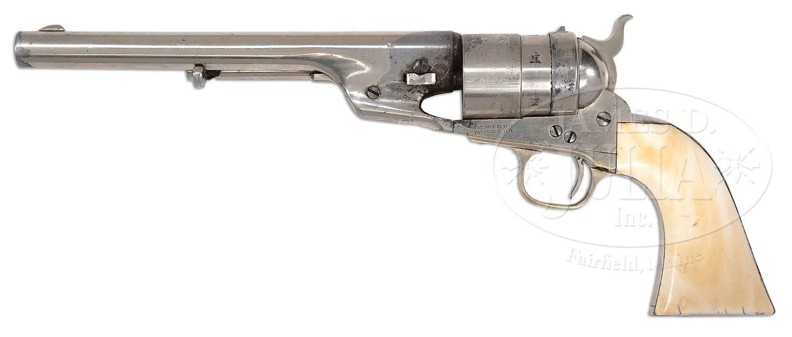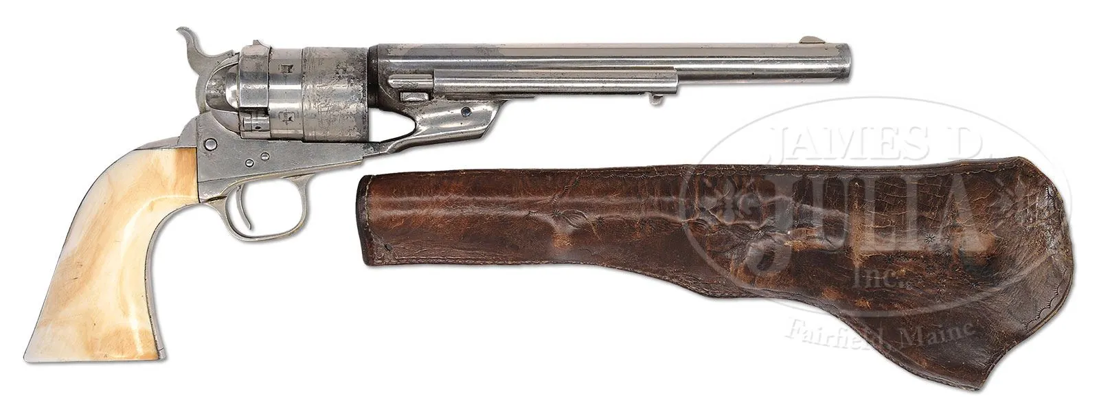 SCARCE RICHARDS CONVERSION OF COLT 1860 ARMY REVOLVER THAT BELONGED TO ELMER KEITH.SN 4556. Cal. .44 Colt. Nickel finish with 8″ bbl, nickel silver front sight & 1-line New-York U.S. America address. Right side of bbl lug has an attached ejector housing with checkered half moon ejector rod head. Cylinder is rebated with usual six chambers and Ormsby Naval Battle scene roll marking. Left side of frame has 2-line patent dates & left shoulder of trigger guard is marked “44 CAL”. Mounted with 1-pc certifiable antique ivory grip made in the orig pattern consisting of two slabs of ivory attached to two wooden spacer blocks. Inside each grip has matching SN in ink. Loading gate has assembly number “2983” with matching number on cylinder spindle. Accompanied by a very early, orig, brown leather, left hand Slim Jim holster with light tooled decorations on front and a belt loop on reverse side secured with copper harness rivets. There were about 9,000 of these revolvers produced 1873-1878. These revolvers were essentially a stop-gap measure by Colt until production of their Model 1873 Single Action Army revolvers caught up with demand. These revolvers were widely dispersed and were in great demand throughout the American frontier. They usually saw very hard service and are rarely found with high orig finish. Once the stronger Model 1873 revolver with its larger, heavier caliber was widely distributed, the open top model with its weaker frame, fell out of favor and production ceased. Special Note: This item contains or is made of ivory. Do not bid on this lot unless you have read and agreed to our “Ivory Position Statement” and the “Waiver of Legal and Financial Risk to James D. Julia in regards to your Purchase of an Ivory Object”. This information is located in our catalog on pages 30 and 31. PROVENANCE: The Elmer Keith Estate Collection. CONDITION: Very fine, all matching including grip, except wedge which is properly unnumbered. Bbl retains 65-70% orig nickel with losses around the muzzle & forcing cone area. Frame retains about 90% orig nickel & cyl about 70%. Cyl shows about 95% Ormsby Naval Battle scene roll marking. Trigger guard & backstrap retain most of their strong, orig nickel with slight wear on trigger bow. Grip is sound with a few age lines & shows a wonderful, mellow ivory patina. Mechanics are fine, strong bore with fine pitting. Holster shows considerable wear but is completely sound with a slightly crackled finish. Altogether a rare frontier set. 4-47992 JR250 (6,000-9,000) – Lot 1012