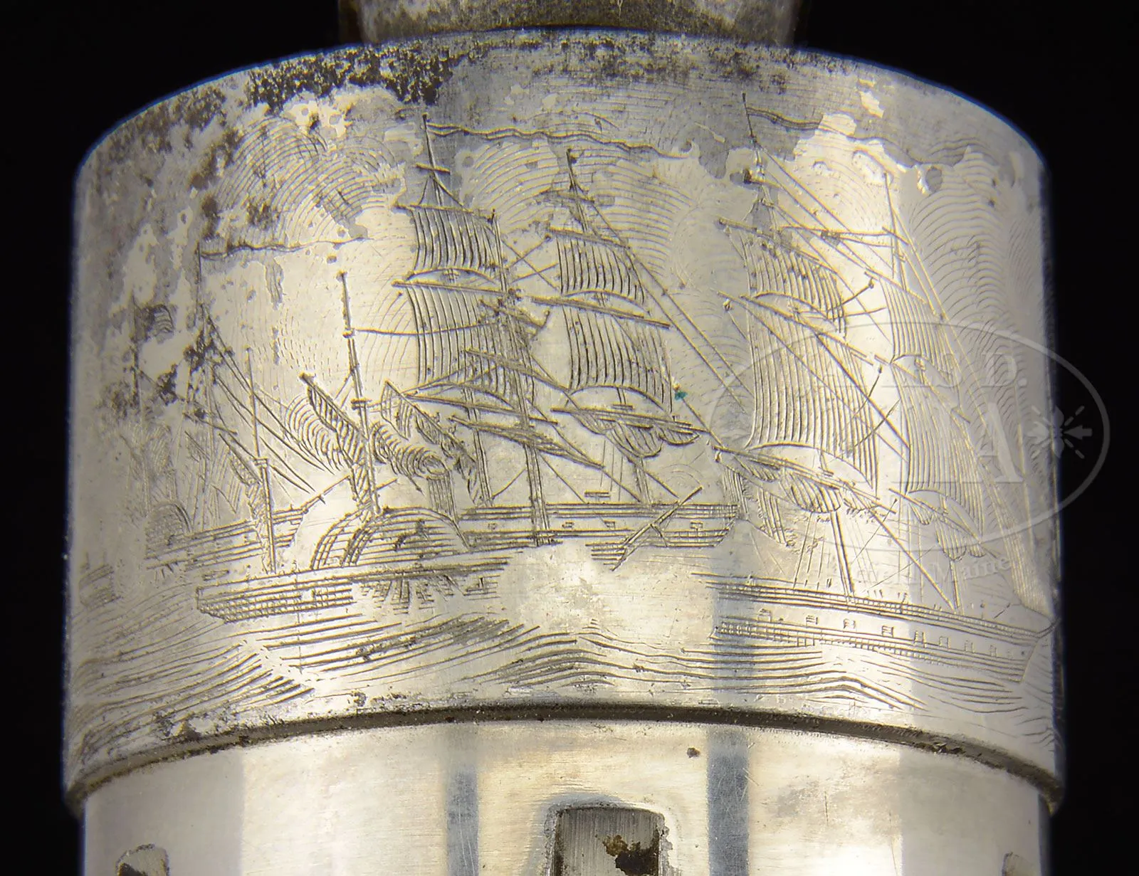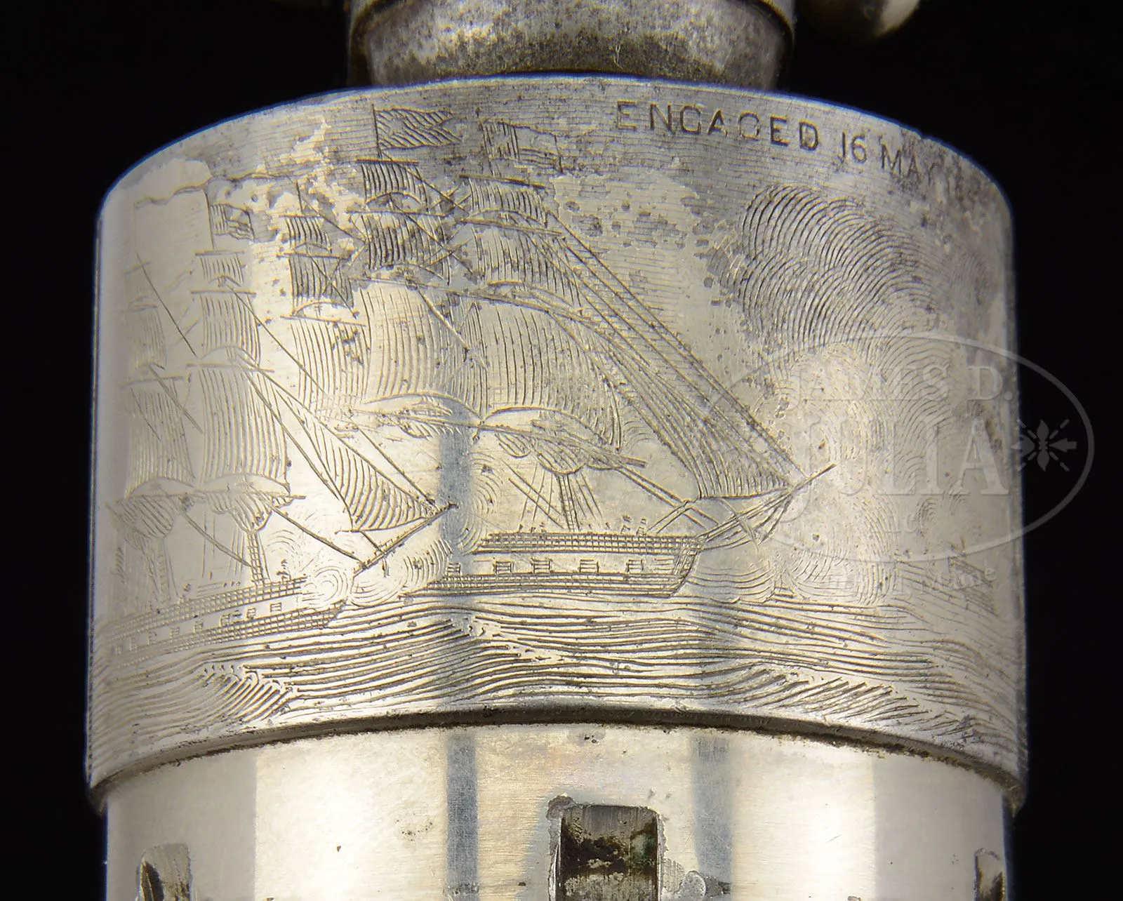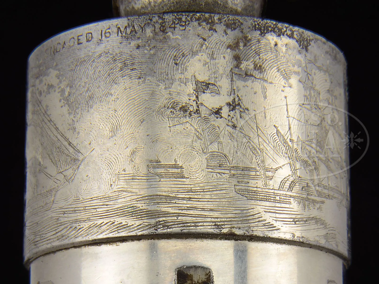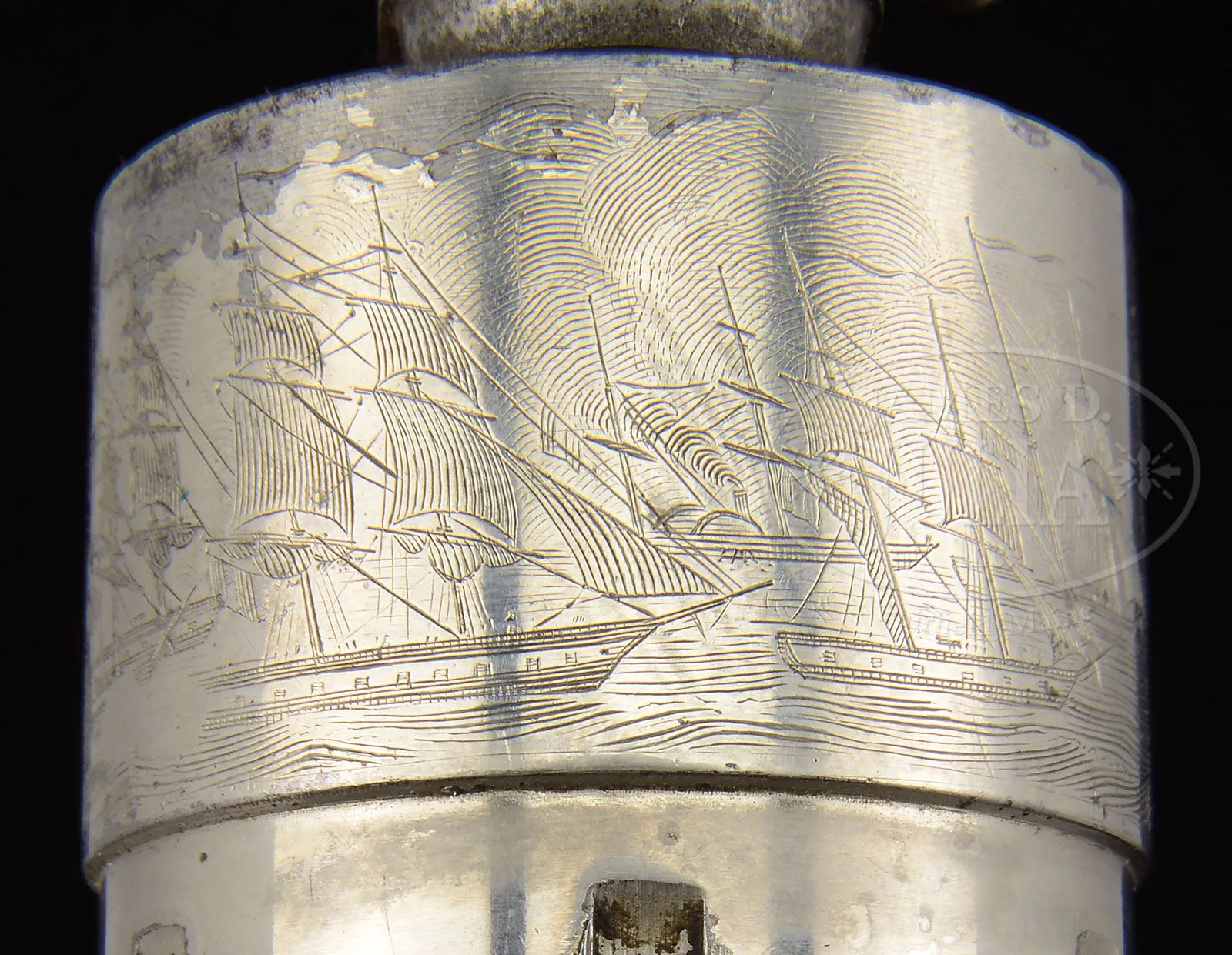 SCARCE RICHARDS CONVERSION OF COLT 1860 ARMY REVOLVER THAT BELONGED TO ELMER KEITH.SN 4556. Cal. .44 Colt. Nickel finish with 8″ bbl, nickel silver front sight & 1-line New-York U.S. America address. Right side of bbl lug has an attached ejector housing with checkered half moon ejector rod head. Cylinder is rebated with usual six chambers and Ormsby Naval Battle scene roll marking. Left side of frame has 2-line patent dates & left shoulder of trigger guard is marked “44 CAL”. Mounted with 1-pc certifiable antique ivory grip made in the orig pattern consisting of two slabs of ivory attached to two wooden spacer blocks. Inside each grip has matching SN in ink. Loading gate has assembly number “2983” with matching number on cylinder spindle. Accompanied by a very early, orig, brown leather, left hand Slim Jim holster with light tooled decorations on front and a belt loop on reverse side secured with copper harness rivets. There were about 9,000 of these revolvers produced 1873-1878. These revolvers were essentially a stop-gap measure by Colt until production of their Model 1873 Single Action Army revolvers caught up with demand. These revolvers were widely dispersed and were in great demand throughout the American frontier. They usually saw very hard service and are rarely found with high orig finish. Once the stronger Model 1873 revolver with its larger, heavier caliber was widely distributed, the open top model with its weaker frame, fell out of favor and production ceased. Special Note: This item contains or is made of ivory. Do not bid on this lot unless you have read and agreed to our “Ivory Position Statement” and the “Waiver of Legal and Financial Risk to James D. Julia in regards to your Purchase of an Ivory Object”. This information is located in our catalog on pages 30 and 31. PROVENANCE: The Elmer Keith Estate Collection. CONDITION: Very fine, all matching including grip, except wedge which is properly unnumbered. Bbl retains 65-70% orig nickel with losses around the muzzle & forcing cone area. Frame retains about 90% orig nickel & cyl about 70%. Cyl shows about 95% Ormsby Naval Battle scene roll marking. Trigger guard & backstrap retain most of their strong, orig nickel with slight wear on trigger bow. Grip is sound with a few age lines & shows a wonderful, mellow ivory patina. Mechanics are fine, strong bore with fine pitting. Holster shows considerable wear but is completely sound with a slightly crackled finish. Altogether a rare frontier set. 4-47992 JR250 (6,000-9,000) – Lot 1012