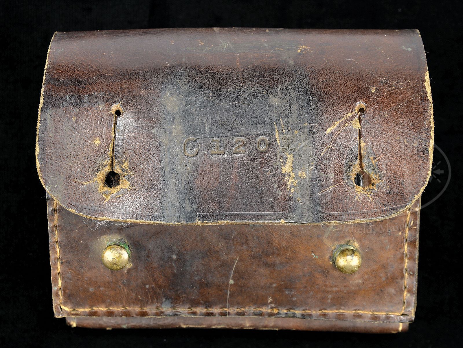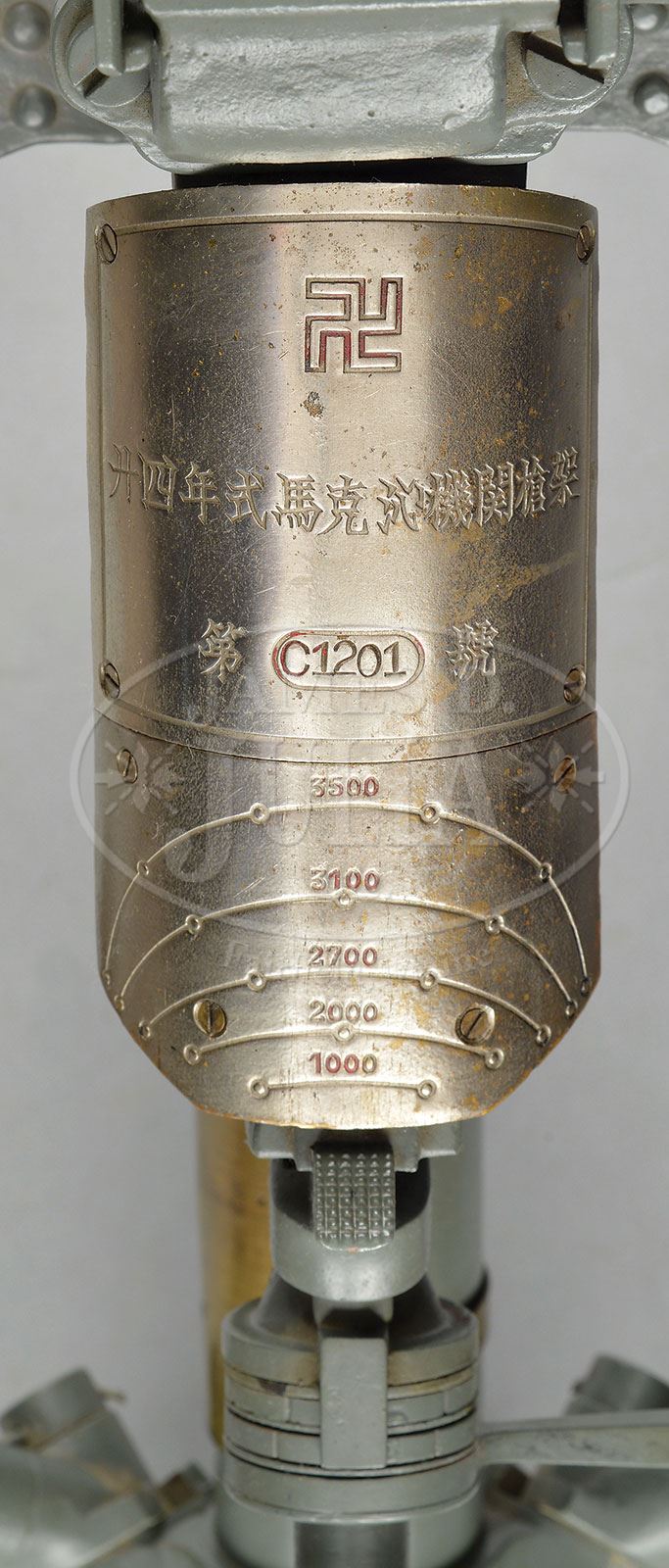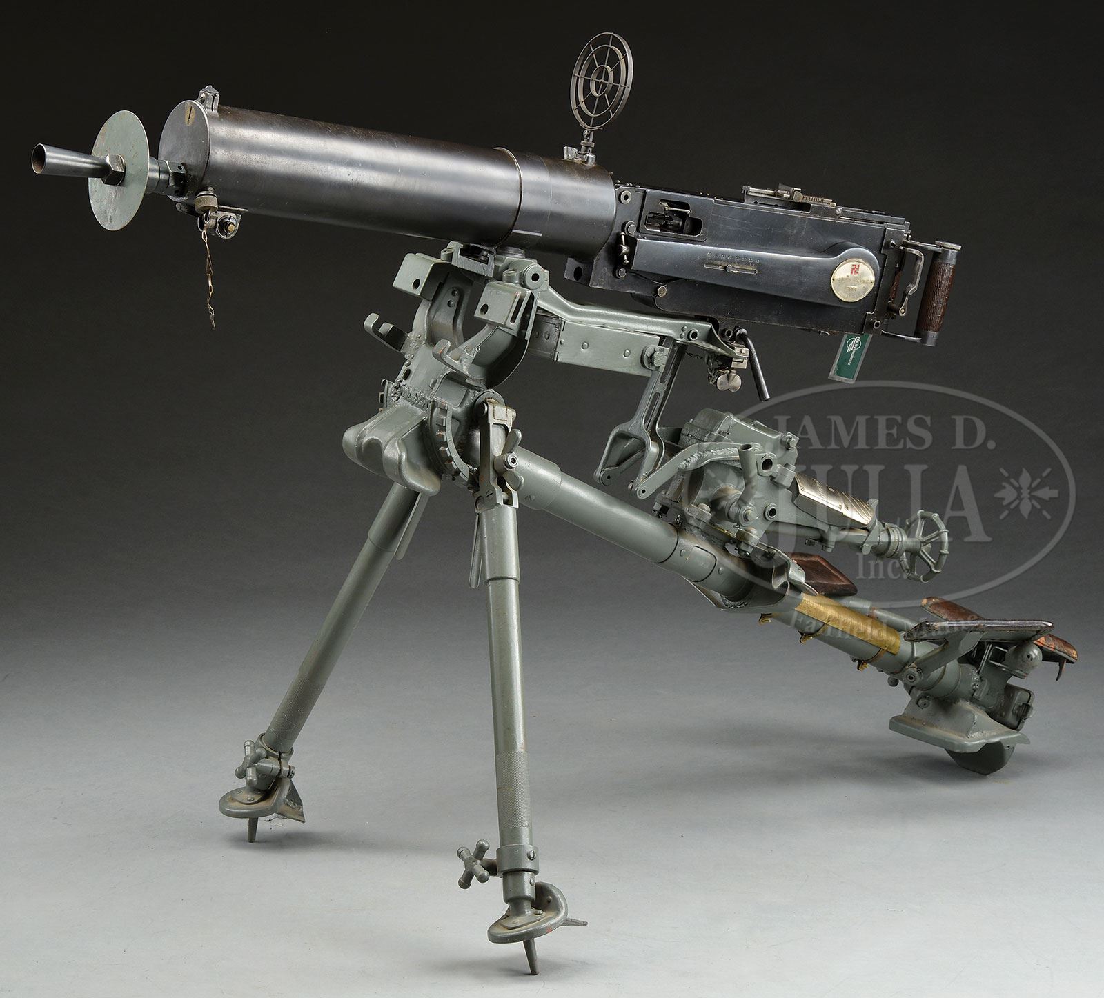 **EXTRAORDINARY MINT CONDITION CHINESE MAXIM TYPE 24 (1935) MACHINE GUN (C&R).SN C1201. 8 mm. 24″ bbl. Extremely rare complete and matching Chinese Maxim Type 24 with tripod, AA sight, matching spare lock and bbl, as well as orig gunner’s kit in pouch SN to gun. Pouch contains brushes, broken case extractor, steel and brass punches and asbestos gasket material for muzzle and trunnion bearings; also contains an all leather funnel for filling water jacket and a spare parts tin which contains springs, pins and other small parts for lock and gun. Marked in Chinese which translates to, “79 Makequin Heavy Machine Gun”, and “Military Manufacture Department Number 21. One of very few registered and complete specimens in United States this is one of the four Chinese Maxims sent by China for to the United States in 1948 to test 8mm Mauser ammunition. This gun found its way into the hands of Dolf Goldsmith and subsequently Michael King Smith and The Evergreen Collection. Details may be found in The Devil’s Paint Brush publication by Dolf Goldsmith (p 328). This weapon was also apparently in the possession of another noted firearms enthusiast in Arizona; the bottom of the trunnion is marked, “JPL T AZ85653”. All numbered parts appear to be matching including spare bbl and bolt within tripod. Mechanism functions smoothly when operated by hand. This weapon appears fully functional. PROVENANCE: Ex-Dolf Goldsmith collection; The class III weapons formerly on loan to Evergreen Aviation & Space Museum. CONDITION: Overall finish and appearance is excellent. Over 95% lustrous blue finish. Remains of olive green paint on water jacket in spots just forward of ejection port and where gun attaches to tripod as well as about 90% coverage on muzzle shield. Extremely high quality manufacture and fitting including checkered wooden handles. Fusee cover data plate has some slight brassing along high edges and there is a small chip out of the red enamel of a swastika. Brown leather gunner’s pouch is stiff and strong with some brassing to edges and scrapes and male brass snaps on front cover are not present. Tripod retains over 95% of its gray/green paint. Brass data plate with SN matching gun affixed to elevation mechanism. Leather pads on seat and knees are intact and serviceable. Bore is shiny and bright with strong rifling. Bolt face is excellent. Mechanism is stiff but operates properly. This gun is very clean and makes an outstanding display piece. Just about impossible to upgrade the condition on this exceedingly rare piece. 4-51725 JWK15 (30,000-50,000) – Lot 1013