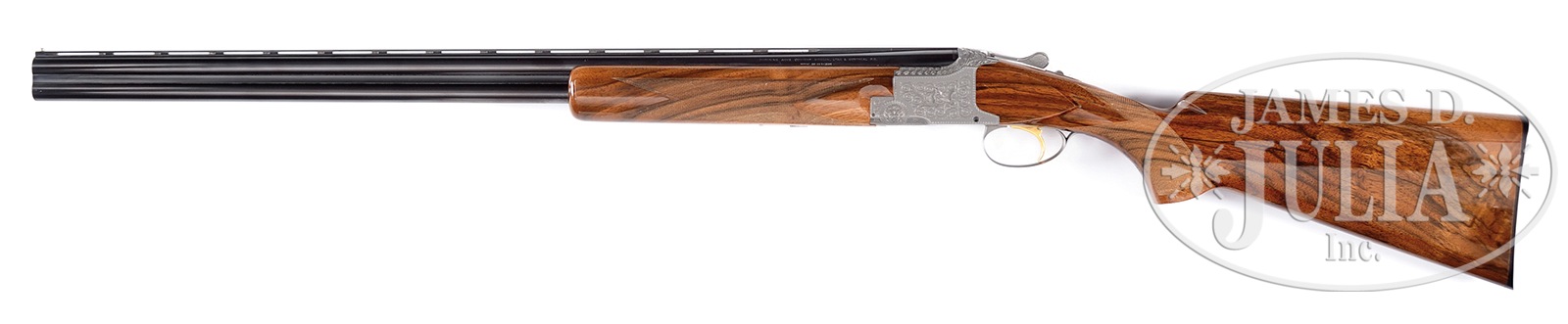 *BROWNING PIGEON GRADE SUPERPOSED POST SALT ERA SHOTGUN.SN 3248V73. Cal. 20 ga. 28″ bbls, 3″ chambers, chokes marked MOD/FULL. Ventilated rib, front metal bead. Auto ejectors. Pigeon Grade engraved receiver with a pair of pigeons engraved both right & left sides with floral rosettes on bottom. Gold washed single selective trigger. Buttstock & forend are lovely pieces of light colored walnut with dark streaks of grain and figure. Stock configuration FTLT. Browning marked buttplate. Non-automatic safety. LOP 14-1/8″. PROVENANCE: Remarkable William Larkin Moore Private Estate Collection of Fine Sporting Arms. CONDITION: Very good plus. Lustrous bbl blue which shows faint lines ahead of forend. Condition of receiver & other metalwork fine with hardly a mark. Stock & forend with beautiful gloss finish with the tiniest of handling marks. Sharp checkering. Top lever right. Tight gun, nice mechanics, ejectors are strong. 50595-36 TJW (4,500-7,500) – Lot 1013