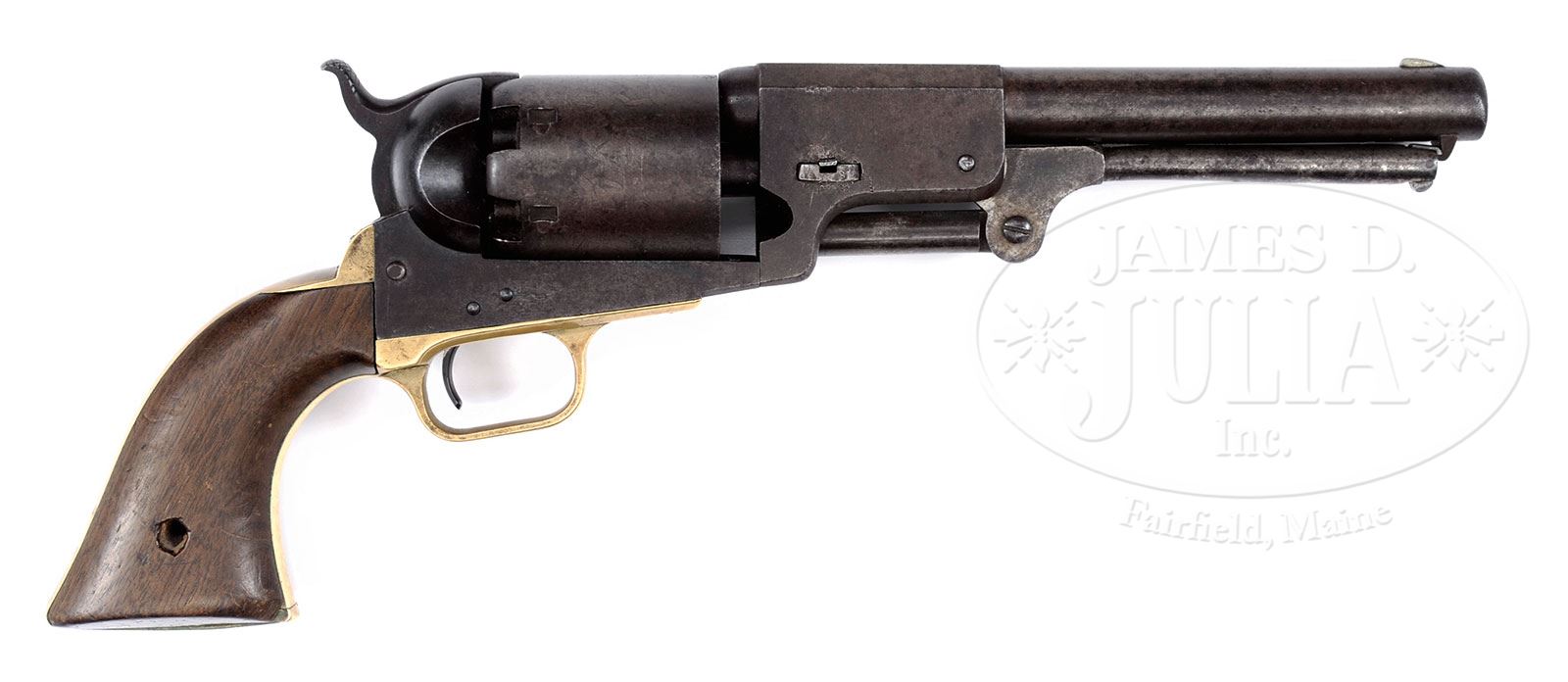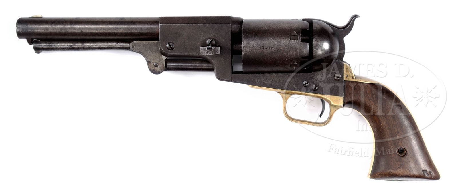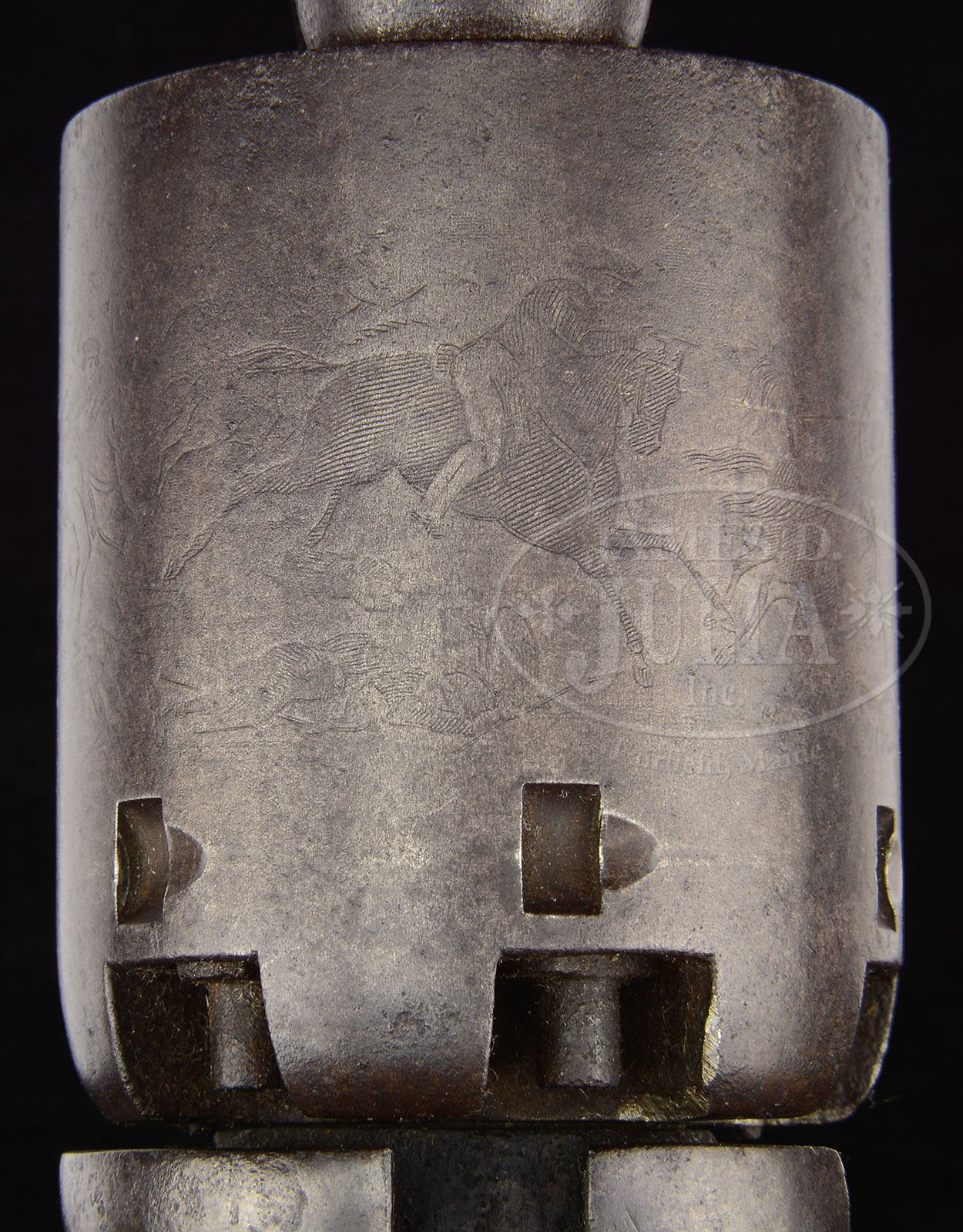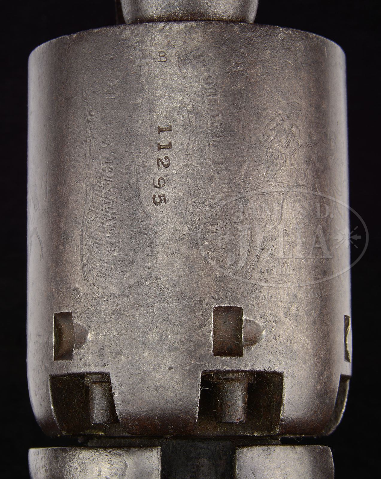 MARTIALLY MARKED COLT THIRD MODEL DRAGOON PERCUSSION REVOLVER THAT BELONGED TO ELMER KEITH.SN 11295. Cal. .44. Usual configuration with 7-1/2″ oct to rnd bbl, nickel silver front sight & 1-line New-York City address with brackets. Left side of frame is marked “COLTS PATENT” over a tiny “U.S.”. Cylinder is usual six chambers with dragoon/Indian fight scene roll marking and has “MODEL U.S.M.R. / COLT’S PATENT” panels surrounding SN. The unplated brass trigger guard & backstrap contain a 1-pc walnut grip with matching SN in backstrap channel. Left side of grip has the outline of a military inspector cartouche and there are small inspector initials on various parts. Grip has a hole through the grip just at top of cartouche which was probably cut for a lanyard by the mounted trooper who used the gun. A note attached to this revolver from the Keith family states “Colt Dragoon .44 / Confederate General / Casey’s Dragoon”. There were about 10,500 of these revolvers produced 1851-1861. They were mostly all issued to active, front line units fighting Indians out West, primarily in the Southwest, Texas, New Mexico and Arizona. These revolvers usually saw very hard service during that period and remained in service throughout the Civil War with many being captured and used by the Confederates. PROVENANCE: The Elmer Keith Estate Collection. CONDITION: Fine, all matching including rammer, wedge, cyl & grip. Overall retains a mottled dark brown patina with some fine pitting on right side of bbl. Right side of muzzle shows heavy holster wear. Frame is smooth dark patina as is the cyl. Cyl shows 60-70% dragoon Indian fight scene roll marking with the cartouches around SN mostly all legible. Trigger guard & backstrap are a light mustard patina. Grip has a couple chips in left heel & a chipped right toe and shows heavy wear with a hand-worn patina. Mechanics are fine, crisp strong bore with good shine & scattered pitting. 4-47993 JR252 (5,000-8,000) – Lot 1015 Click here to view provenance