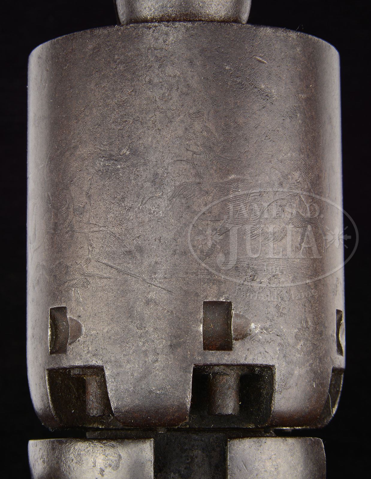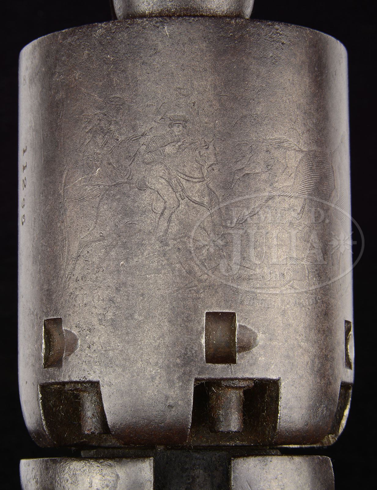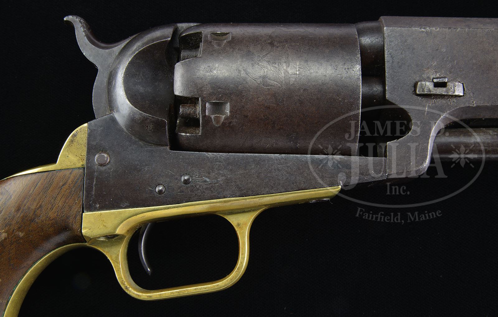 MARTIALLY MARKED COLT THIRD MODEL DRAGOON PERCUSSION REVOLVER THAT BELONGED TO ELMER KEITH.SN 11295. Cal. .44. Usual configuration with 7-1/2″ oct to rnd bbl, nickel silver front sight & 1-line New-York City address with brackets. Left side of frame is marked “COLTS PATENT” over a tiny “U.S.”. Cylinder is usual six chambers with dragoon/Indian fight scene roll marking and has “MODEL U.S.M.R. / COLT’S PATENT” panels surrounding SN. The unplated brass trigger guard & backstrap contain a 1-pc walnut grip with matching SN in backstrap channel. Left side of grip has the outline of a military inspector cartouche and there are small inspector initials on various parts. Grip has a hole through the grip just at top of cartouche which was probably cut for a lanyard by the mounted trooper who used the gun. A note attached to this revolver from the Keith family states “Colt Dragoon .44 / Confederate General / Casey’s Dragoon”. There were about 10,500 of these revolvers produced 1851-1861. They were mostly all issued to active, front line units fighting Indians out West, primarily in the Southwest, Texas, New Mexico and Arizona. These revolvers usually saw very hard service during that period and remained in service throughout the Civil War with many being captured and used by the Confederates. PROVENANCE: The Elmer Keith Estate Collection. CONDITION: Fine, all matching including rammer, wedge, cyl & grip. Overall retains a mottled dark brown patina with some fine pitting on right side of bbl. Right side of muzzle shows heavy holster wear. Frame is smooth dark patina as is the cyl. Cyl shows 60-70% dragoon Indian fight scene roll marking with the cartouches around SN mostly all legible. Trigger guard & backstrap are a light mustard patina. Grip has a couple chips in left heel & a chipped right toe and shows heavy wear with a hand-worn patina. Mechanics are fine, crisp strong bore with good shine & scattered pitting. 4-47993 JR252 (5,000-8,000) – Lot 1015 Click here to view provenance