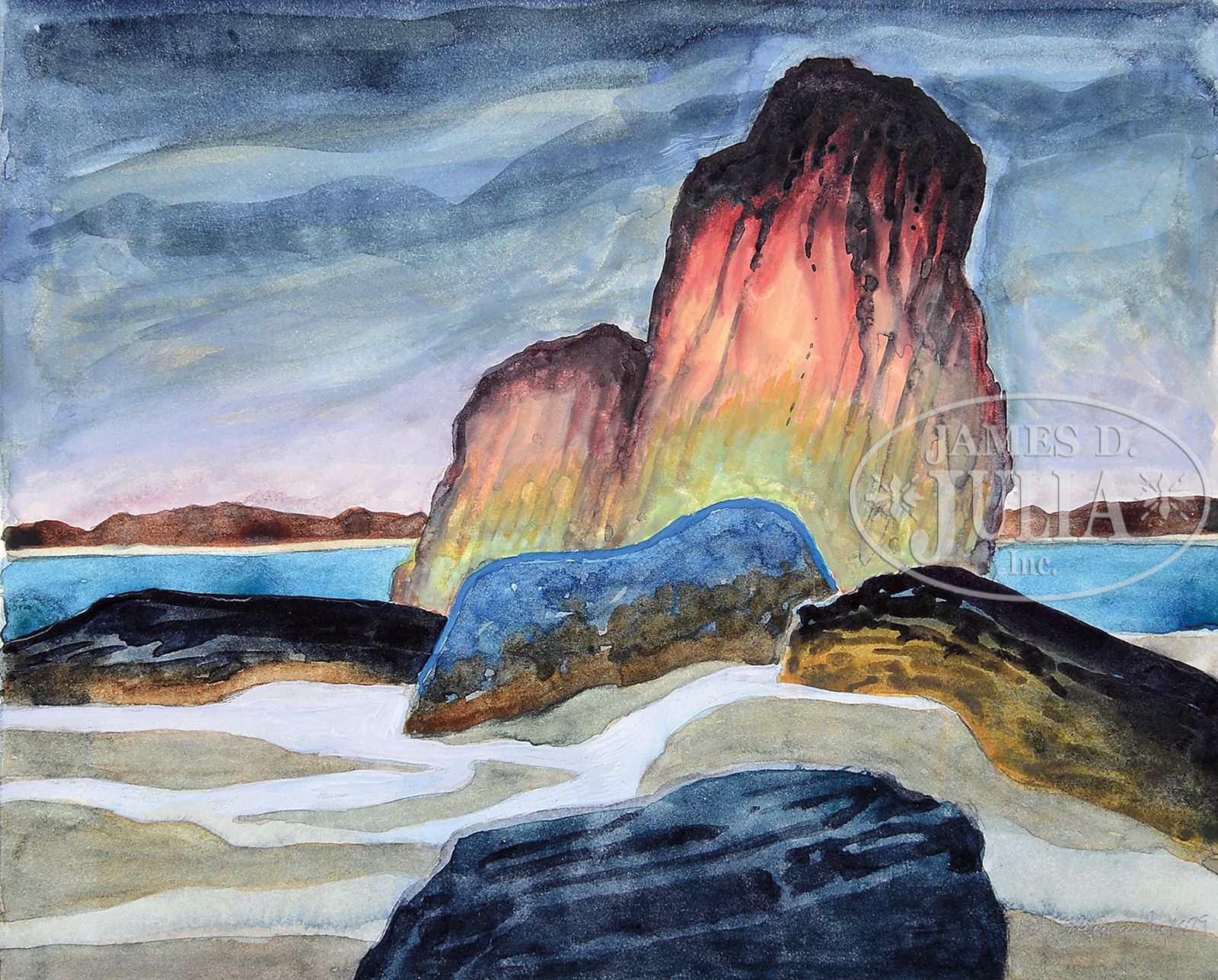 DANIEL HODERMARSKY (American, 1924-1999) COLORFUL ROCKS ON SHORELINE – DEER ISLE?.Watercolor on paper Presently matted Signed lower right “D. Hodermarsky 1979″ in pencil Reference: There is very little listed on this artist. There are three 1-man shows, two on Deer Isle, ME and one in Deerfield, MA. A listing of many other shows is provided with the lot. Daniel was employed as an art instructor at Deerfield Academy from 1969-1989 SIZE: Image: 7″ x 8-3/4” CONDITION: Very good 49186-3 (300-900) – Lot 1015