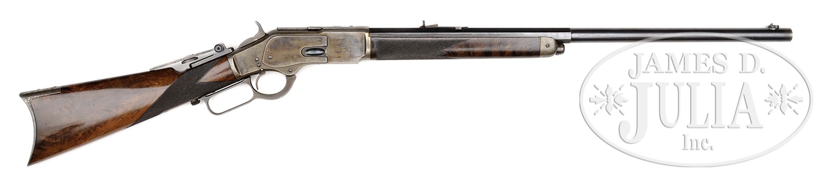 SCARCE SPECIAL ORDER DELUXE WINCHESTER 2ND MODEL 1873 LEVER ACTION RIFLE.SN 30863. Cal. 44 WCF (44-40). Fine deluxe ’73 with 24-1/4 oct to rnd bbl, button magazine, ivory bead Beach’s combination front sight, short semi-buckhorn rear sight with checkered edges and a thick base sporting tang sight with 4″ staff. Mounted with highly figured, flame grain, center crotch American walnut that has early style checkered forearm and straight stock with crescent buttplate with trap. Receiver is 2nd type with attached rail mounting and impressed thumbprint dust cover. Left side of lower tang under the wood is marked with the assembly number “105” which number is also found, in pencil in the top tang channel of buttstock and inside toe buttplate. Accompanied by a Cody Firearms Museum letter which identifies this rifle with 1/2 oct bbl, plain trigger, checkered stock, peep & Beach sights, 1/2 magazine and case hardened, received in warehouse Sept. 28, 1878 and shipped June 27, 1879 to Order number 15979. There is another ship date of Oct.2, 1878, Order #13242 which is crossed out. This rifle was produced at a time when business or pleasure was conducted from the back of a horse, wagon or buggy which exposed these firearms to the harsh elements usually with little maintenance. Firearms of this era are rarely found today with high orig finish. PROVENANCE: Tommy Rholes Estate Collection. CONDITION: Very fine. Bbl retains 85-88% orig blue showing sharp edge wear on the oct section and thinning on the rnd section. Receiver and side plates retain about 80% orig case colors, moderately to heavily faded, stronger on the left side, turned silver on the bottom; lever & hammer retain strong case colors, faded to silver on outer faces of lever. Forearm has about a 3″ repaired crack by the bbl channel at the left front end, otherwise wood is sound with light nicks and scratches. Buttstock retains about 95% strong, orig piano varnish finish and forearm retains most of a restored finish. Mechanics are fine. Bright shiny bore. 4-50521 JR28 (22,500-32,500) – Lot 1016