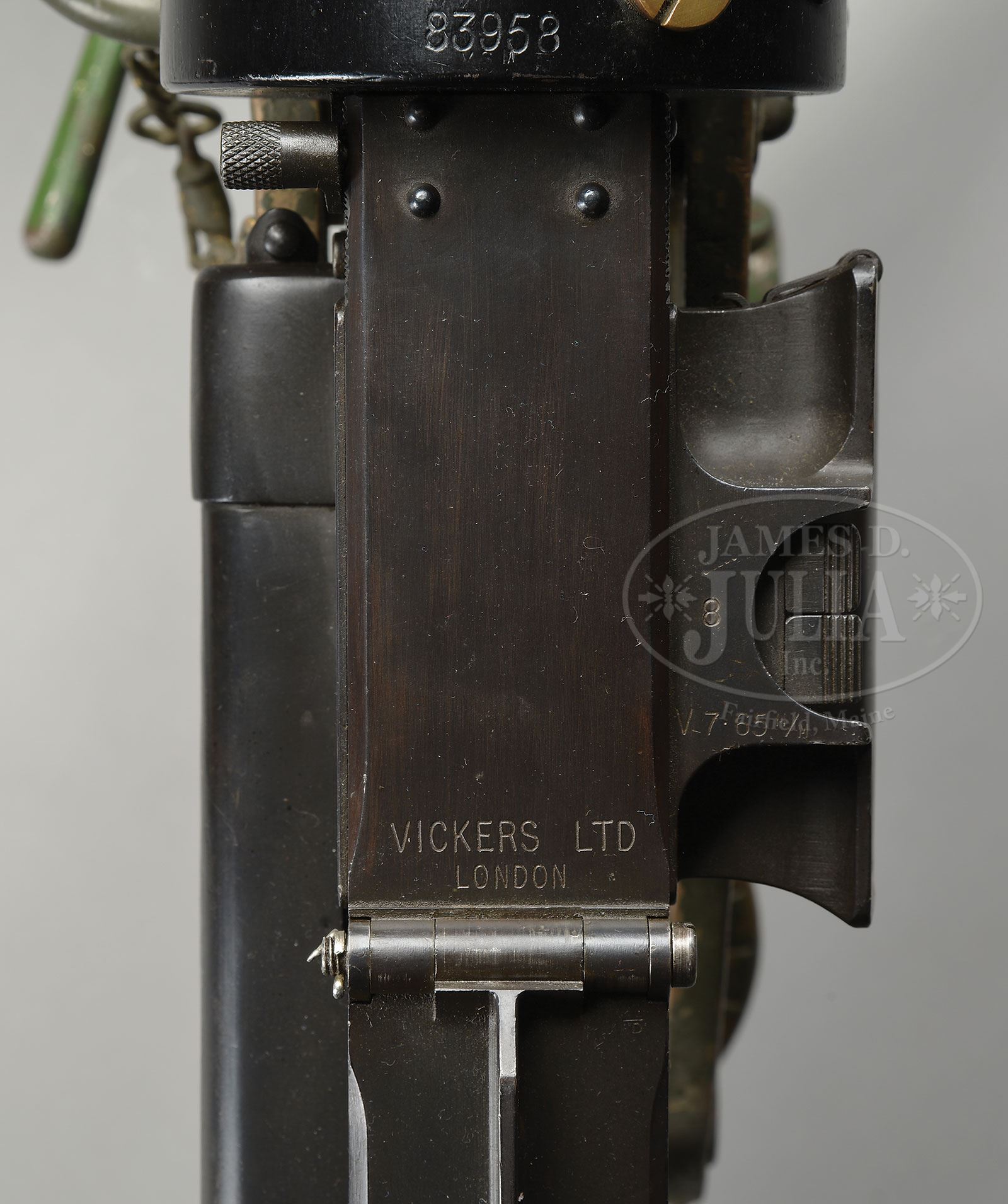 **BRITISH VICKERS MODEL 1930 MARK I MACHINE GUN MADE FOR ARGENTINE ARMY (C&R).SN 83958. 7.65 Argentine. 24″ bbl. Vickers water cooled machine gun in its short, fluted jacket configuration for export to Argentina to be used on a motorcycle mount. Marked on top of feed shuttle cover “VICKERS LTD LONDON”. Overall gun is liberally marked with “VSM”, all parts appear to be matching. Feed shuttle is marked “8”/”V 7.65 M/M”. Cross bolt is marked “VSM/8”. Bolt is also marked “8 VSM” / “7.65 M/M”. Backplate is also marked “VSM”. Bottom of right sideplate is marked “JPL T AZ85653”, which indicates that at one time this arm was in the possession of a noted firearms enthusiast in Arizona. Muzzle booster is of the armored type. Orig brass chains and cork retaining hardware present, cork is not present which in an easy replacement. Included is “42” dated steam condensing hose, water can with attached funnel and standard Mark IV Vickers ground tripod. Mechanism functions smoothly when operated by hand. This weapon appears fully functional. PROVENANCE: Ex-Dolf Goldsmith collection; The class III weapons formerly on loan to Evergreen Aviation & Space Museum. CONDITION: Overall finish and appearance is excellent. Over 95% lustrous blue commercial refinish with some loss of finish at high points with some areas of slight pitting. Water jacket has heavy coating of black enamel with a couple noticeable runs in paint. Brass filler and drain screw have a pleasing patina. Muzzle booster is in very clean condition and numbered to gun. Wooden handles are in extremely fine condition with only the slightest of handling marks. Brushes marked “VSM” are present and serviceable. Bore has worn rifling with some darkness in grooves. Bolt face is excellent. Tripod has been repainted in a non orig bright green on lower half; cradle retains 80% of its orig olive drab green paint over brass; retaining pins and chains are present; mechanisms function properly. Water can has been repainted black enamel over orig black paint; paper seal present in cap; steam condensing hose with brass fitting has a couple of cracks but still appears serviceable. This is a real treasure to the discerning Vickers collector, lighter than most water cooled Vickers and a relatively straightforward conversion to 30-06 or .308 and an outstanding display piece as well. 4-51717 JWK21 (14,000-18,000) – Lot 1016