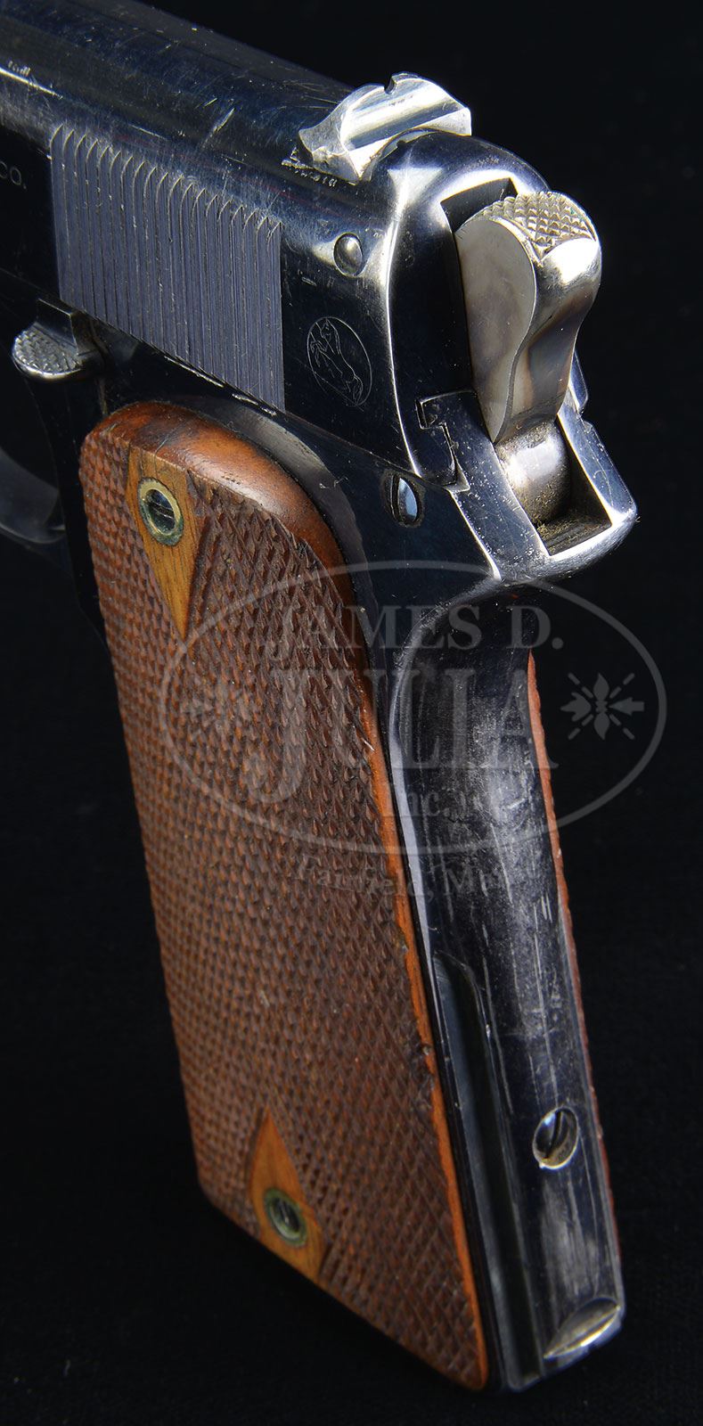 *EXTREMELY RARE COLT MODEL 1905 SEMI-AUTO PISTOL WITH ORIGINAL LEATHER HOLSTER STOCK THAT BELONGED TO ELMER KEITH.SN 883. Cal. .45 ACP. Blue finish with 5″ bbl, orig fixed sights with thin front blade & round top, round notch rear sight. Slide has usual markings on both sides with Rampant Colt in a circle on left rear. Left side of frame, over the trigger area is marked with the SN. Mounted with diamond checkered walnut grips. Accompanied by one orig, all blue magazine. Also accompanied by an orig black leather covered, metal framed holster stock with brown leather lining. There were about 6,000 of these pistols produced 1805-1911 but only a few had the grooved backstrap for stock attachment & extremely few still have an orig stock. This pistol was Mr. Keith’s property and is pictured on p. 101 in Six Guns, Keith. Undoubtedly, Mr. Keith would have studied this pistol & cartridge during the developmental years working on the number of cartridges that he personally designed during his life. PROVENANCE: The Elmer Keith Estate Collection. CONDITION: Very fine. Overall retains 88-90% glossy orig blue, showing holster wear around muzzle & sharp edges and along the slide. Frontstrap has some candy striping and stock wear on backstrap. Hammer retains strong case colors. Grips are sound showing light diamond point wear with very little hand oil staining. Mechanics are crisp, bright shiny bore with some minor scuffing in the grooves. Holster stock has a small separation in the flap hinge but is overall sound showing edge wear & light scuffs, retaining about 75% orig black finish. Even without Mr. Keith’s connection, this is a rare pistol & holster combination. 4-48011 JR235 (10,000-15,000) – Lot 1016
