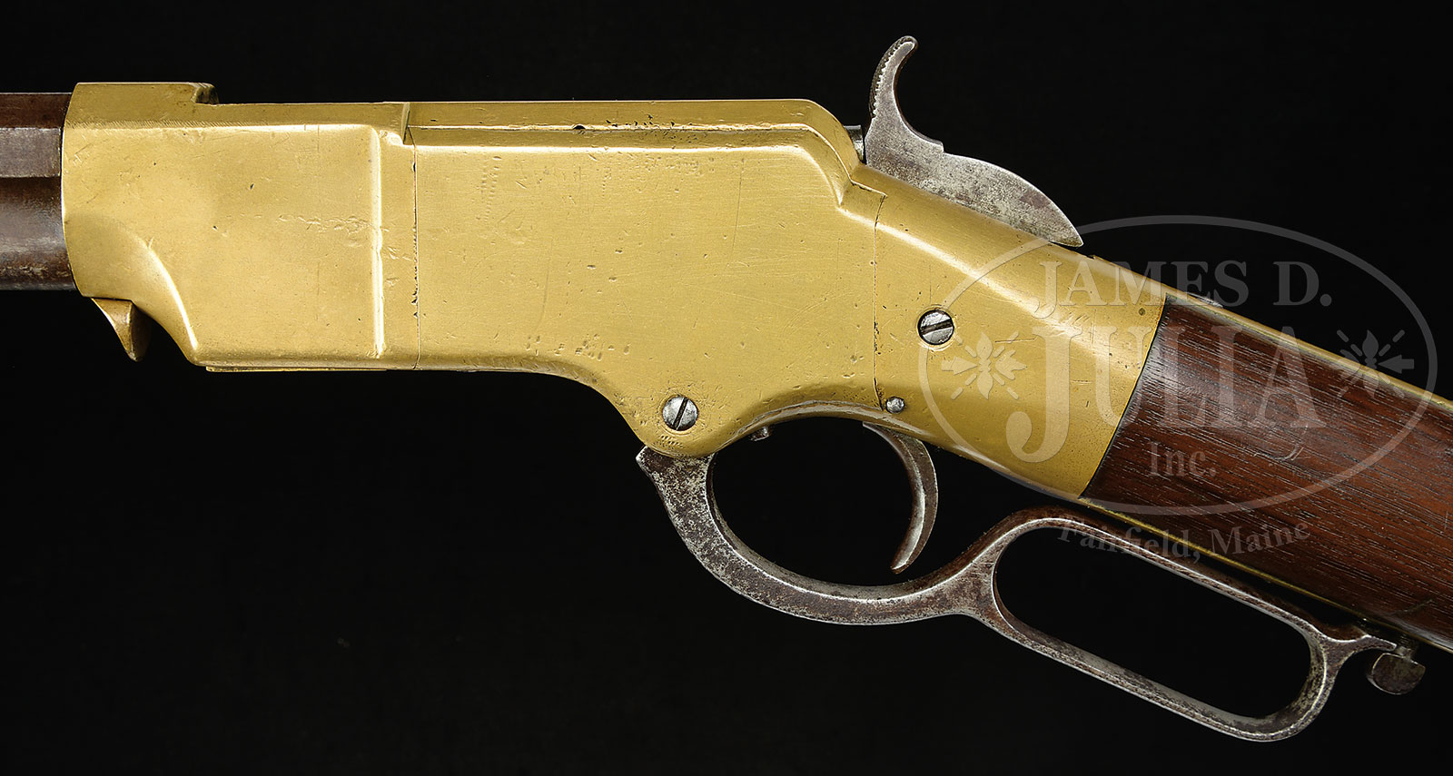 HENRY MODEL 1860 LEVER ACTION RIFLE.SN 8611. Cal 44 RF Henry. Standard Henry rifle with 24-1/4″ oct bbl. Integral magazine with German silver front sight blade and 900 yard Henry ladder rear sight. Top flat of bbl has standard 2-line Henry patent date and company address. Mounted with uncheckered straight grain American walnut buttstock that has straight grip and crescent brass buttplate with trap. Left side of buttstock has factory sling swivel with discernible “Henry Bump” below. Left side of bbl has a corresponding sling loop. This rifle was produced in 1865, probably about the culmination of hostilities of the Civil War. It may or may not have seen service during the war, but most certainly would have been used on the American frontier during the great westward expansion of Manifest Destiny. Arms of that era generally saw extensive hard service under extreme conditions, usually with little or no maintenance. CONDITION: About good, all matching. No orig finish remains with the bbl & magazine being a mottled gray/brown patina with scattered nicks & dings from hard service. Receiver & side plates show rounded edges with nicks, dings & scratches. Hammer is a mottled gray/brown patina and the lever is heavily pitted. Buttstock has a couple of hairlines in the right wrist, otherwise is sound with a couple of gouges and shows an old restored finish. Mechanics are fine. Strong sharp bore with moderate pitting. 51378-3 (9,000-12,000) – Lot 1016