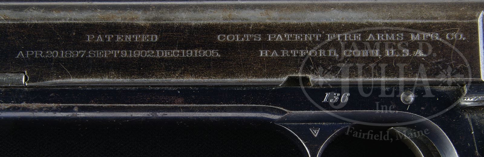 *RARE COLT MODEL 1905 SEMI-AUTO PISTOL & RARE AUDLEY HOLSTER THAT BELONGED TO ELMER KEITH.SN 136. Cal. .45 ACP. Blue finish with 5″ bbl & orig fixed sights. Slide has standard markings & Rampant Colt in a circle on the left rear. Mounted with diamond checkered walnut grips. Top screw of left grip is missing. Accompanied by one orig all blue magazine. Also accompanied by a rare Audley brown leather holster with long drop belt loop and an unusual flap attached to a brass wire through the belt loop which secures over a brass stud on front of holster. Inside the holster has a spring loaded nickel-plated brass lock button which secures through the trigger guard with the pistol firmly seated and keeps the pistol secure until depressed. Only about 6,100 of these pistols were produced 1905-1911 and were the forerunner of the incredibly durable Colt Model 1911 Semi-Auto pistol. These pistols were without a manual safety, relying only on the safety notch of the hammer, a situation which was remedied in the later models with the addition of both grip & thumb safety. Mr. Keith wrote several times about testing the .45 automatic for long range target shooting & hunting. It seems likely that he would have used this pistol during those tests and would have tested various hand loads in the process. PROVENANCE: The Elmer Keith Estate Collection. CONDITION: Very good to fine. Overall retains 65-75% orig blue showing heavy holster wear & thinning on the slide. Right front side of the slide, by the wedge slot, has a small crack, probably from overpowered loads by Mr. Keith. Front edge of slide on both sides has fine pitting. Hammer retains strong case colors & the trigger about 50% fire blue. Grips are sound showing moderate wear with the aforementioned missing screw. Mechanics are fine, strong bore with good shine & light pitting. Magazine shows moderate wear & retains about 75% orig finish. Holster is sound with light nicks & scuffs and retains most of its orig russet brown finish. 4-48012 JR254 (4,000-7,000) – Lot 1017