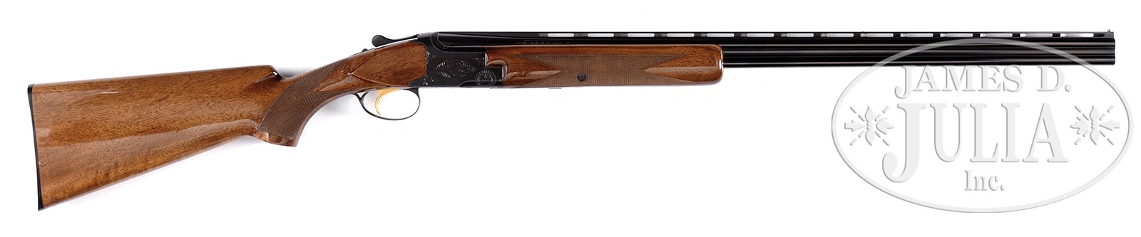 SN 115J72. Cal. .410. 28″ bbls, ventilated rib, 3″ chambers, chokes marked M/F. Single bead sight. Auto ejectors. Single selective trigger. Grade 1 style engraving. FKLT stock configuration. Browning marked buttplate. LOP 14-1/4″. Non-auto safety. PROVENANCE: Remarkable William Larkin Moore Private Estate Collection of Fine Sporting Arms. CONDITION: Very good plus. Gun retains most of what appears to be factory blue, scattered handling marks & small area of light oxidation on bottom bbl. High edge wear to blue on receiver. Bores appear bright but would benefit from cleaning. Wood has a number of slight dings & marks which appear to be under gloss finish. Checkering sharp. Slight wear to buttplate. Gun is tight, crisp mechanics. Strong ejectors. 50595-31 TJW (3,500-5,000) – Lot 1017