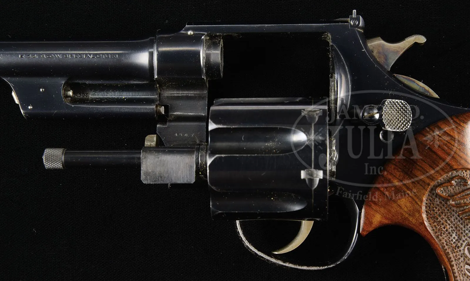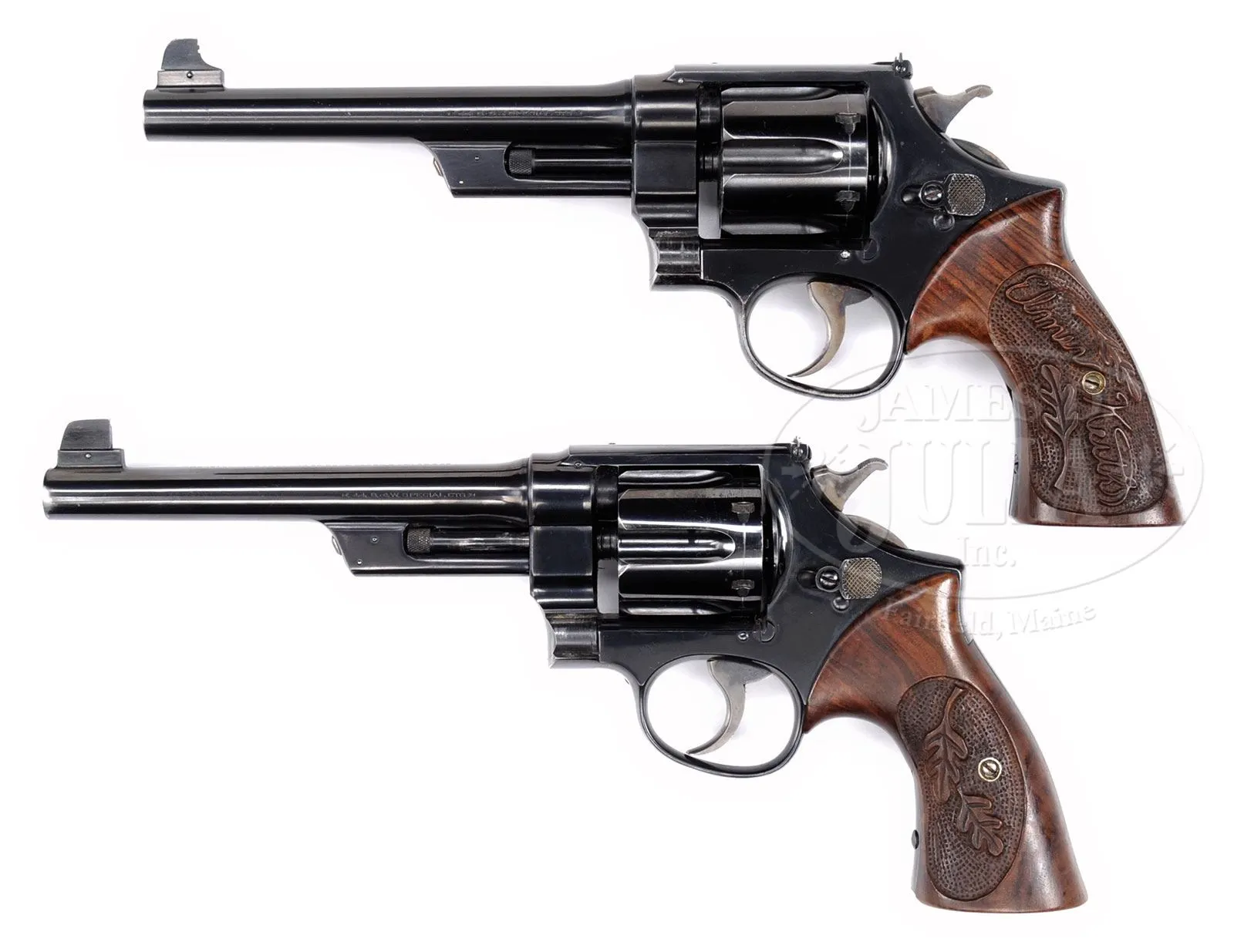 *IMPORTANT SMITH & WESSON HAND EJECTOR FIRST MODEL (TRIPLE LOCK) TARGET DA REVOLVERS WITH RARE BERNS-MARTIN DOUBLE HOLSTER RIG THAT BELONGED TO ELMER KEITH.SN 14145 & 6146. Cal. .44 Special. Revolvers are virtually identical with 6-1/2″ bbls, one with Call gold bead front sight and the other with Mr. Keith’s “long range” modified thick front sight blade with two gold bars for distance shooting. Both have round top straps with adjustable sights. Frames are 5-screw type and the cranes have a third fastener in the ejector rod housings. Both have standard color case hardened hammers & smooth triggers. Revolvers are mounted with mirror-image Magna-sized burl walnut 2-pc grips, carved on one side with deep relief “Elmer Keith” and oak leaves, and the other grip with oak leaves. All the carving has a coarse stippled background. Revolver #6146 has a small 5-pointed star by the SN on the buttstrap which indicates factory refinish; Accompanied by a rare double holster rig by the Berns-Martin Co. consisting of left & right hand permanently mounted, full basketweave tooled, front opening spring holsters with thumb straps across the front. They are mounted to a 3-1/2″ wide lined cartridge/money belt that is matching tooled and has a double row of sewn-on cartridge loops for fifty-eight .44/.45 caliber cartridges. Belt has a short, sewn-on tongue billet and a square, cut corner nickeled brass buckle. Rig is completely unmarked. Mr. Keith is pictured on pgs. 150, 162 & 165 of Mr. Keith’s book Six Guns, wearing this exact rig, demonstrating fast draw & shooting. The entire rig, with two 1917 revolvers, is pictured on p. 163 of the referenced publication. The caption to one of the pictures on p. 162 states that one of the revolvers is a Triple Lock .44 Special. These revolvers will letter from Smith & Wesson as follows: #6146 is a first Model hand ejector in .44 Special with 6-1/2″ bbl shipped February 18, 1913 to Lovell Brothers Seal Co. Boston, MA. #14145 is identical shipped December 14, 1917 to Stanbaugh-Thompson Co. Youngstown, OH. PROVENANCE: The Elmer Keith Estate Collection. CONDITION: #6146 is very fine to extremely fine. Overall retains 96-97% strong, deep, restored factory blue with light muzzle end & some sharp edge wear. #14145 is extremely fine. Overall retains 97-98% crisp orig blue with very light muzzle end & sharp edge wear and a light cylinder line. Triggers & hammers on both revolvers show strong case colors. Both sets of grips extremely fine showing little or no use. Mechanics of both revolvers are crisp & sharp with fine-tuned actions and 2-1/2 to 3 lb triggers. Holsters & belt are very fine to extremely fine showing very light wear with solid cartridge loops. The thumb strap snap on left holster has separated from its base. 4-48016 JR246 (6,000-10,000) – Lot 1020 Click here to view provenance