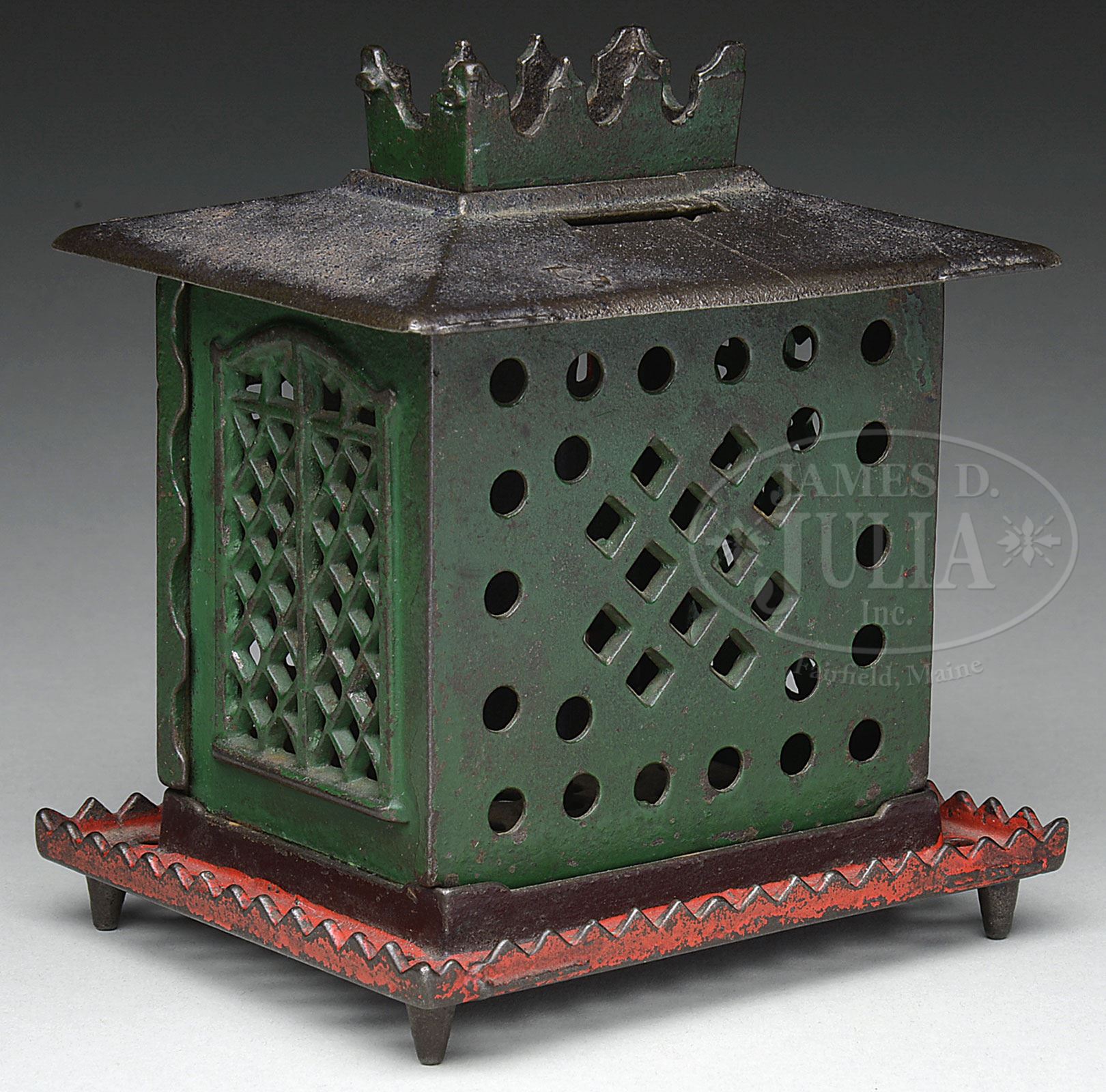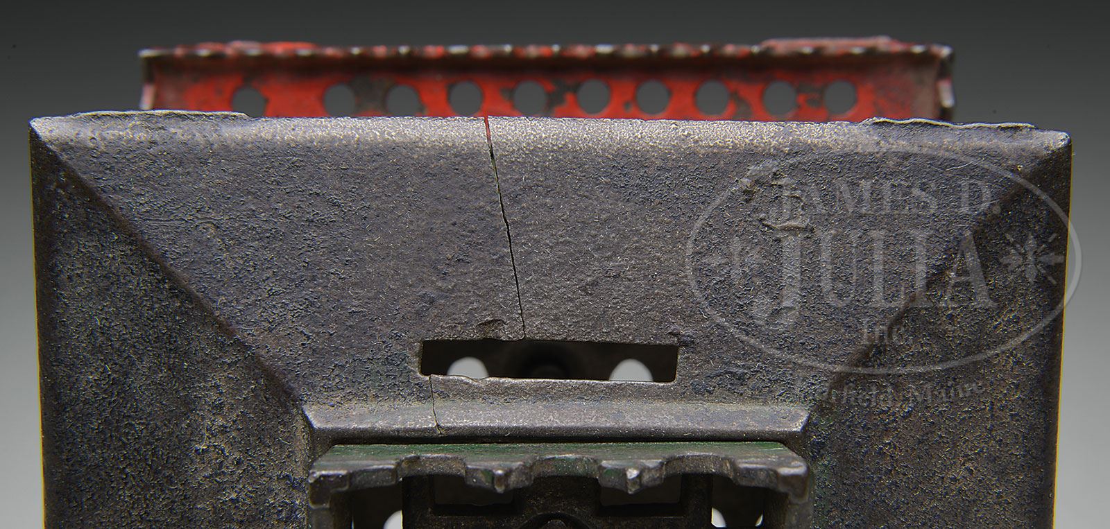 PAINTED LARGE CROWN “BANK” ON LEGS BY J. & E. STEVENS.A desirable painted still bank with an aesthetically appealing form, the building itself is situated on a scalloped base standing upon four tapered legs. Enameled in a dark green with red highlighting and dotted squiggly trims on the front corner supports. A tough bank to find and quite appealing, and yet so different than its small brother sold in the previous lot. SIZE: 4-1/4″ x w 3-1/2″ d x 4-3/4″ t. PROVENANCE: The Estate of Carol and Jerry Soling. CONDITION: Overall very good plus. Hairline on roof extending from coin slot on right and left sides. 1-14667 (800-1,200) – Lot 1020 Auction: Advertising, Toy & Doll Auction - Fall 2014 Please Note: All prices include the hammer price plus the buyer’s premium, which is paid by the buyer as part of the purchase price. The prices noted here after the auction are considered unofficial and do not become official until after the 46th day. |