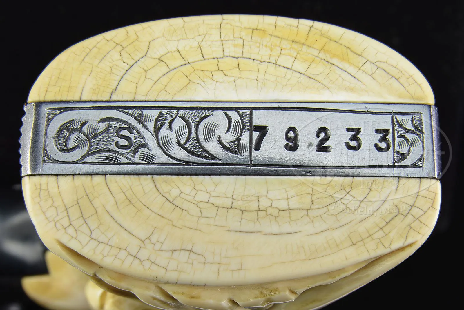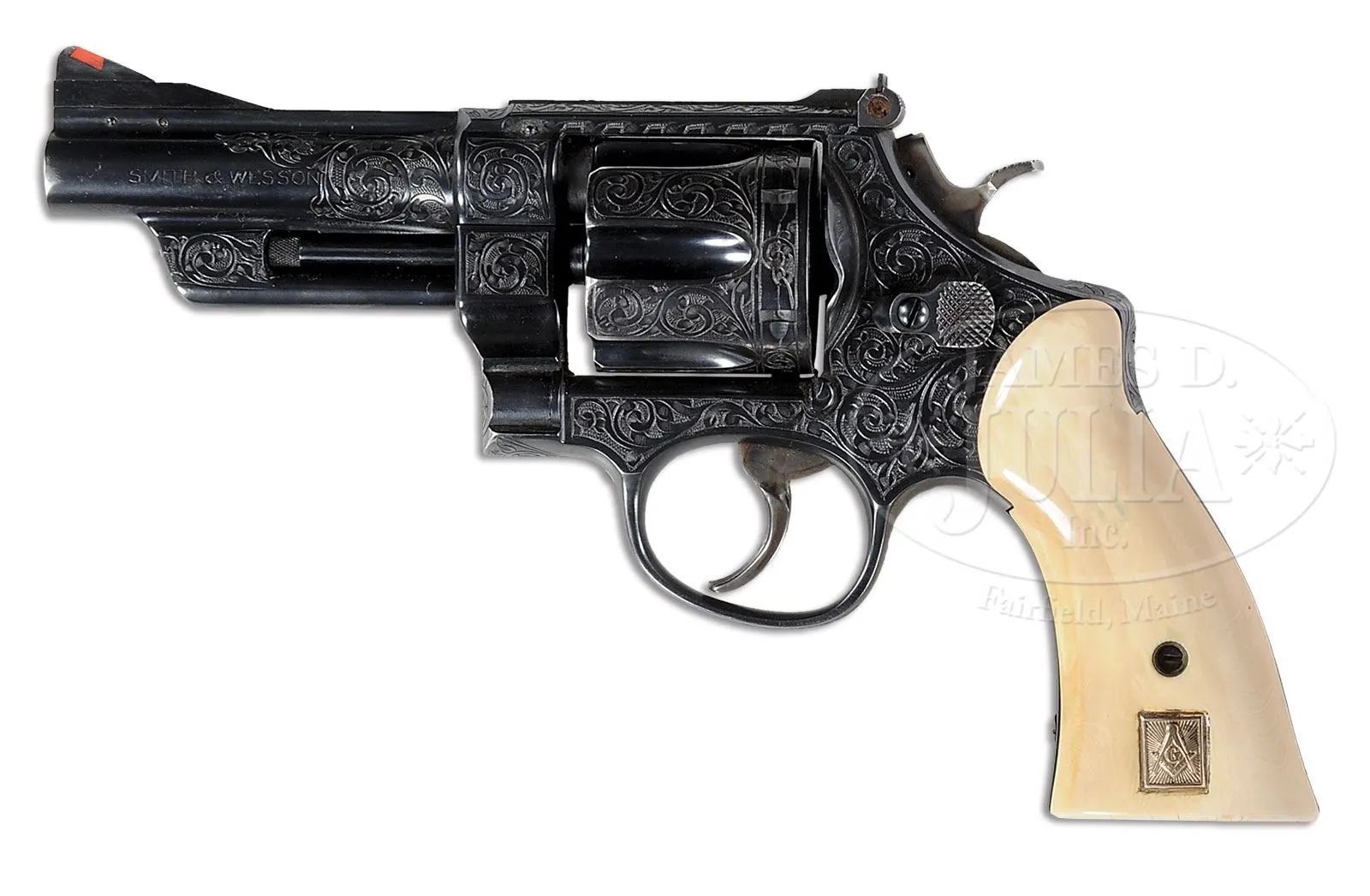 *ENGRAVED RARE SHORT BARRELED SMITH & WESSON MODEL 1950 TARGET DA REVOLVER THAT BELONGED TO ELMER KEITH.SN S79233. Cal. .44 Special. Blue finish with rare 4″ ribbed bbl, red ramp front sight and white outline adjustable rear sight. It has standard trigger & hammer. Mounted with 2-pc Magna-sized pre-ban African ivory grips with deep relief carved ox head on right side and a 1/2″ square inlaid gold Masonic emblem on the left. Revolver is beautifully engraved in flowing foliate arabesque patterns with nearly full coverage on the frame. Engraving extends up both sides of bbl & onto the ejector shroud. Cylinder is engraved to match on the outer diameter with the flutes not engraved. Frame is 5-screw type. Right side plate is engraved “Elmer Keith”. This revolver will letter from Smith & Wesson as a .44 Target model of 1950, shipped April 20, 1951 to Elmer Keith. It letters with 4″ bbl, blue finish and Baughman front sight. It was charged to the advertising account and the invoice was marked “Mr. Keith has for many years been a very good friend of S&W and assisted in the development of the 357 Magnum. He is now connected with the National Rifle Association as one of the editors of the Technical Department. This presentation has been authorized by Mr. Hellstrom and Mr. Austin.” A copy of this document accompanies this revolver. The engraving is not mentioned in the records, however the inscription on the sideplate is exactly like others presented by Smith & Wesson to Mr. Keith. Accompanied by a Lawrence Model 34F tooled brown leather belt holster. This revolver appears to be 3rd from the top in a picture on p. 179 of Mr. Keith’s book Six Guns. At that time, it still sported its orig diamond checkered walnut grips. This revolver was another of Mr. Keith’s carry guns and has a wonderful, crisp, tuned action. Special Note: This item contains or is made of ivory. Do not bid on this lot unless you have read and agreed to our “Ivory Position Statement” and the “Waiver of Legal and Financial Risk to James D. Julia in regards to your Purchase of an Ivory Object”. This information is located in our catalog on pages 30 and 31. PROVENANCE: The Elmer Keith Estate Collection. CONDITION: Very fine. Overall retains 96-97% strong dark blue showing only light holster wear on muzzle & sharp edges. Hammer retains strong case colors & the trigger faded case colors, mostly a bright polished metal finish. Grips are sound showing a light golden ivory patina. Mechanics are crisp, bright shiny bore. Holster is fine. 4-48014 JR245 (4,000-7,000) – Lot 1021 Click here to view provenance