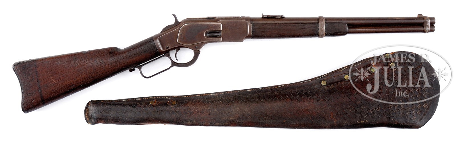 RARE WINCHESTER MODEL 1873 SADDLE RING CARBINE TRAPPER MODEL WITH 16″ BARREL IN A SADDLE SCABBARD MADE BY W.S. DUNBAR OF ALPINE, TEXAS.SN 324028B. Cal. 44 WCF. 16″ bbl. Blue finish. Straight grained American walnut stocks. Bbl is orig 16″ length with standard carbine sights and 2-line bbl address in front of bbl band. Cal. mark behind rear sight. Receiver is of stepped type with standard markings on both tangs. Elevator is marked 44 Cal. Dust cover has some light scroll engraving and may be from another gun but condition matches perfectly. Stocks are straight grained American walnut with carbine buttplate. Buttstock is stamped “C.C.G.” on both sides of butt and on left side of wrist. Saddle scabbard has basket weave decoration and a maker’s mark that says “W.S. DUNBAR MAKER ALPINE. TEX” on right side. Accompanied by Winchester Museum letter confirming bbl length and Cal. and showing shipment on January 7, 1890 order no. 7473. PROVENANCE: The Estate of G. W. “Bill” Stewart of Sonora, Texas. CONDITION: Very good for this model. Bbl and magazine tube are an even plum-brown patina overall with some heavy erosion at muzzle. Bbl address is sharp. Cal. mark is sharp. Bore is dark with only traces of rifling. Receiver is an even plum-brown patina overall with high point wear. Side plate lever, hammer, tang and sight screws are replacements. Saddle ring is a replacement. Dust cover is a replacement with a new screw. Loading gate shows some bright blue and may also be a replacement. Hammer and lever are a plum-brown patina. Tang markings are sharp. Stocks are very good, full-sized, and show nice raised grain overall with numerous dents and scratches especially on the comb of buttstock and toe of butt. Buttplate is also an even plum-brown patina overall. Carbine scabbard is good. Hanger loops are broken. Stitching has been repaired with fishing line. Tooling and maker’s mark are sharp. There is a long sight tear on top. A scarce and hard to find model 1873 Trapper carbine in much better than average condition for this model. 49973-487 TEP (4,000-6,000) – Lot 1022 Click here to view provenance