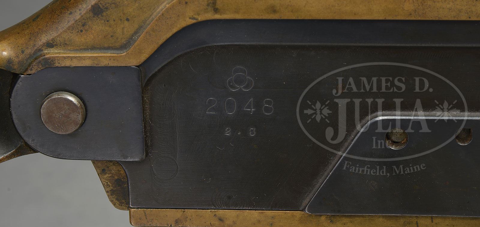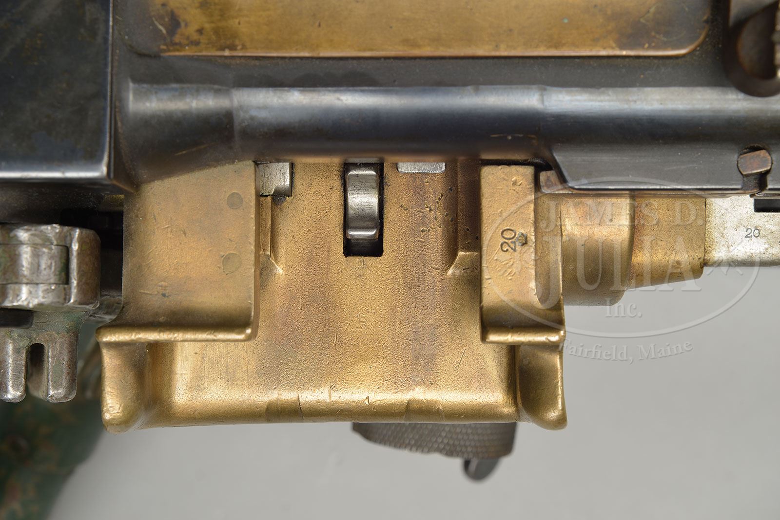 **JAPANESE MODEL 38 HOTCHKISS HEAVY MACHINE GUN (C&R).SN 2048. 6.5 mm Japanese. 31″ bbl. This Japanese Hotchkiss is a copy of model of 1905 with brass hand grip and shoulder extension. Feed shuttle is from a 6.5 Swedish gun and does not have an oiler for cartridges as orig would have had. Charging handle is non matching in SN as is safety lever. Shoulder attachment, hand grip and bbl do match receiver number. Bbl has 7 large cooling flanges. Muzzle without provision for flash hider. Includes standard Japanese type 92 HMG mount SN 136. Markings on receiver indicate gun was manufactured in February, 1908. Mechanism functions smoothly when operated by hand. This weapon appears mechanically functional. PROVENANCE: The class III weapons formerly on loan to Evergreen Aviation & Space Museum. CONDITION: Overall finish and appearance is fine. With about 70% blue finish overall with loss to charging handle, receiver where charging handle rides and gas cylinder as well as high points. Brass parts are a pleasing dark patina with exception of Swedish feed shuttle which is brighter. Gas piston is fine with some slight pitting and discoloration. Gas nut also shows some pitting and discoloration but is completely serviceable. Bore has worn rifling with dark grooves. Bolt face very good with some darkness to edges. Tripod retains about 70% of its green paint, leather boot is intact. Mechanism operates smoothly. This is a scarce and desirable Japanese copy of a classic heavy Hotchkiss. 4-51690 JWK4 (20,000-30,000) – Lot 1023