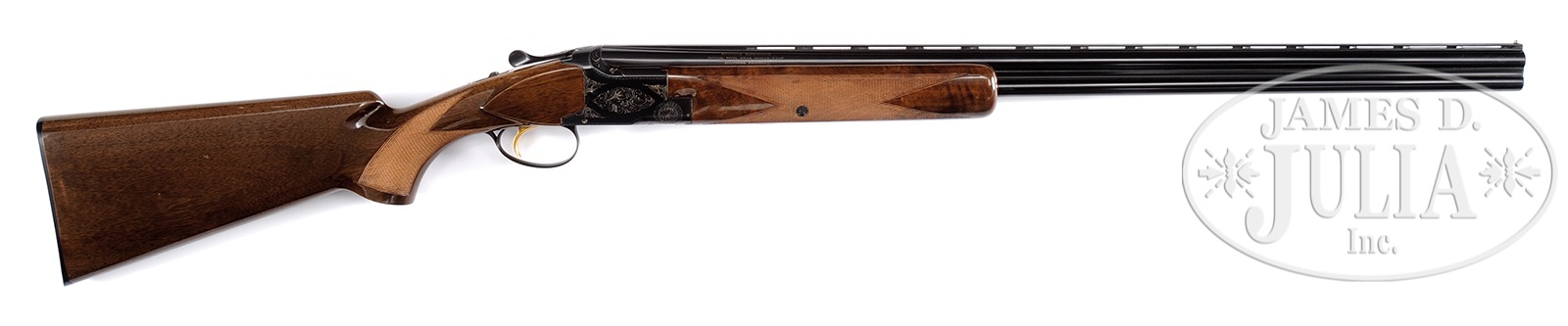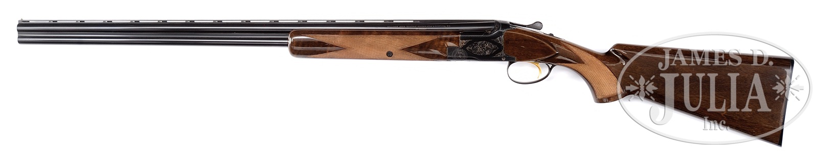 *BROWNING SUPERPOSED GRADE 1 SHOTGUN.SN 3301F71. Cal. 28 ga. 28″ bbl, ventilated rib, 2-3/4″ chambers, chokes marked IC/M. Single bead. Auto ejectors. Standard Grade 1 engraving. Single selective trigger. Stock configuration FKST, rather dark walnut. 2-point checkering pattern. Browning marked buttplate. LOP 14-1/4″. Non-auto safety. CONDITION: Very good. Bbls retain virtually all factory blue & appear to be outstanding. Minor handling wear. Extremely minor oxidation on forend iron. Receiver with a vast majority of its original blue finish with edge wear and minor spots of oxidation. Engraving filled with light colored highlight. Wood retains nearly all factory finish with a handful of very tiny dings. Checkered areas bright. Tight gun, crisp mechanics. Strong ejectors. This is an exceptional small bore Browning! 50179-18 (4,000-6,000) – Lot 1023