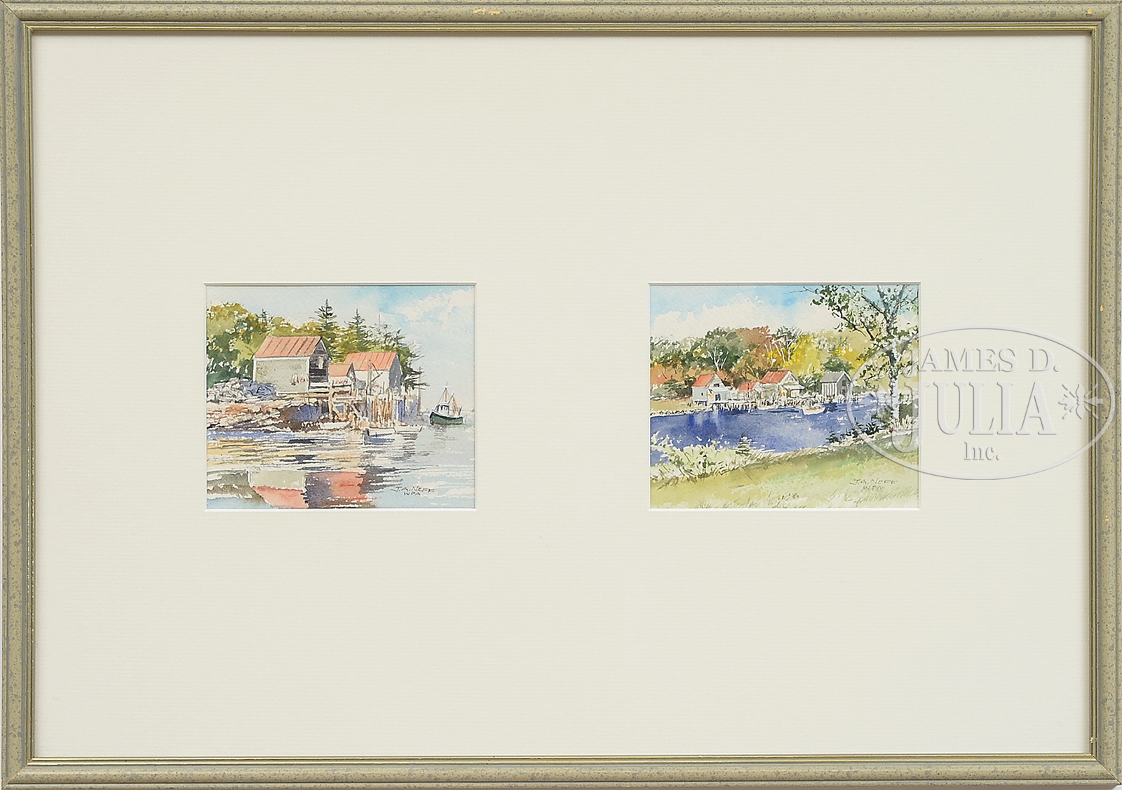 JOHN A NEFF (American, 1926- ) SIX WORKS: “BACK COVE” (2), “PEMAQUID POINT LIGHT”, “LOBSTER FLOAT”, “MORNING CHAT”, “LOW TIDE”.Watercolors on paper Four in identical silver metal frames, the double in a decorative wood frame All signed lower right “J.A. Neff, WPA” A WPA (Whisky Painters of America) label to reverse of each with title and artist SIZE: Sight 4″ x 5″ each. Overall: four 10-+1/4″ X 12-1/4″, one 14-1/2″ x 20-3/4″. PROVENANCE: From a Maine/Texas Collection CONDITION: Very good. 51398-52 (500-1,000) – Lot 1023