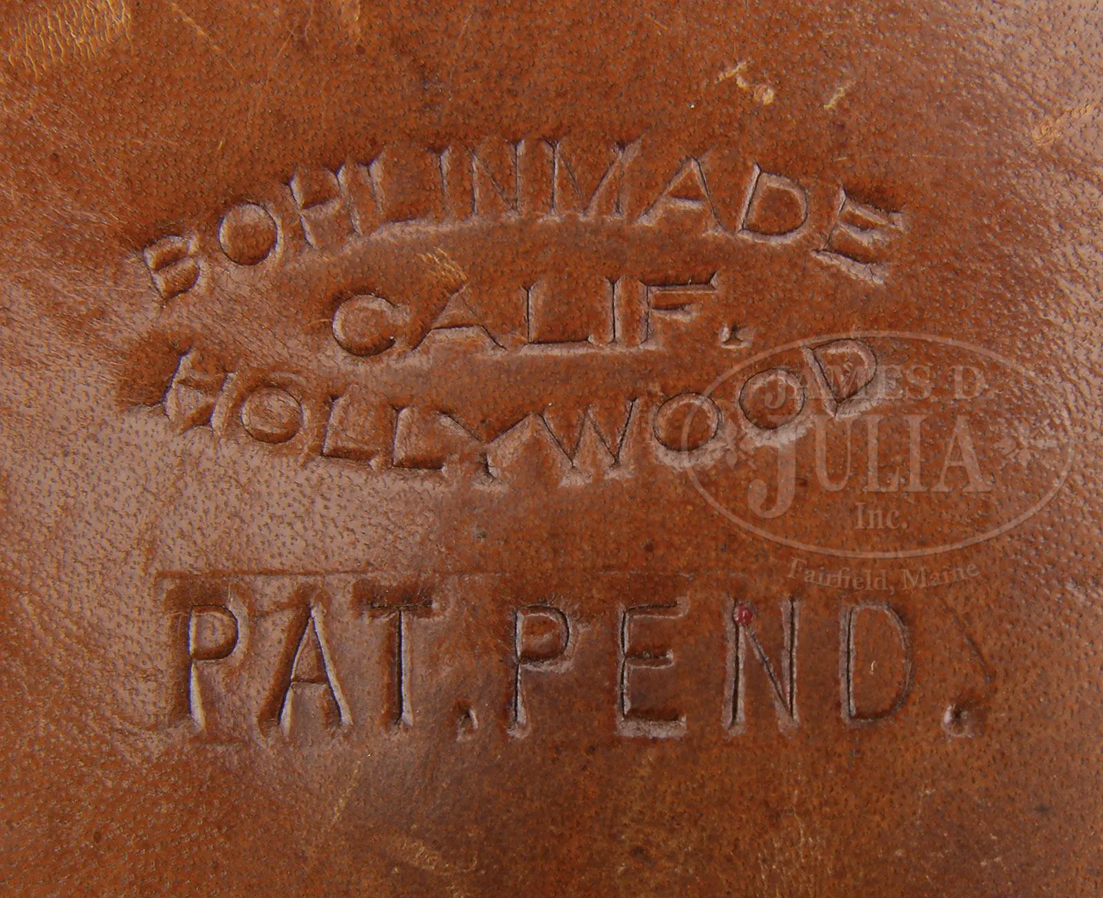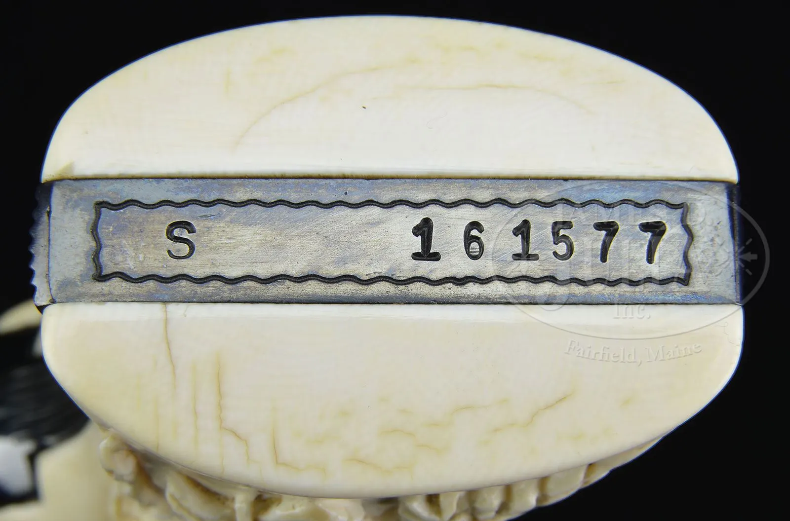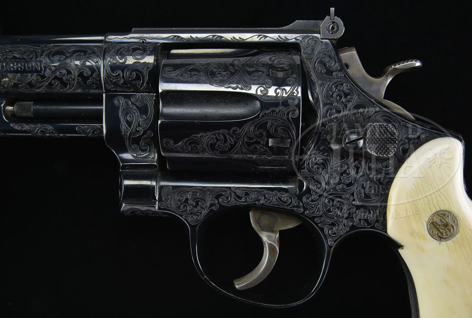 SN S161577. Cal. .44 Magnum. Blue finish with 4″ ribbed bbl, red ramp front & white outline adjustable rear sight. It has semi-target trigger & target hammer. Mounted with 2-pc pre-ban Africa ivory Smith & Wesson Magna-sized grips with gold “S&W” trademark medallions. Right grip has a deep relief carved American eagle & left grip is mounted with a 7/8″ x 7/8″ gold shield engraved “PRESENTED TO / Elmer Keith / BY / Carl R. Hellstrom” with some light engraved decorations. Revolver is beautifully engraved by George Dallas in fine foliate & floral arabesque patterns without background or shading. Engraving is virtually full coverage over the revolver with blank counterpoint panels artistically placed on the bbl, ejector housing & frame. Flutes of the cyl are also without engraving. Right sideplate is engraved in script, “Elmer M. Keith”, a facsimile of Mr. Keith’s signature. Left side of backstrap, under the grip is engraved “ENGRAVED BY GEORGE S. DALLAS”. Left heel of frame is marked with a small diamond and a “B” which indicates factory restored blue finish and left toe is marked “8 59″ which indicates the work was accomplished in August of 1959. This revolver will letter from Smith & Wesson as having been shipped November 20, 1956 directly to Elmer Keith with 4” bbl and blue finish, on advertising account at no charge. A copy of this document accompanies this revolver. Accompanied by a beautiful, hand-tooled stiff brown leather belt holster of Mr. Keith’s design, made by the famous Bohlin Co. of Hollywood, CA and so marked on rear face of skirt. Mr. Keith’s design incorporates a thumb strap for the revolver spur attached to a coil spring to maintain tension but still be releasable very quickly. Body of the holster has a matching tooled, narrow leather strap with Bohlin marked silver buckle set that is also beautifully engraved. Back of the holster is marked “Pat Pend.” Accompanied by a reproduced page from one of Mr. Keith’s articles which pictures him shooting a 4″ .44 Magnum Model 29, which is probably this revolver. Also accompanied by a copy of p. 20 of the October, 1959 issue of The American Legion Magazine which depicts Mr. Keith holding two short-barreled .44 Magnums, one of which is probably this revolver. Special Note: This item contains or is made of ivory. Do not bid on this lot unless you have read and agreed to our “Ivory Position Statement” and the “Waiver of Legal and Financial Risk to James D. Julia in regards to your Purchase of an Ivory Object”. This information is located in our catalog on pages 30 and 31. PROVENANCE: The Elmer Keith Estate Collection. CONDITION: Extremely fine. Overall retains 97-98% glossy Smith & Wesson blue showing very little use. Trigger & hammer retain strong case colors. Grips are sound with some minor age lines with good detail in the carved eagle, and overall shows very light wear with a fine light patina. Mechanics are crisp with a wonderful tuned action; bright shiny bore. Holster shows light wear & retains about all of its orig Bohlin finish. 4-47980 JR236 (15,000-25,000) – Lot 1024