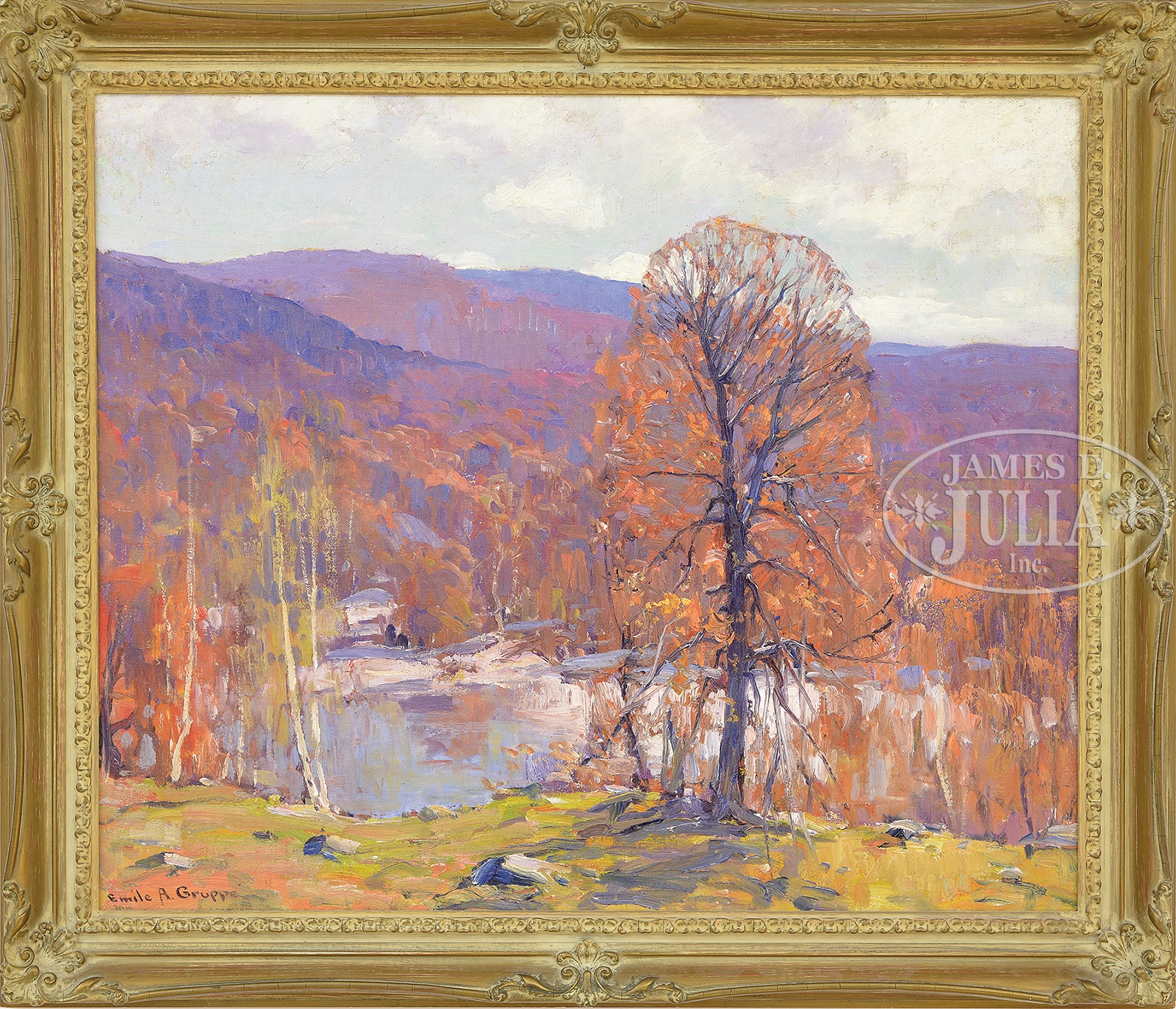 EMILE A. GRUPPE (American, 1896-1978) “AUTUMN IN VERMONT”.Oil in canvas Housed in a contemporary gold painted wood frame Signed lower left “Emile A. Gruppe” Inscribed on verso canvas “Fall” Bears Clark Galleries label on verso, dated circa 1930 SIZE: 25″ x 30″. Overall: 30-1/2″ x 35-1/2″ PROVENANCE: From a private Boston area collector. Acquired from Clark Galleries, Stowe, Vermont, 2004 CONDITION: Overall very good, with scattered touch up throughout sky and mountain range 9-96737 (6,000-8,000) – Lot 1024